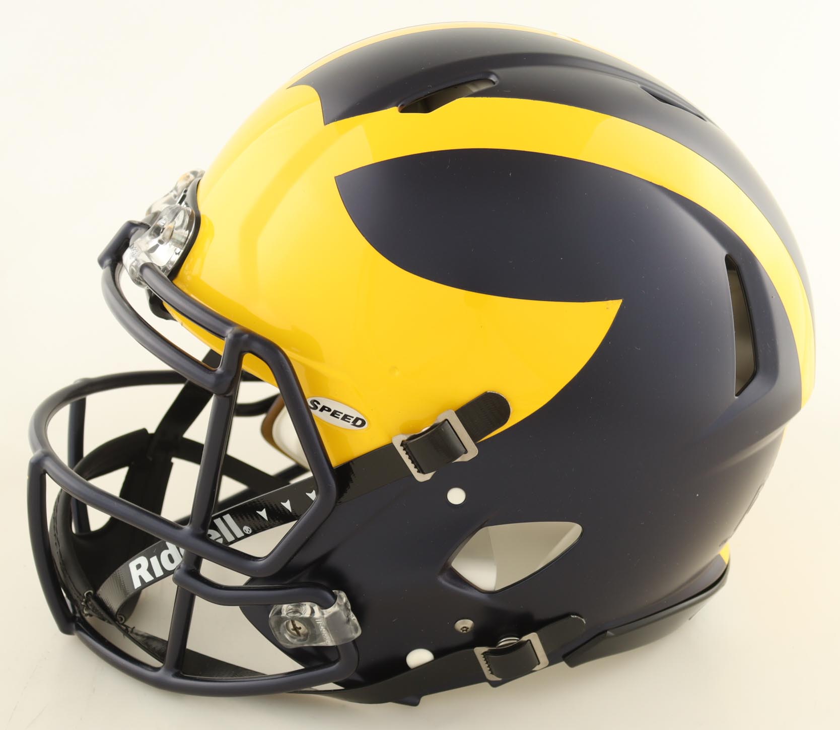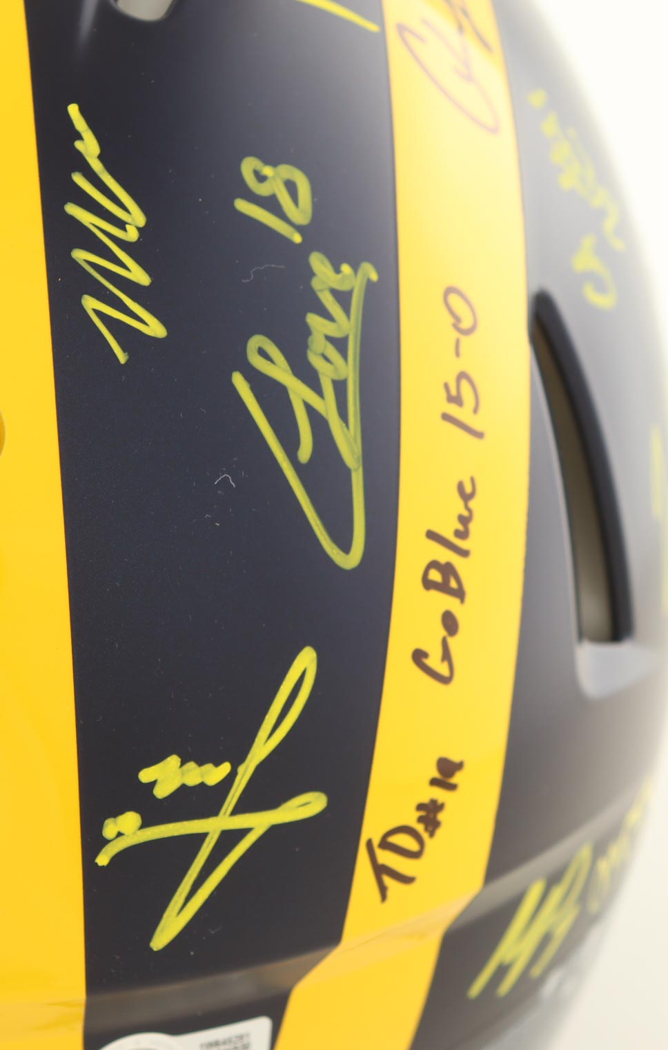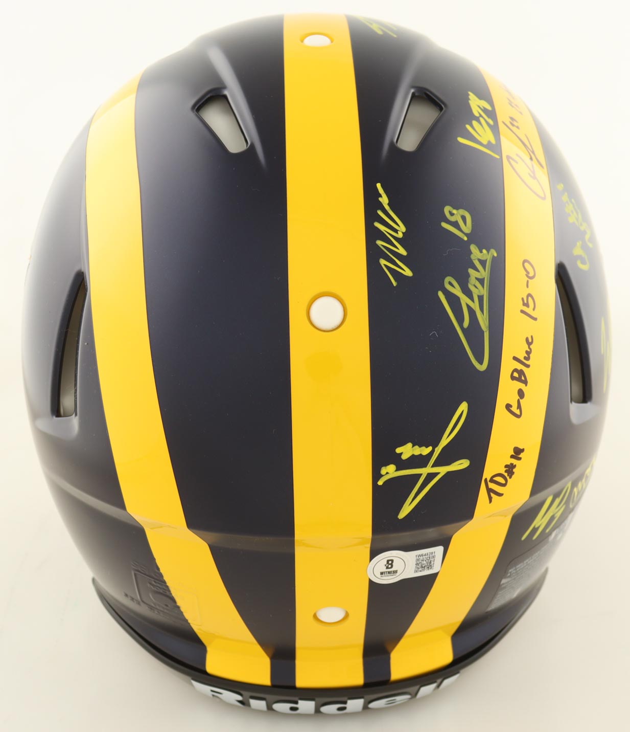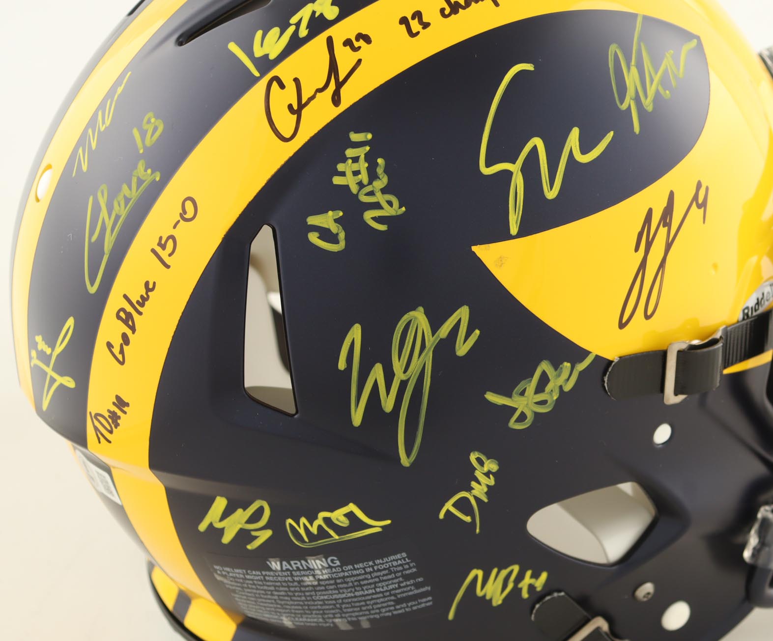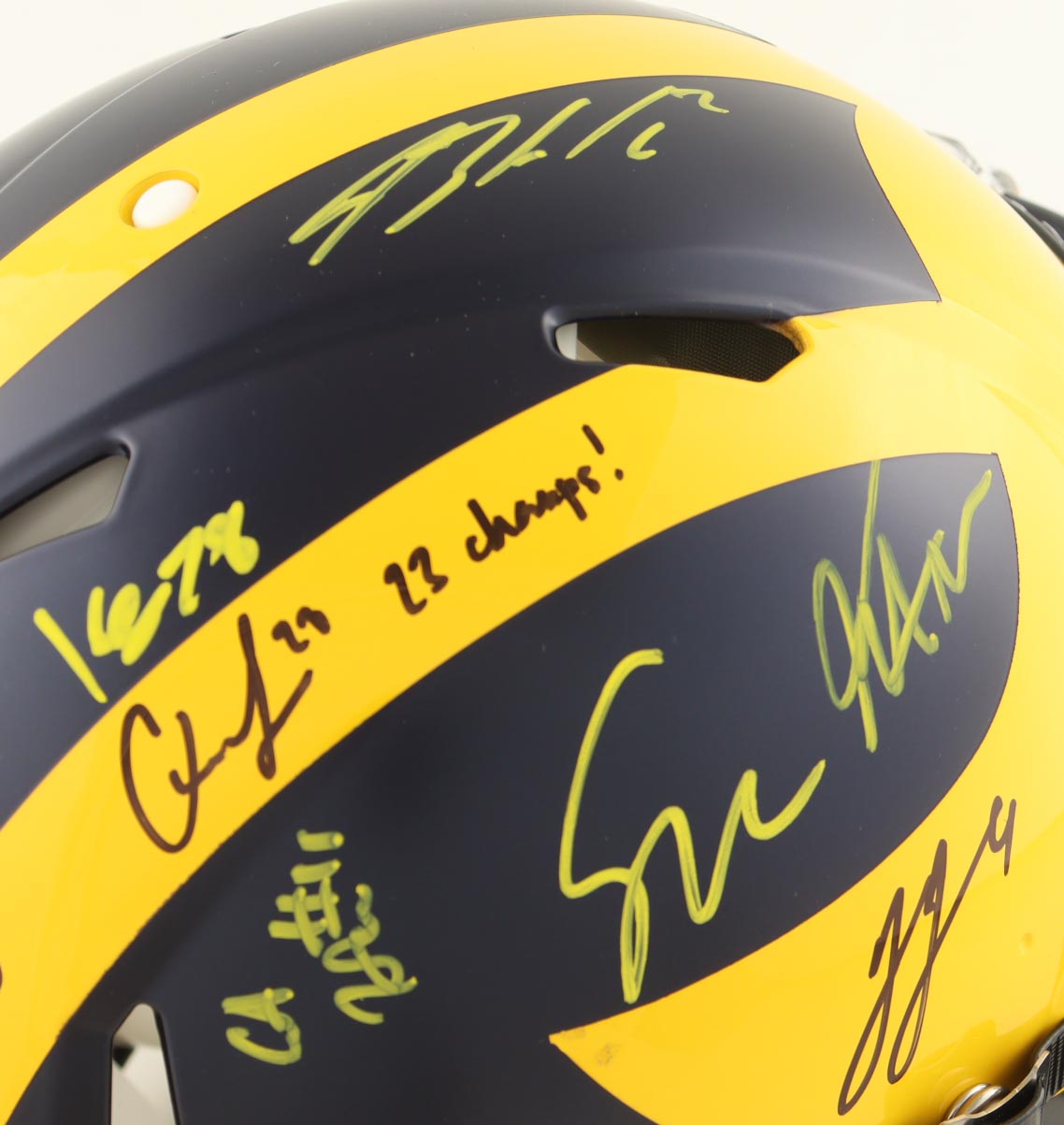 Riddell Michigan Wolverines full-size Authentic On-Field Speed helmet. Hand-signed and inscribed by (17) members of the 2023 Michigan Wolverines National Championship team. Signers include J.J. McCarthy, Max Bredeson, Mike Sainristil, Colston Loveland, Will Johnson, Mason Graham, Derrick Moore, Semaj Morgan, Makari Paige, Myles Hinton, Kalel Mullings, Kenneth Grant, Josiah Stewart, Ernest Huusmann, Blake Corum, Quentin Johnson and Tommy Doman.
