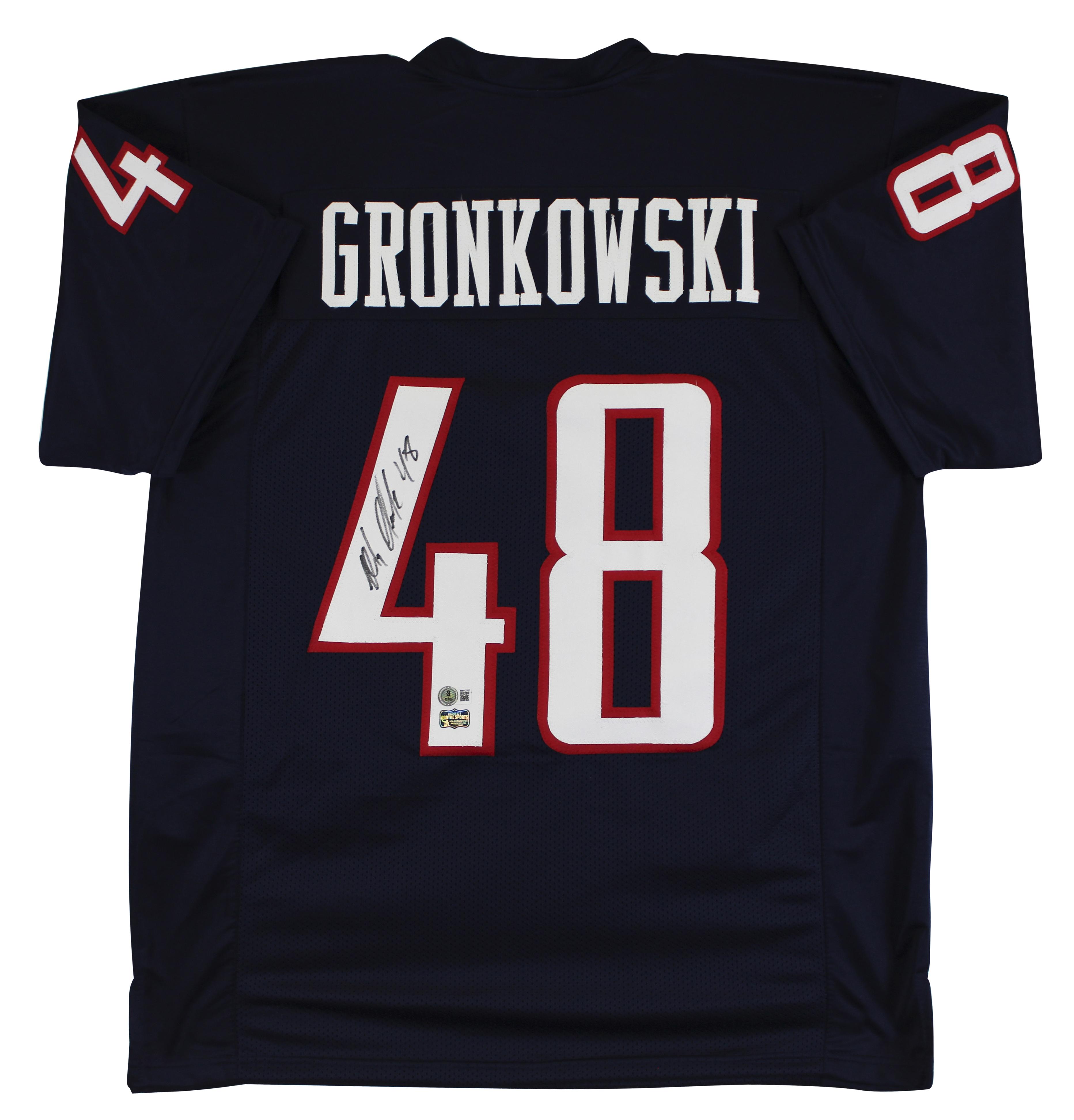 Custom style jersey with everything sewn on, size XL. Hand-signed by Rob Gronkowski.
