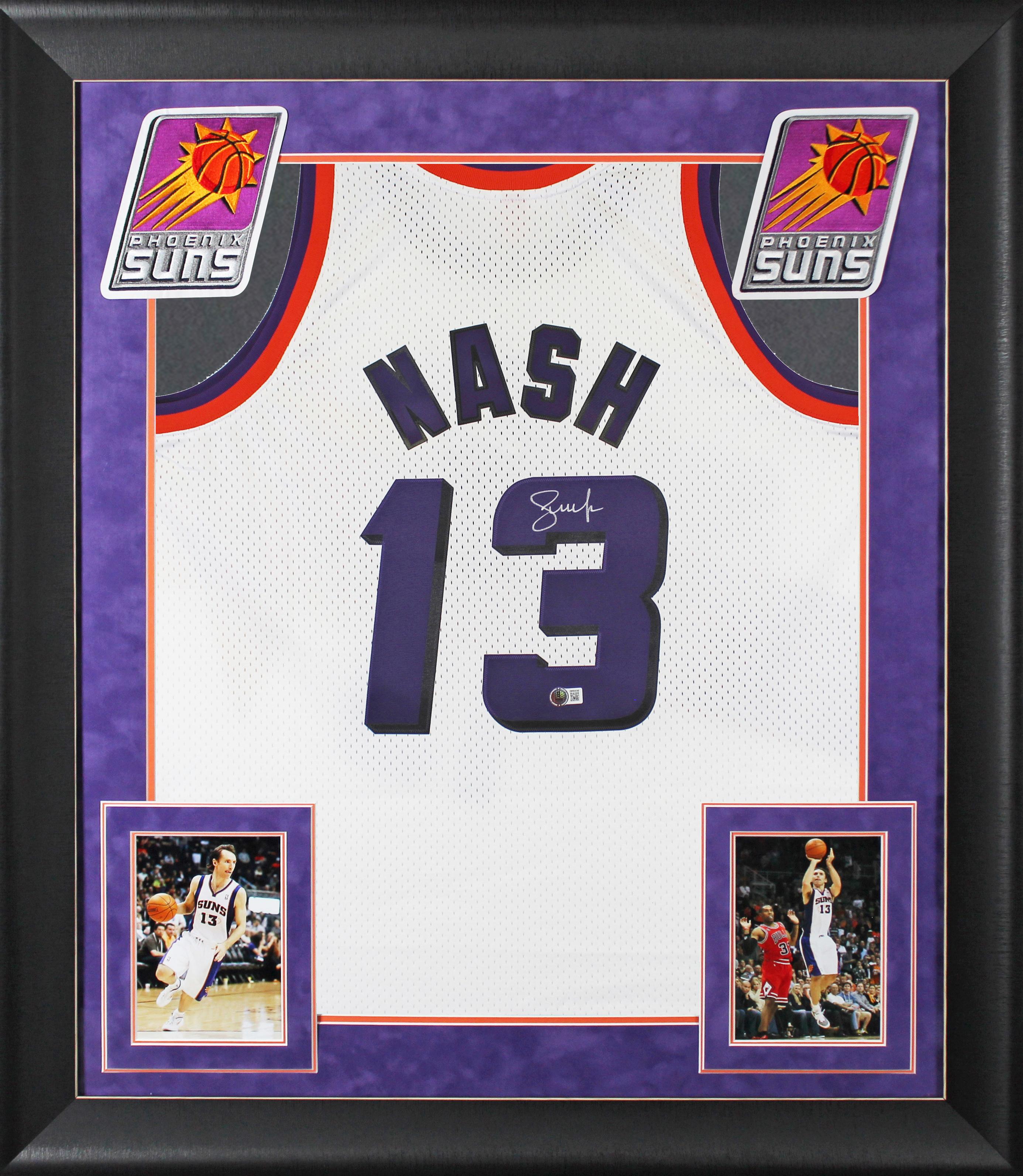 Custom frame measures 32" x 37” in size and features a Mitchell & Ness jersey that has been hand-signed by Steve Nash (Phoenix Suns, HOF).