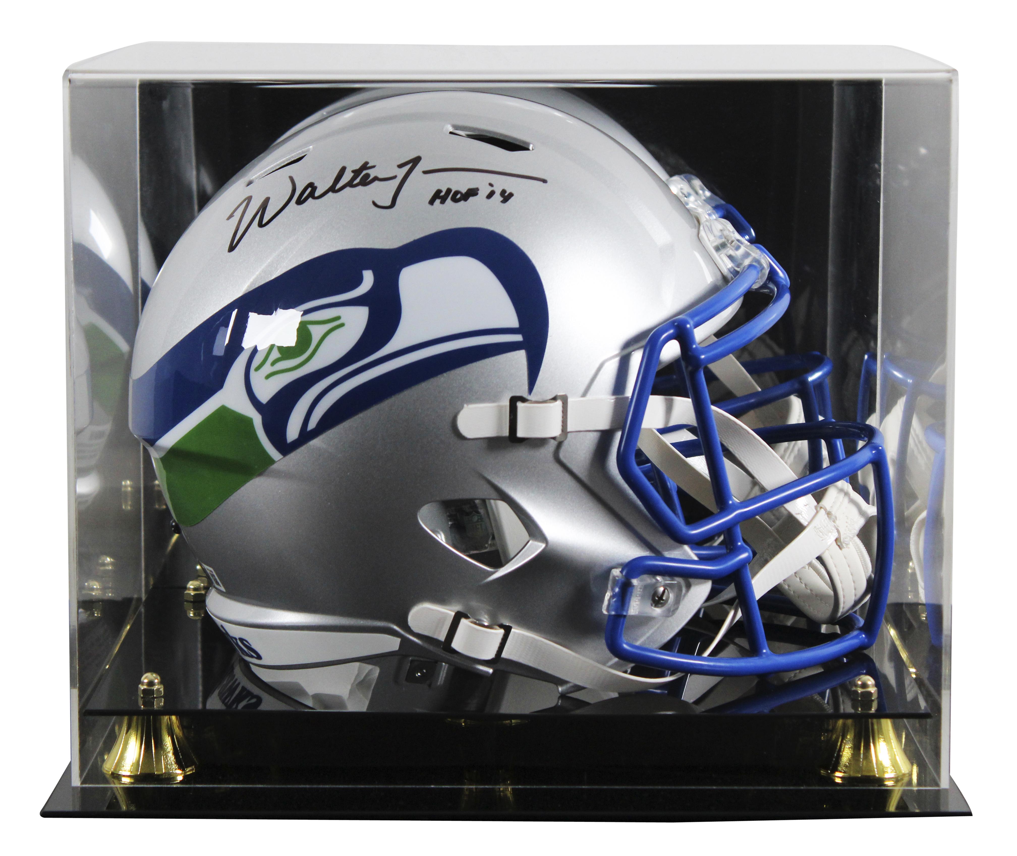 Riddell Seattle Seahawks full-size speed replica helmet. Hand-signed and inscribed by Walter Jones (HOF). Display case is included as shown.