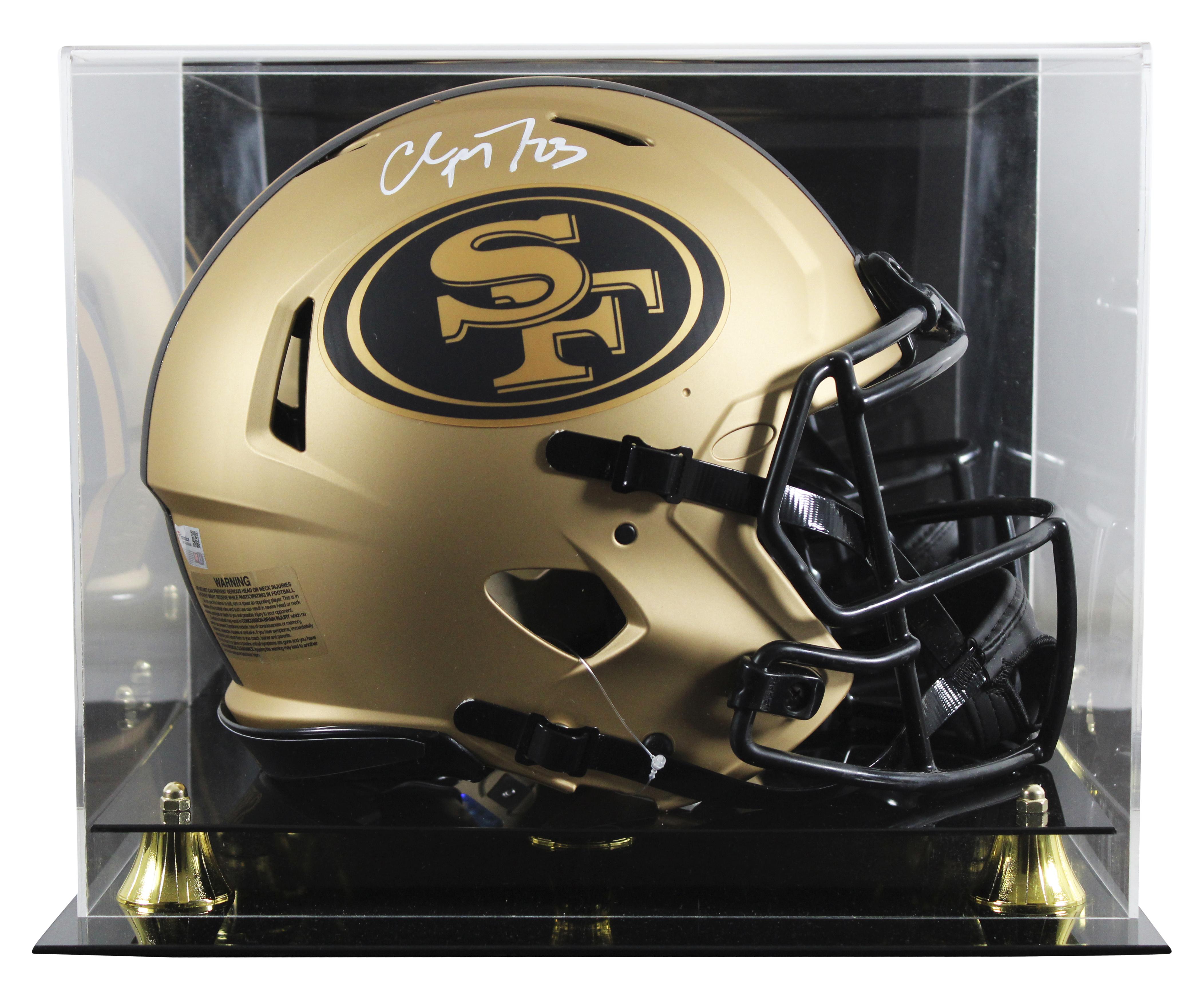 Riddell San Francisco 49ers full-size authentic on-field rave alternate speed helmet. Hand-signed by Christian McCaffrey. Display case is included as shown.