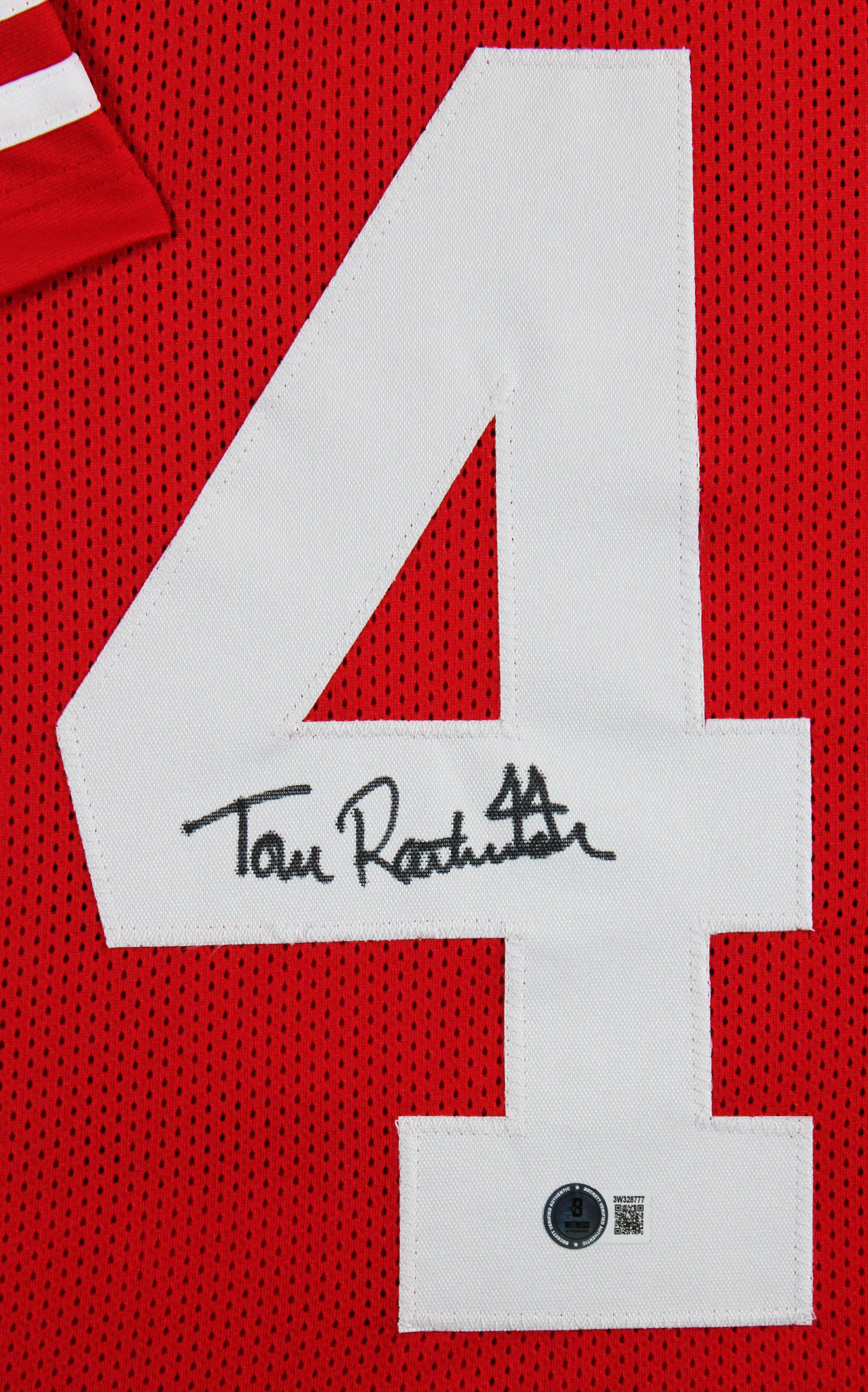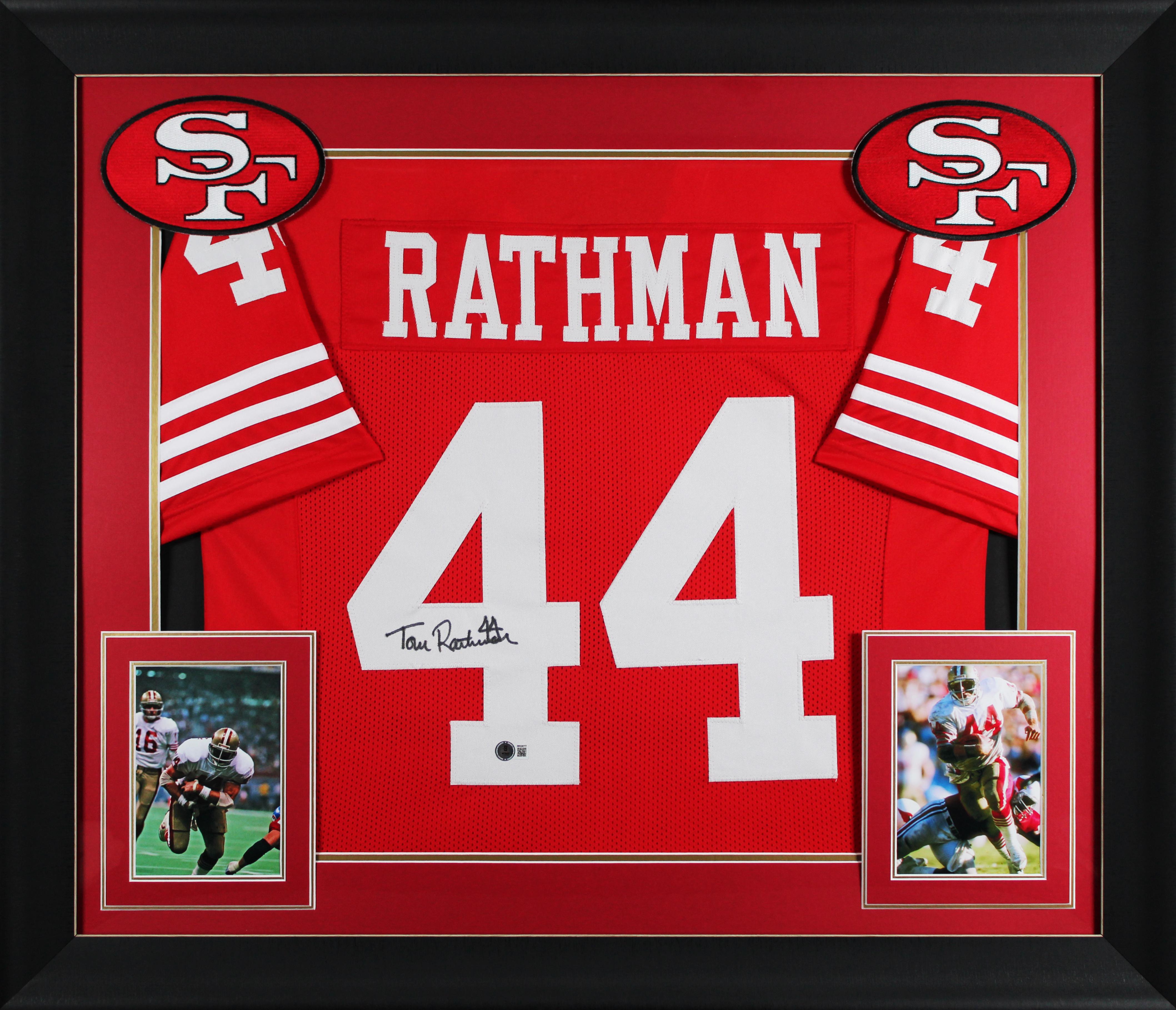 Custom frame measures 32" x 37” in size and features a jersey that has been hand-signed by Tom Rathman.