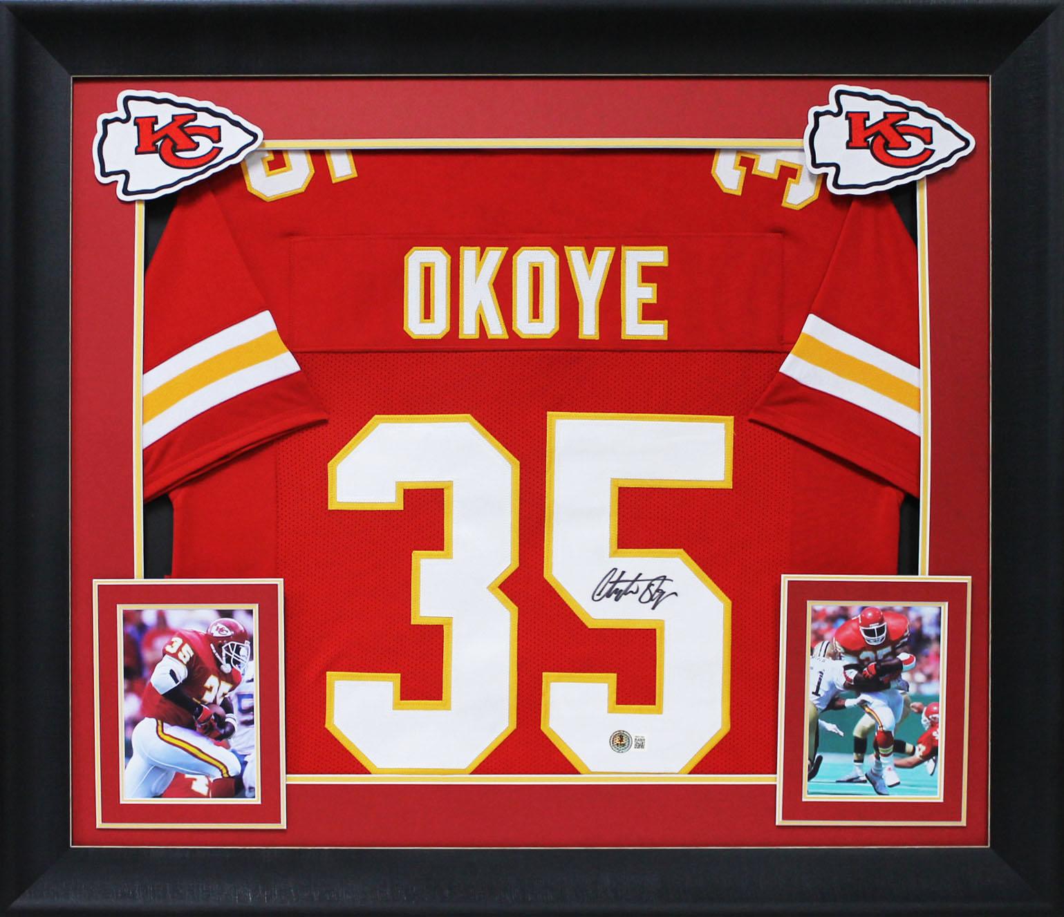 Custom frame measures 32" x 37” in size and features a jersey that has been hand-signed by Christian Okoye.