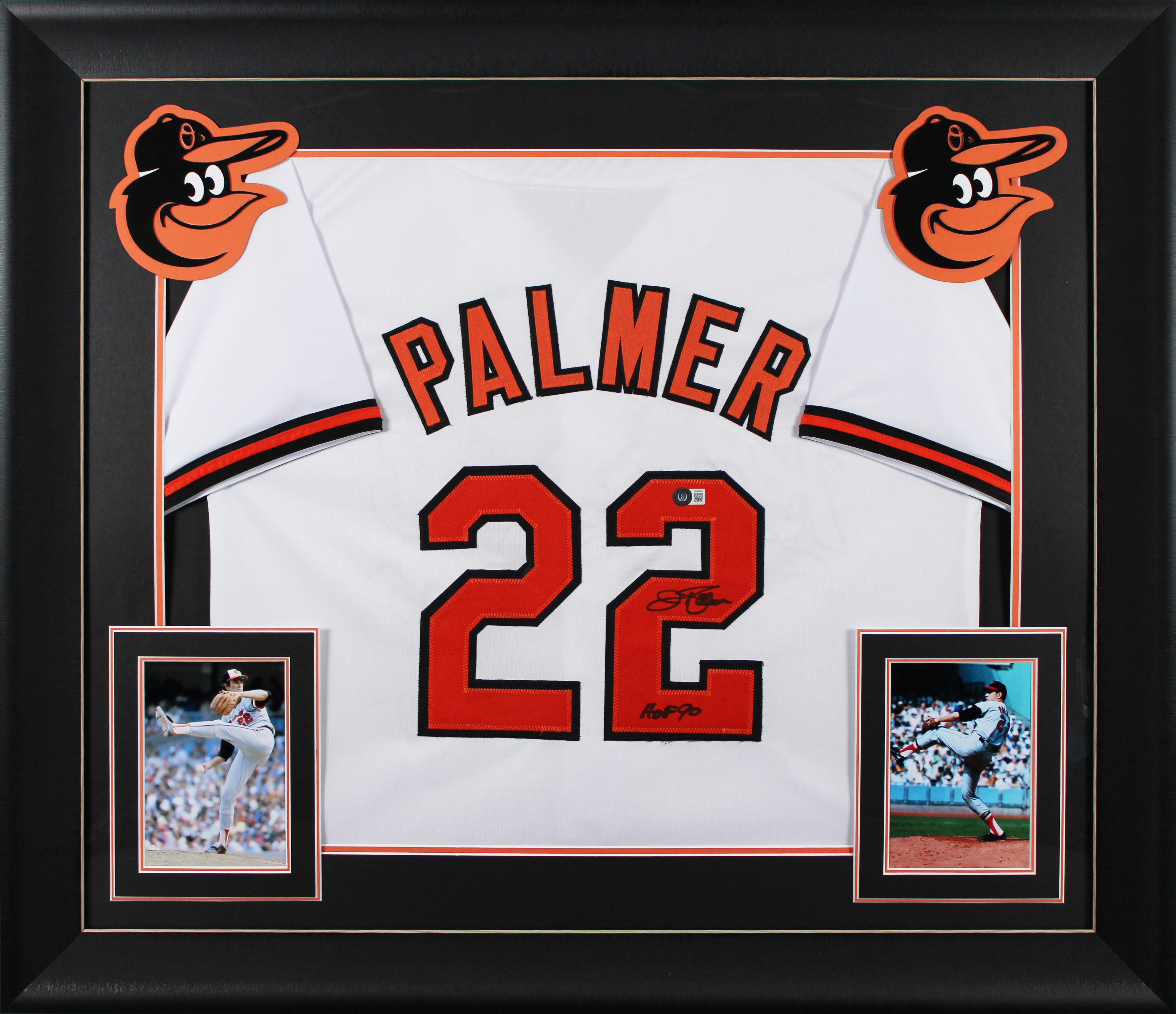 Custom frame measures 32" x 37” in size and features a jersey that has been hand-signed and inscribed by Jim Palmer (HOF).