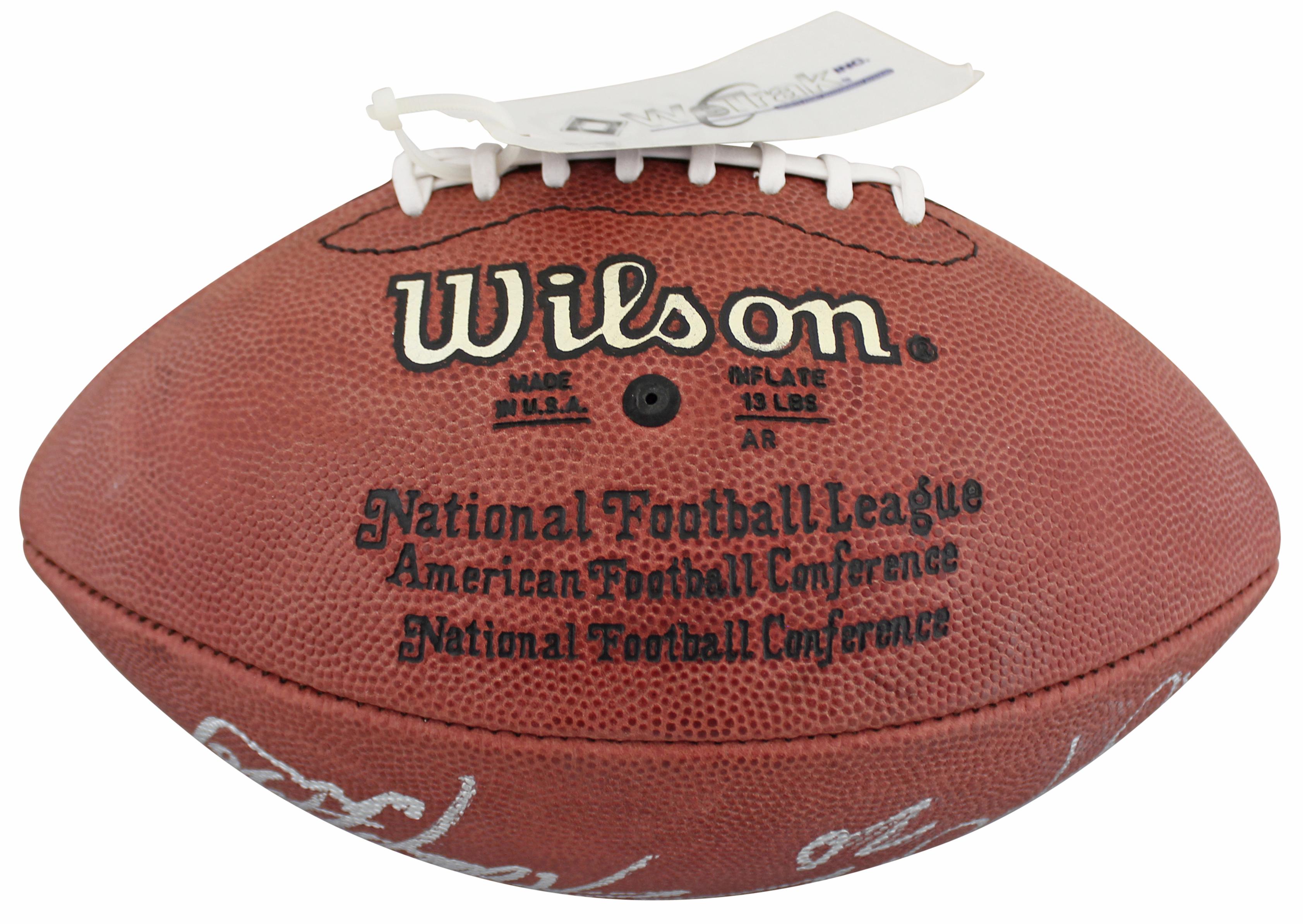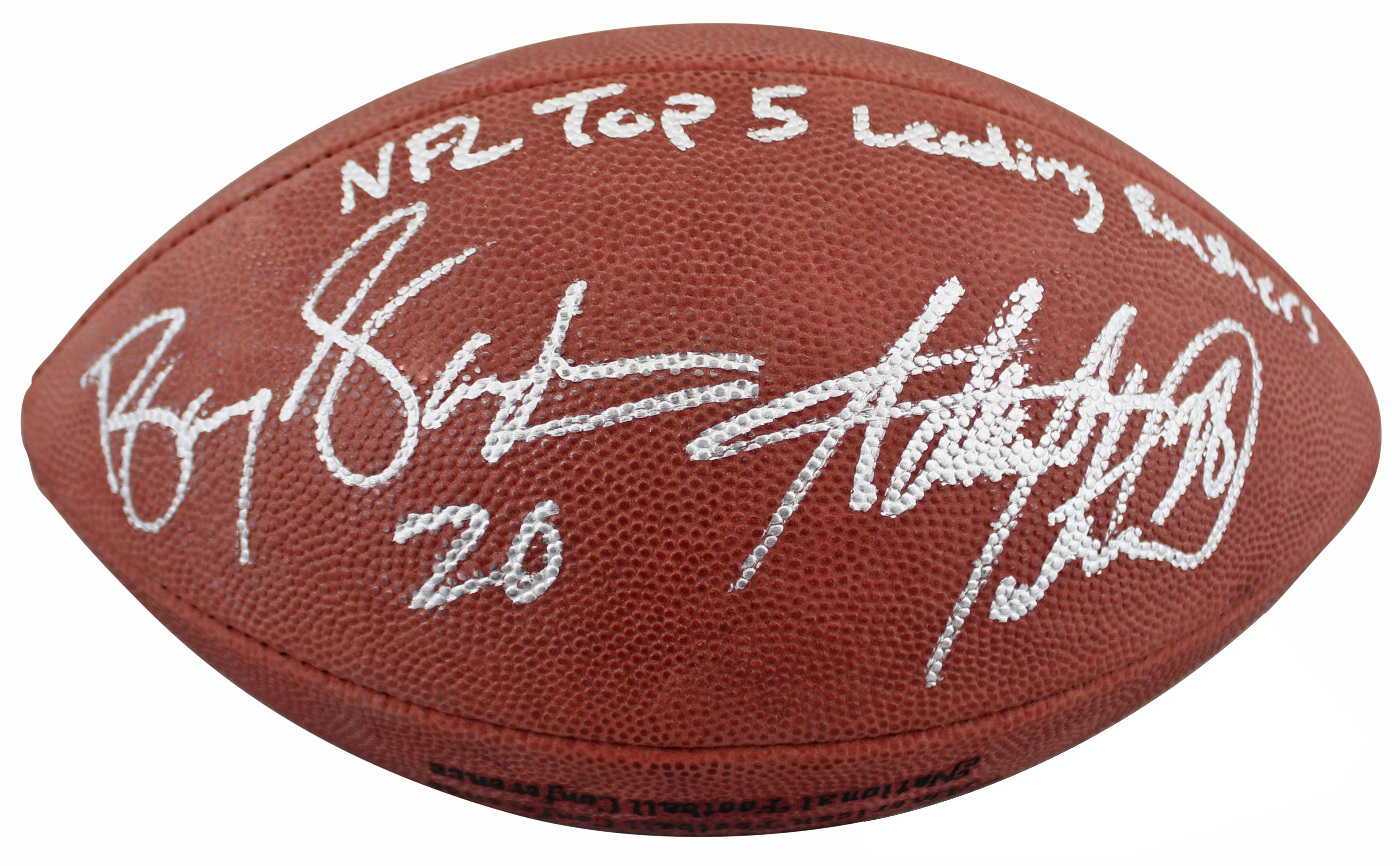 Wilson Official NFL football has been hand-signed by Walter Payton (D. 1999, Chicago Bears, HOF), Emmitt Smith (Dallas Cowboys, HOF), Barry Sanders (Detroit Lions, HOF), Frank Gore (San Francisco 49ers) and Adrian Peterson (Minnesota Vikings).