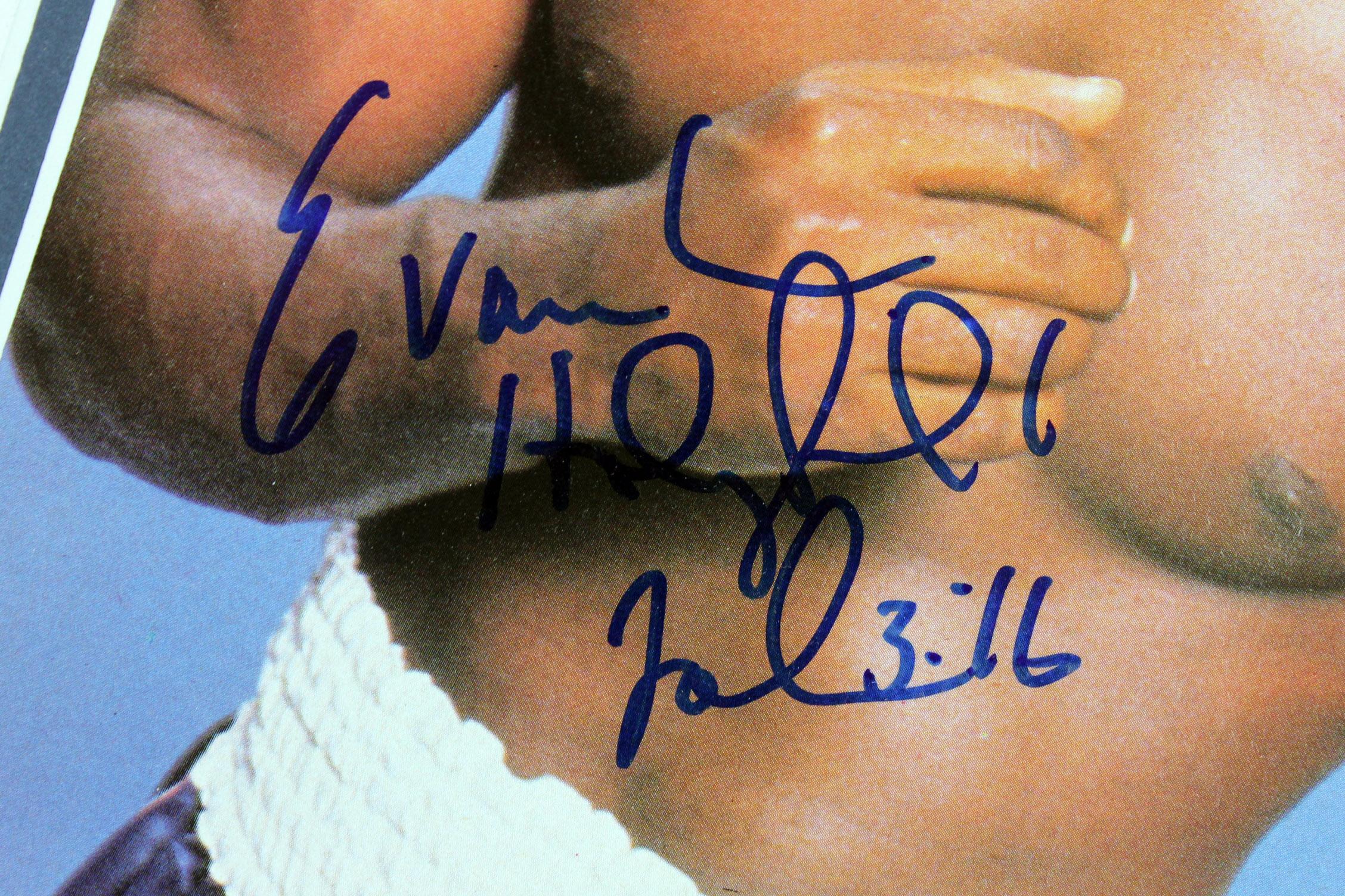 Custom matting measures 11" x 14" in size and features a magazine page that has been hand-signed by Evander Holyfield (HOF).