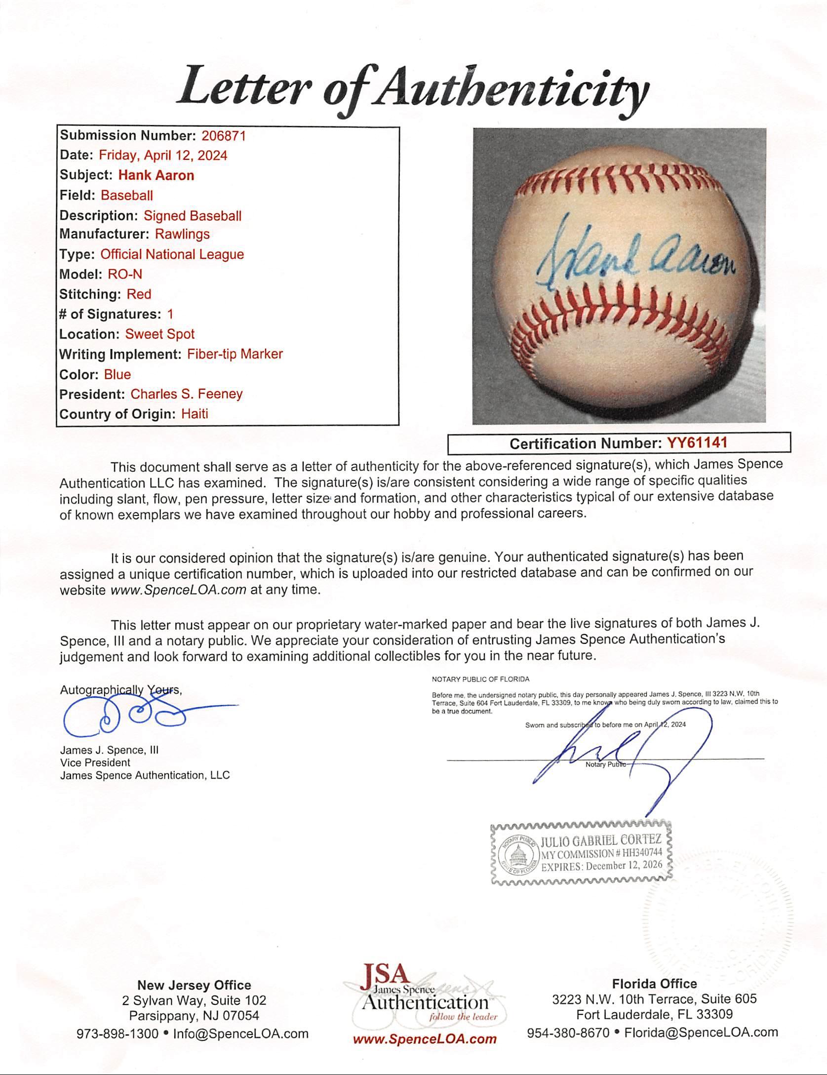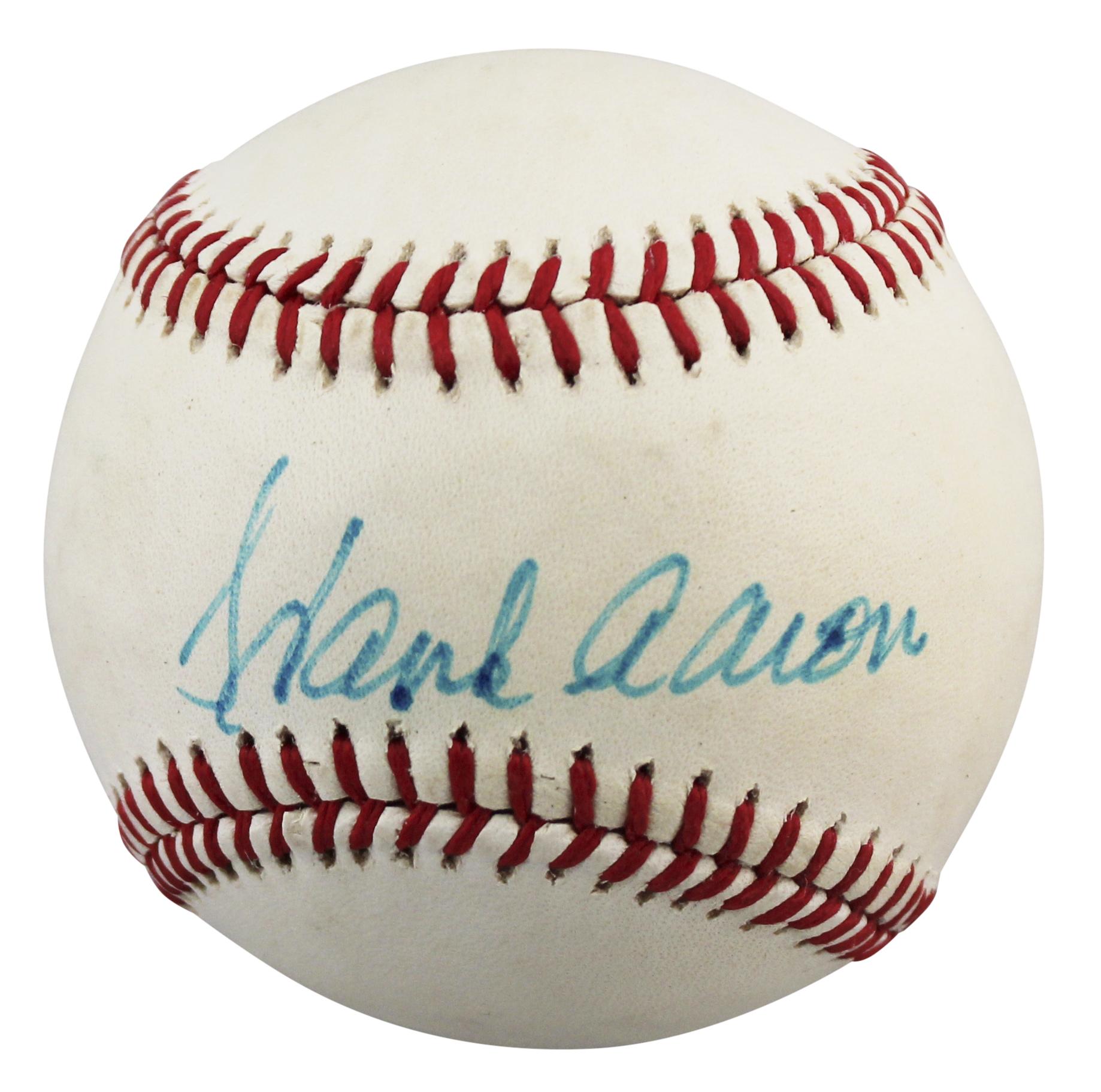Rawlings Official National League baseball has been hand-signed by Hank Aaron (D. 2021, Milwaukee Braves, HOF).