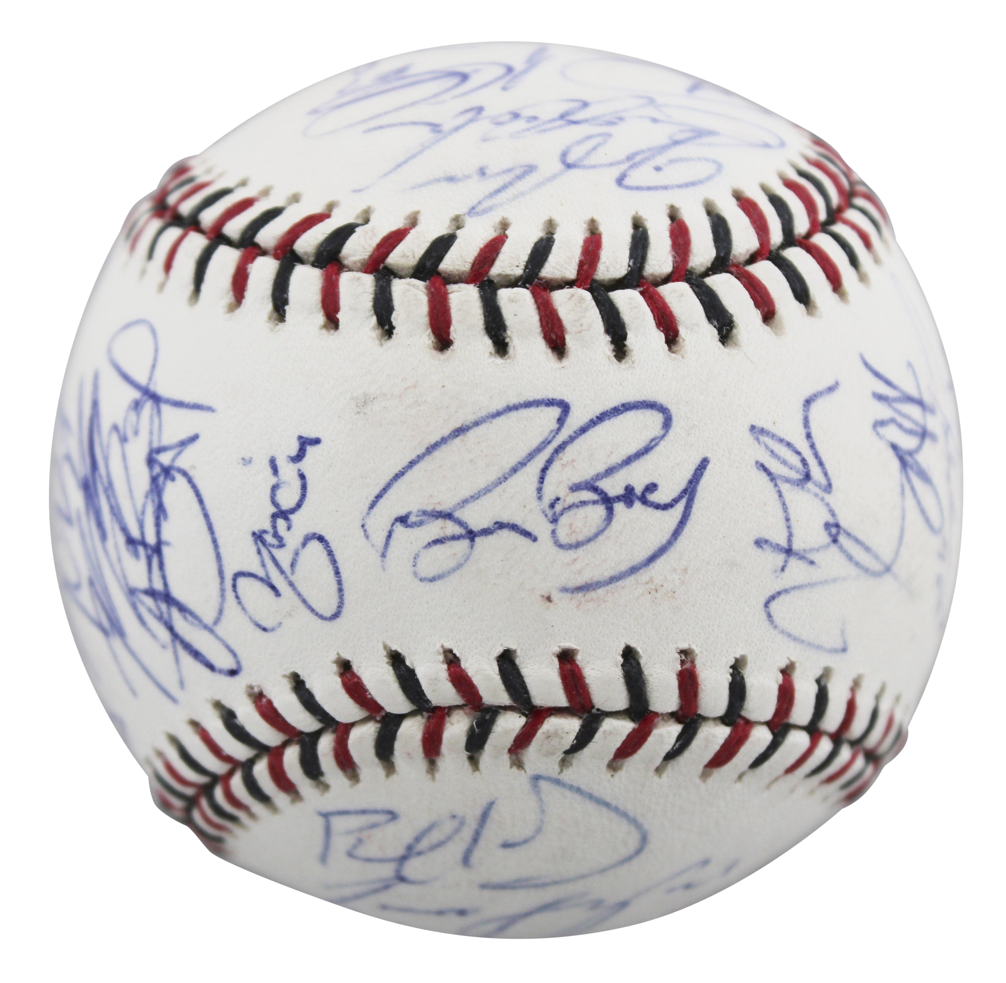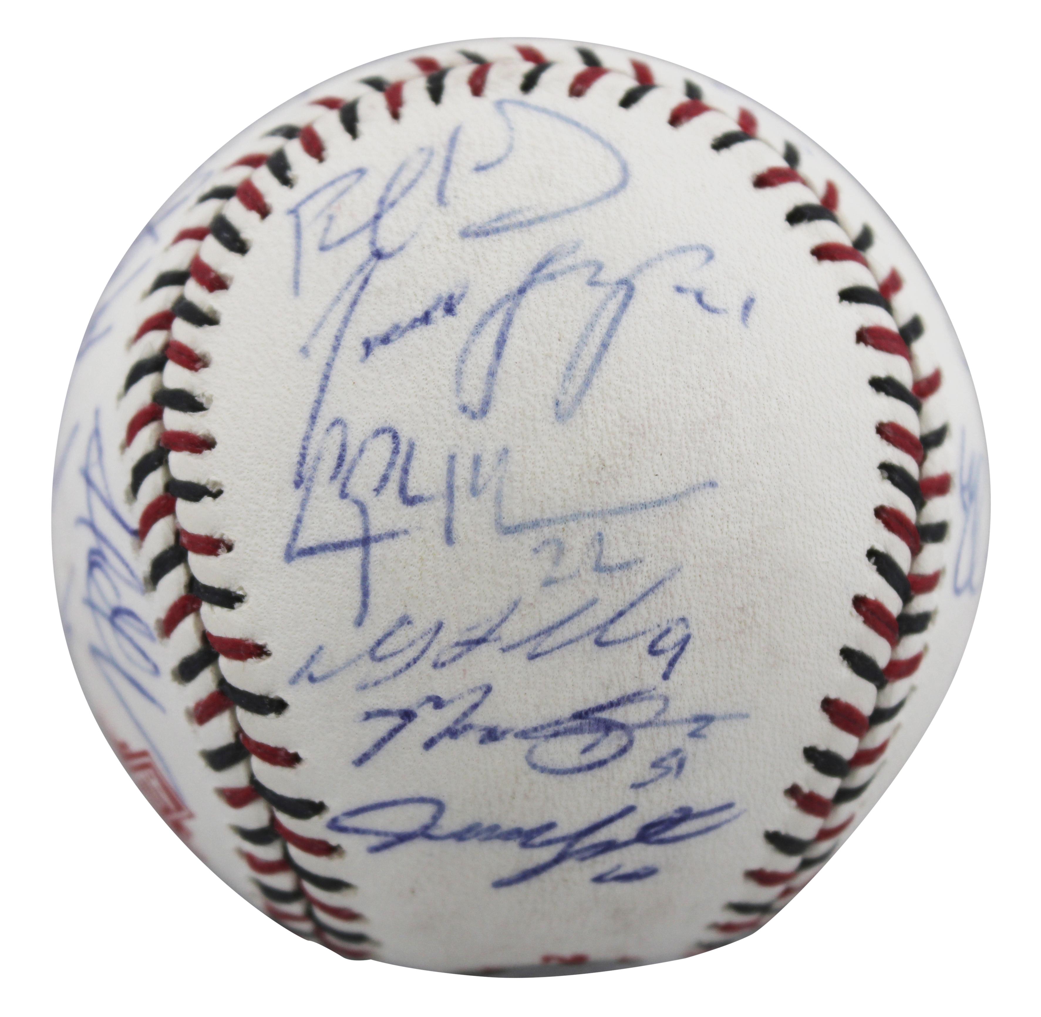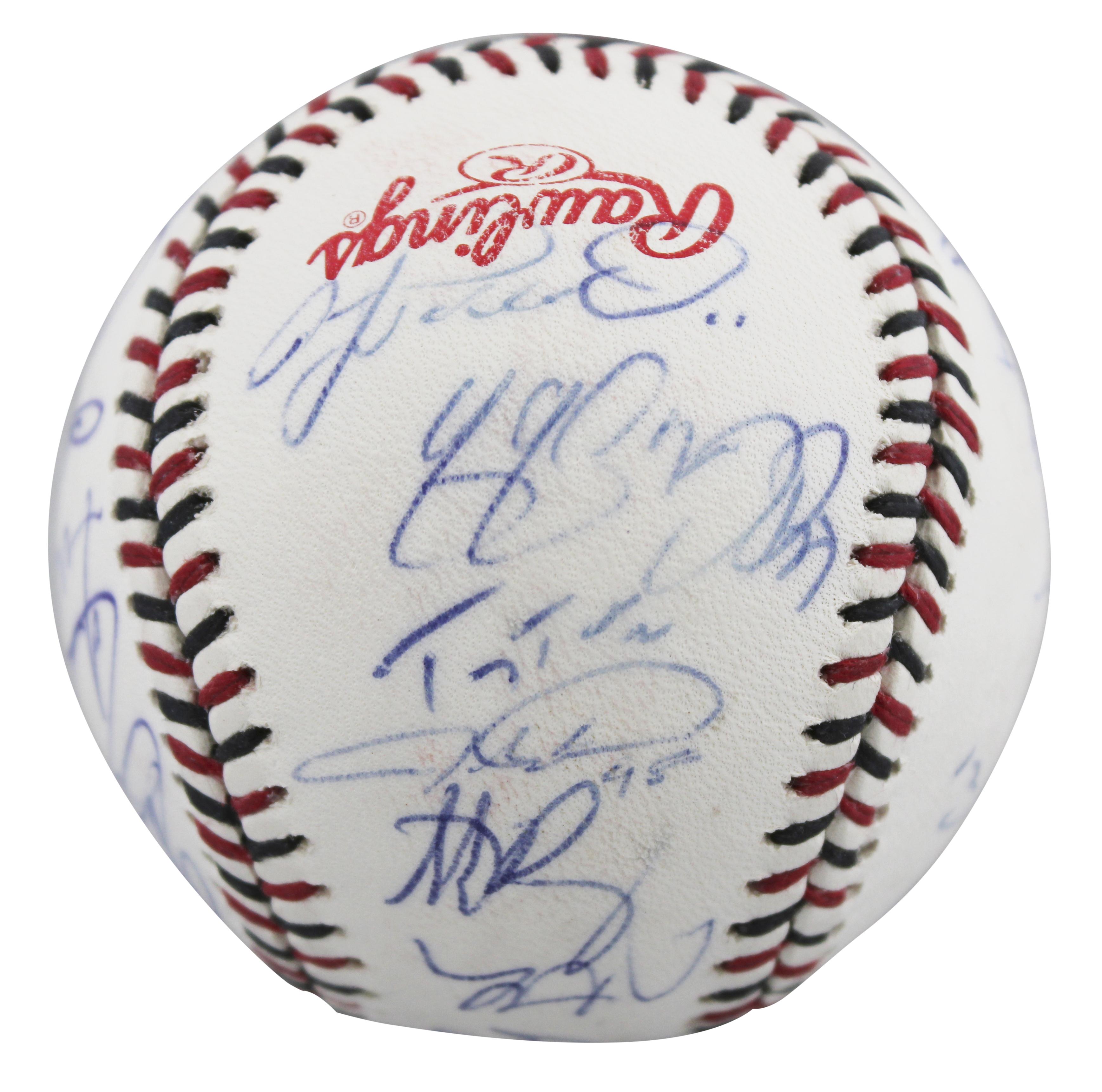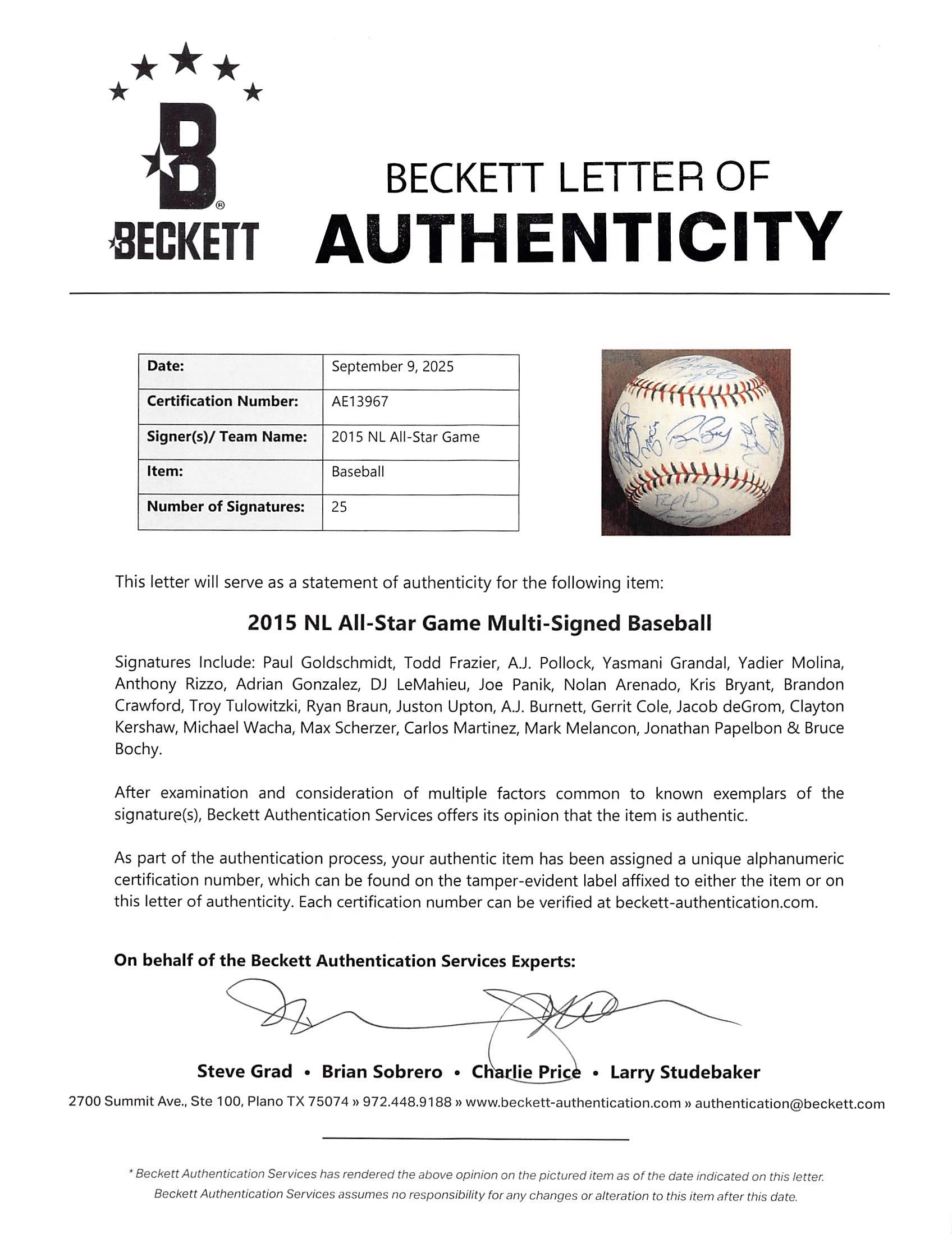 Rawlings Official 2015 All-Star Game Logo baseball has been hand-signed by Paul Goldschmidt, Todd Frazier, A.J. Pollock, Yasmani Grandal, Yadier Molina, Anthony Rizzo, Adrian Gonzalez, DJ LeMahieu, Joe Panik, Nolan Arenado, Kris Bryant, Brandon Crawford, Troy Tulowitzki, Ryan Braun, Juston Upton, A.J. Burnett, Gerrit Cole, Jacob deGrom, Clayton Kershaw, Michael Wacha, Max Scherzer, Carlos Martinez, Mark Melancon, Jonathan Papelbon and Bruce Bochy.