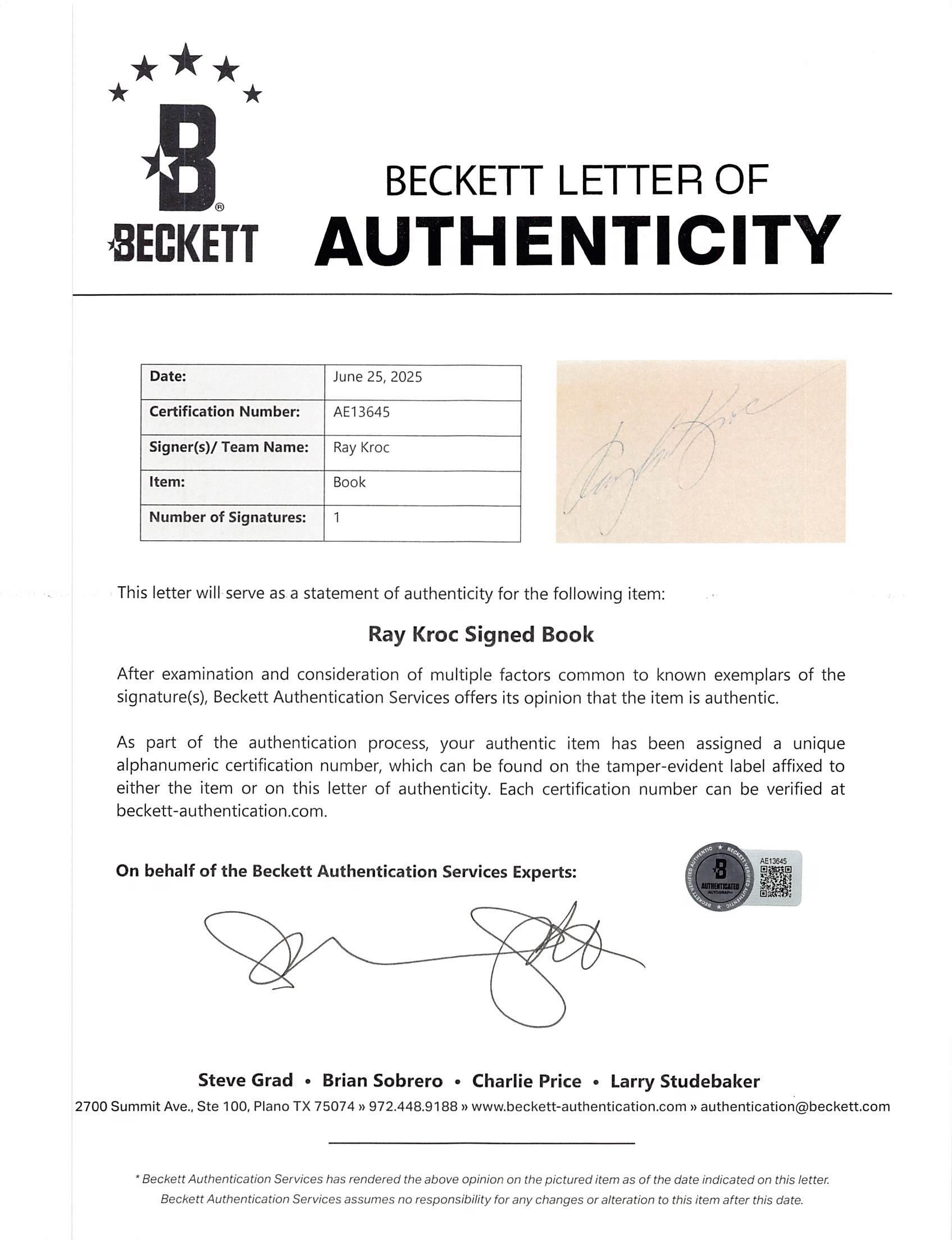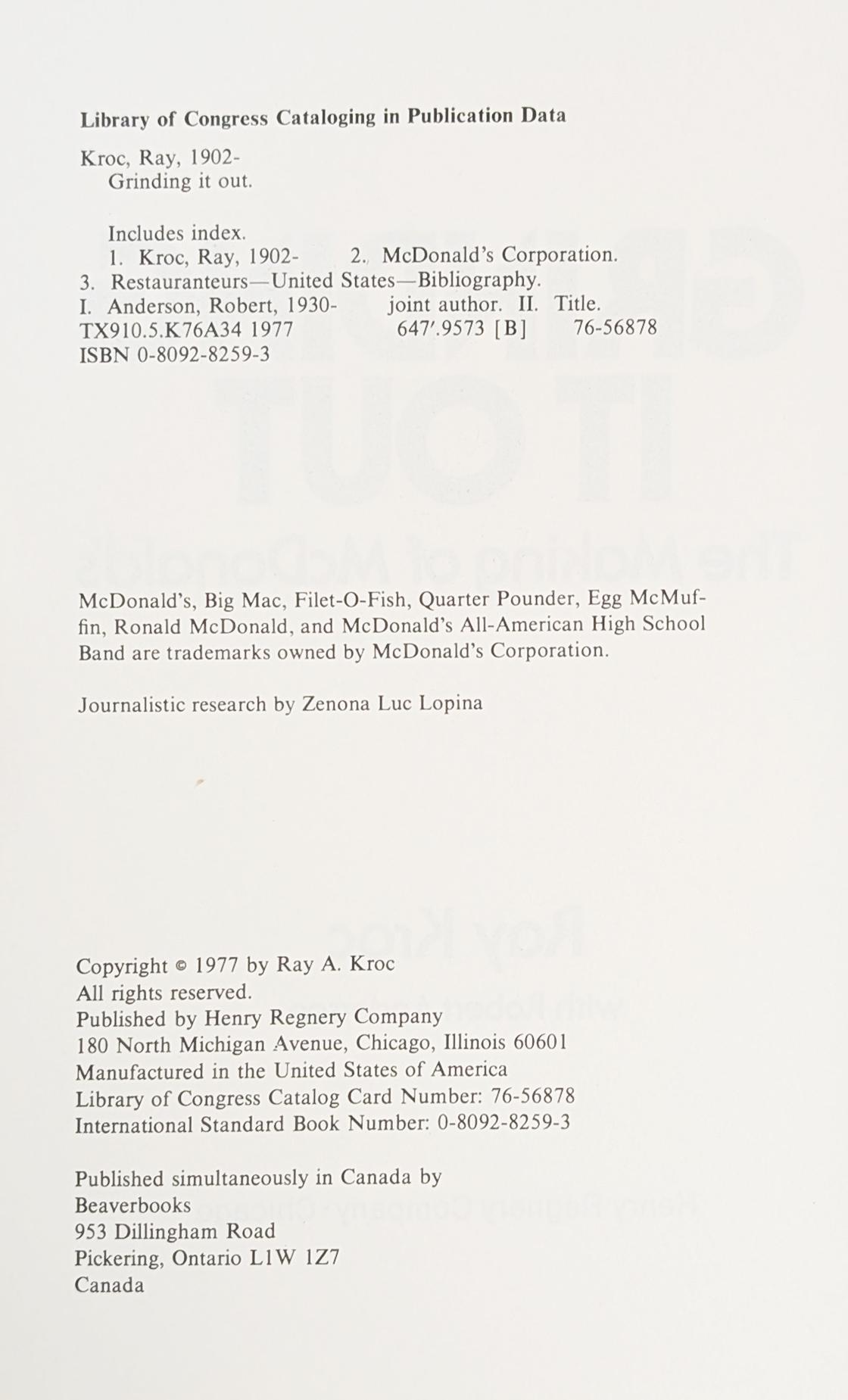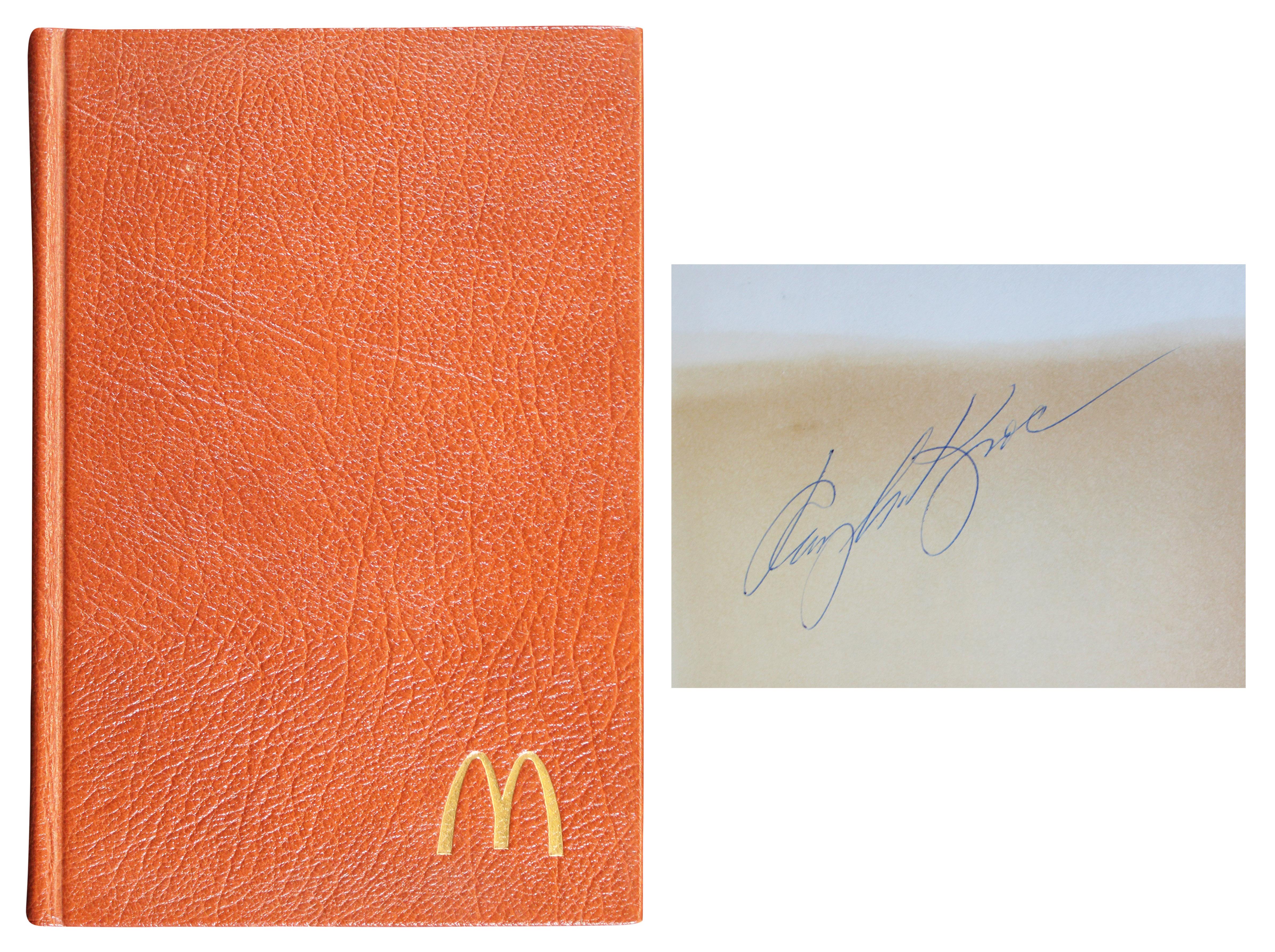 "Grinding It Out: The Making of McDonald's" hardcover book has been hand-signed on the inside page by Ray Kroc (D. 1984).