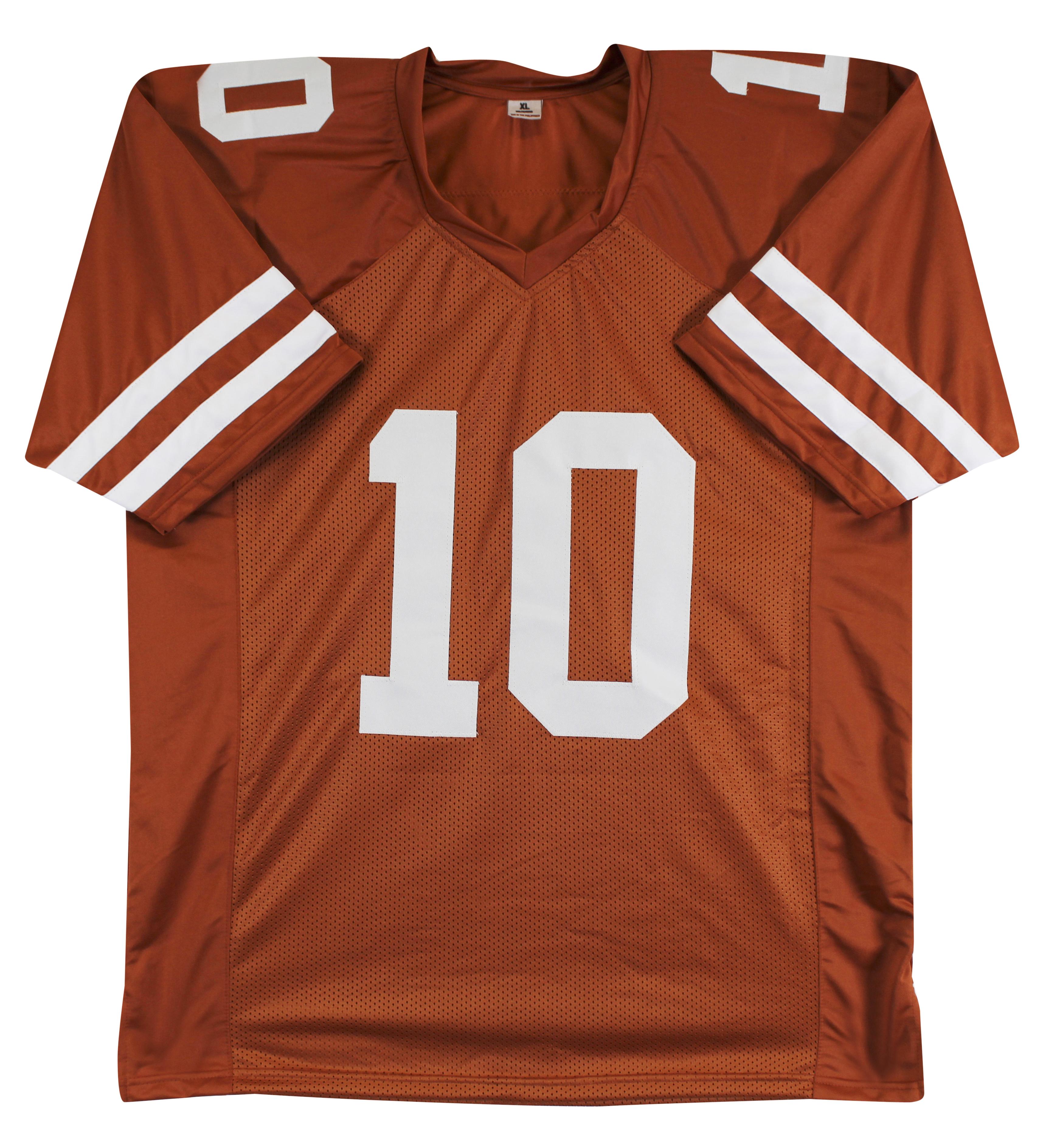 Custom jersey with everything sewn on, size XL. Hand-signed and inscribed by Vince Young (Texas Longhorns).