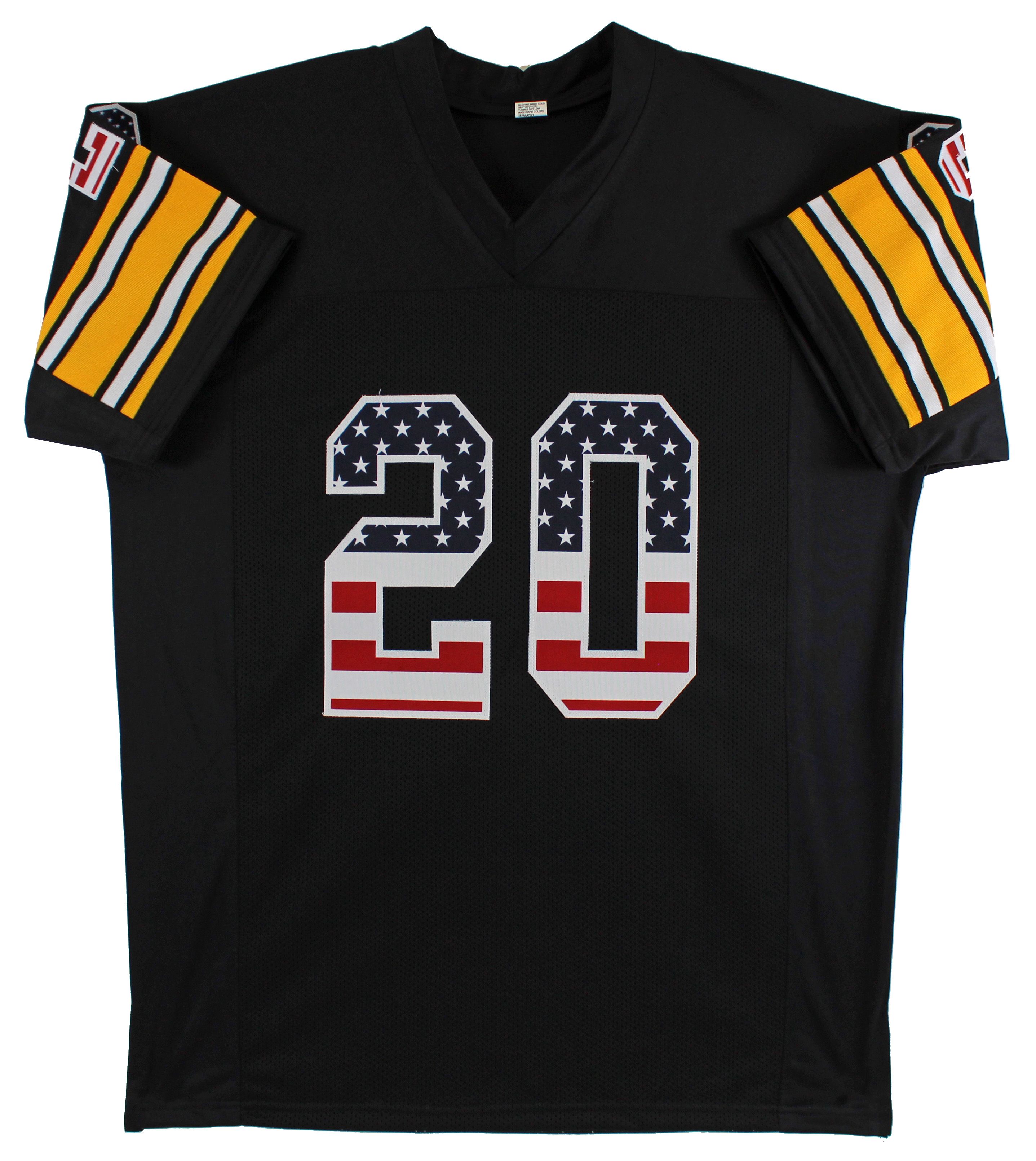 Custom on-field style jersey. Everything sewn on, size XL. Hand-signed and inscribed by Rocky Bleier.