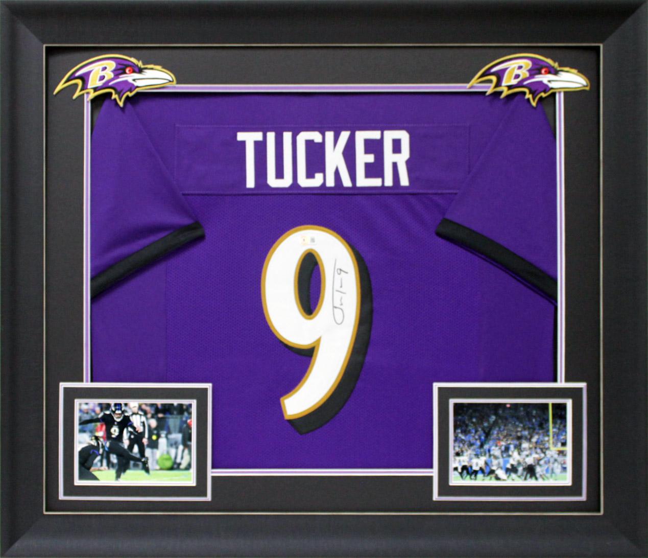 Custom frame measures 32" x 37" in size and features a jersey that has been hand-signed by Justin Tucker.