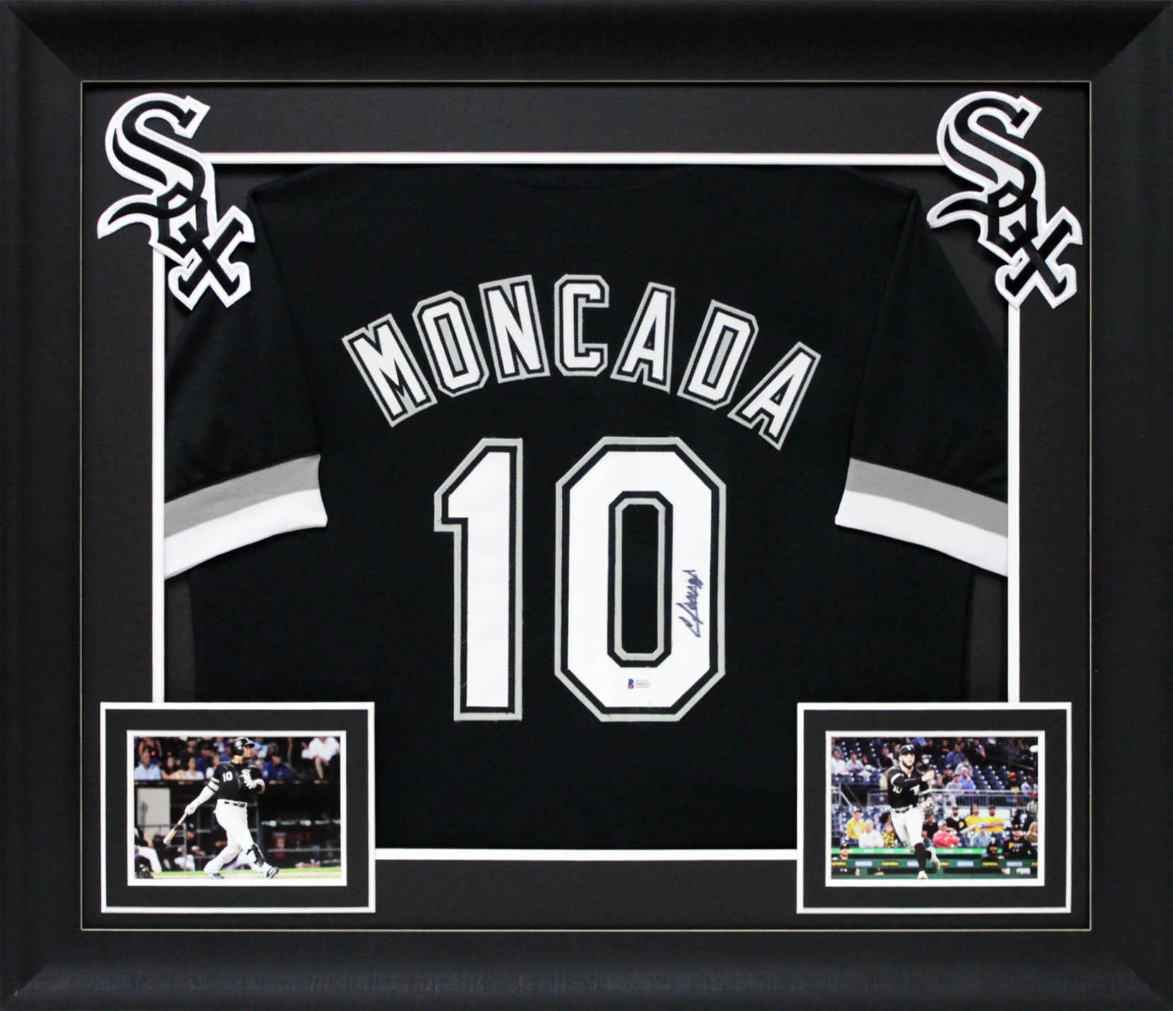 Custom frame measures approximately 32" x 37" in size and features a jersey hand-signed by Yoan Moncada. The display also includes (2) photographs of Yoan Moncada.