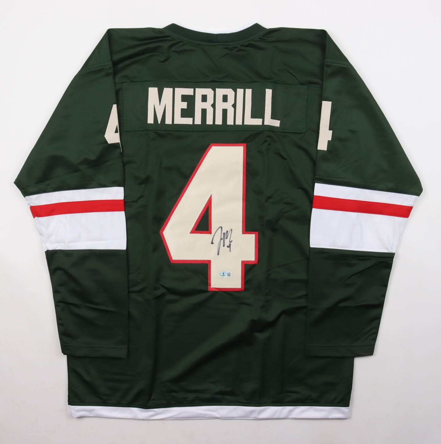 Custom jersey with everything sewn on, size XL. Hand-signed by Jon Merrill.