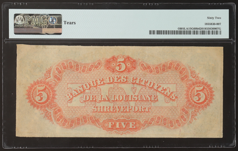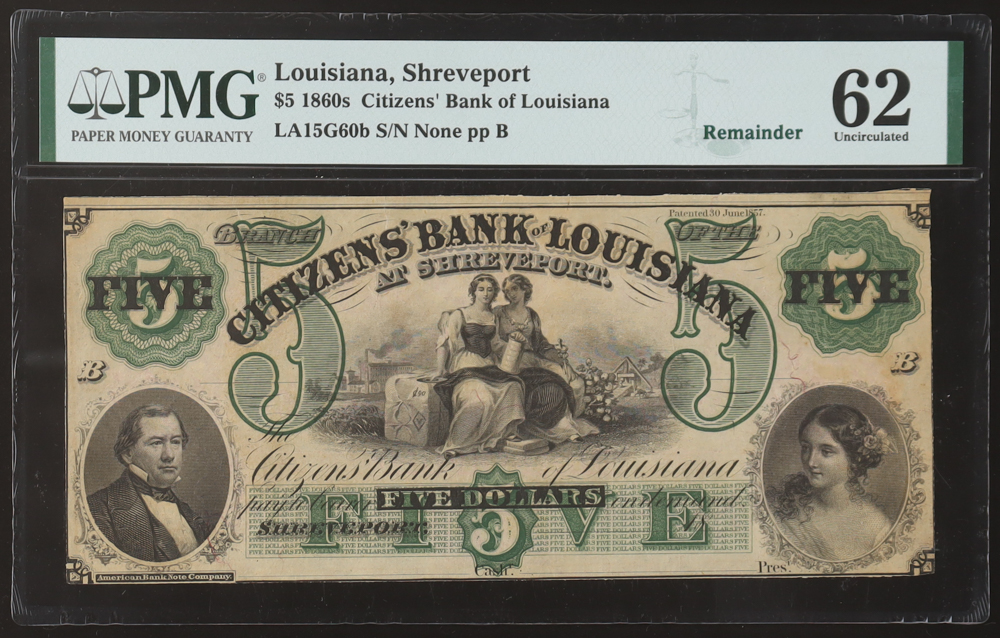 1860s $5 Five Dollar United States Citizens' Bank of Louisiana Bank Note (PMG Uncirculated 62)
