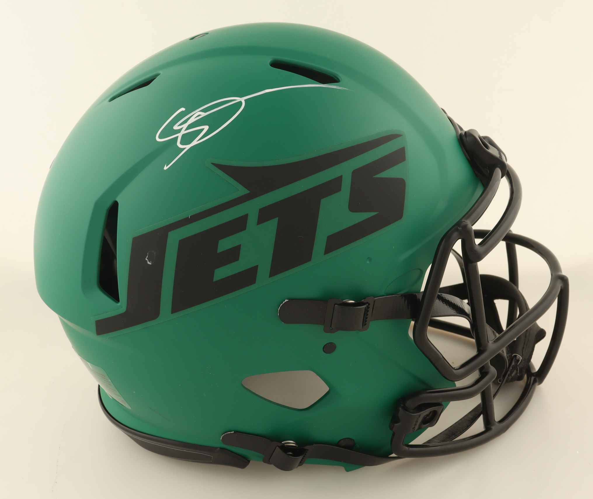 Riddell New York Jets Full-Size Authentic On-Field Rave Alternate Speed Helmet. Hand-signed by Ahmad "Sauce" Gardner. Please note, there are minor stains and scuffing throughout the helmet.