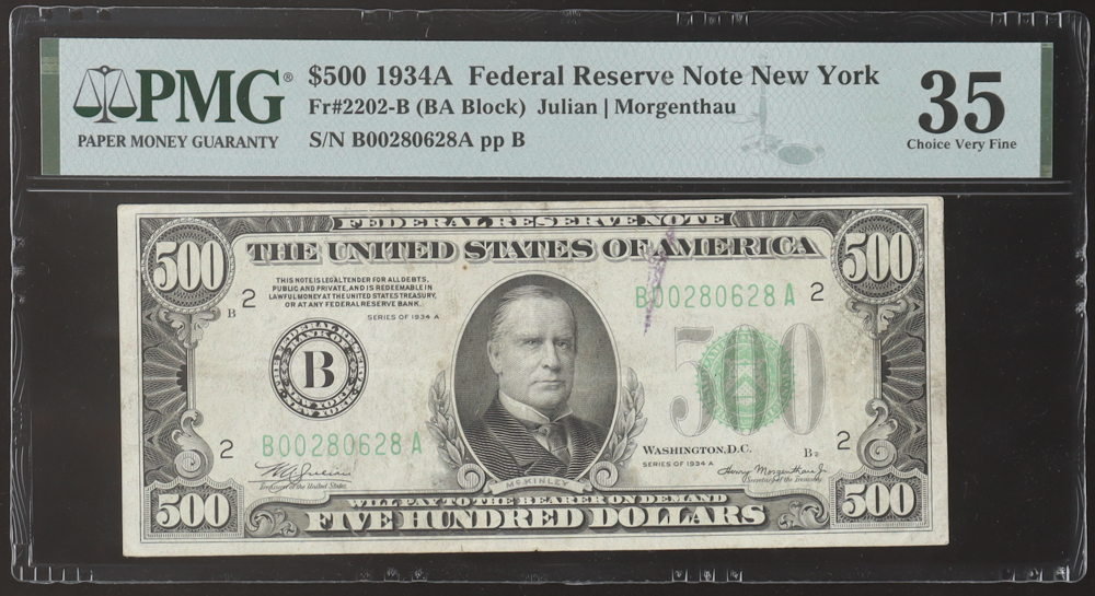 1934 $500 Five Hundred Dollars Red Seal Federal Reserve Bank Note - New York (PMG 35)