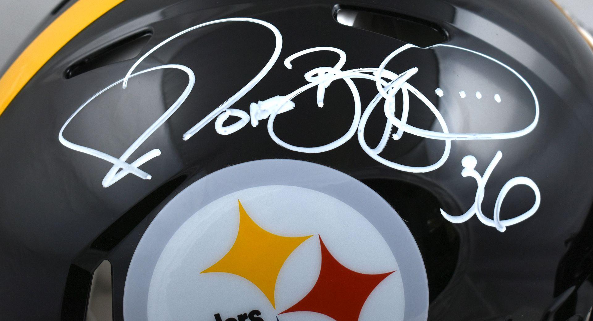 Riddell Pittsburgh Steelers full-size authentic on-field speed helmet has been hand-signed by Jerome Bettis (HOF).