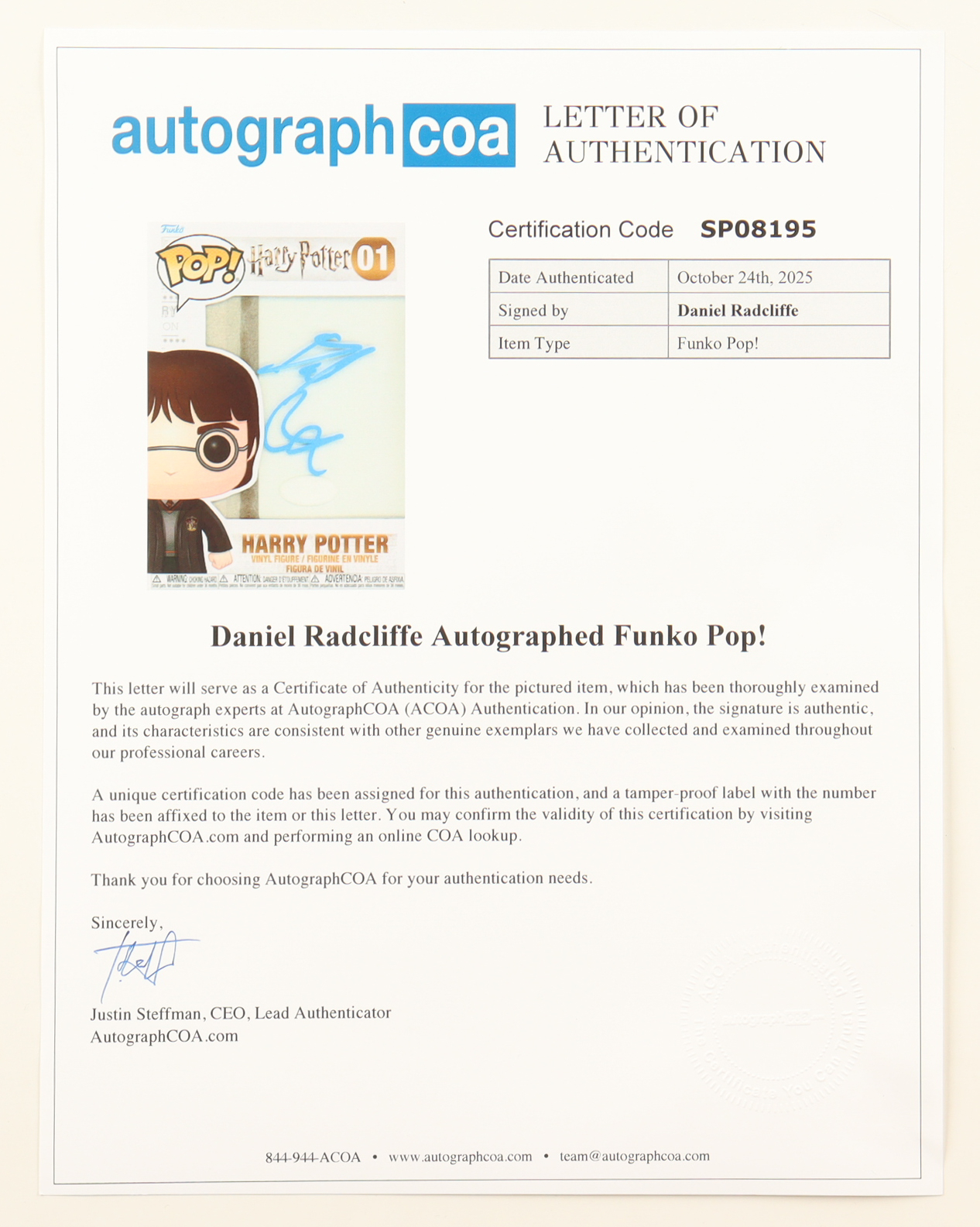 Daniel Radcliffe Signed "Harry Potter" #01 Harry Potter Funko Pop! Vinyl Figure (ACOA)