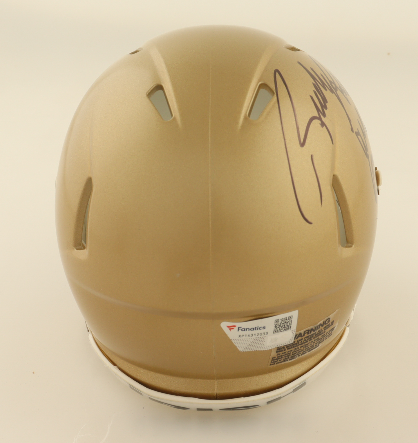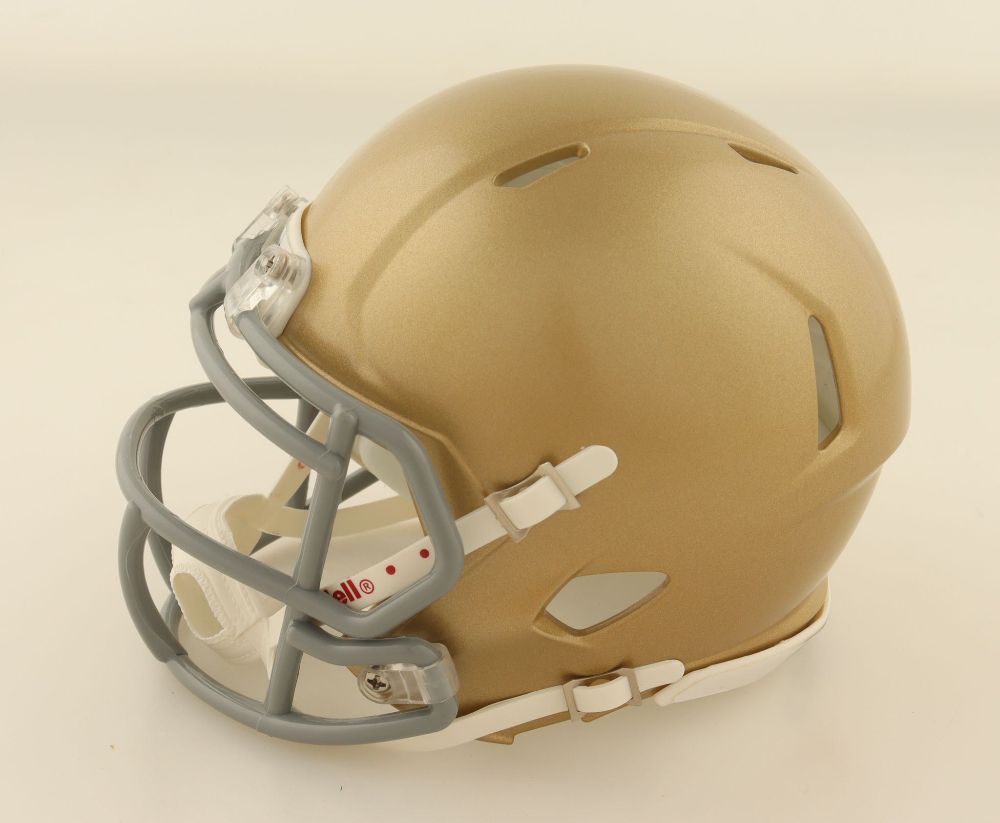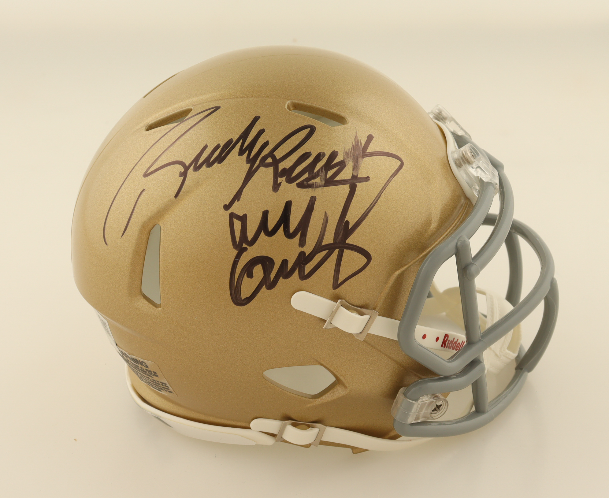 Riddell Notre Dame Fighting Irish Speed Mini Helmet. Hand-signed and inscribed by Rudy Ruettiger. Please note, the signature has been smudged.
