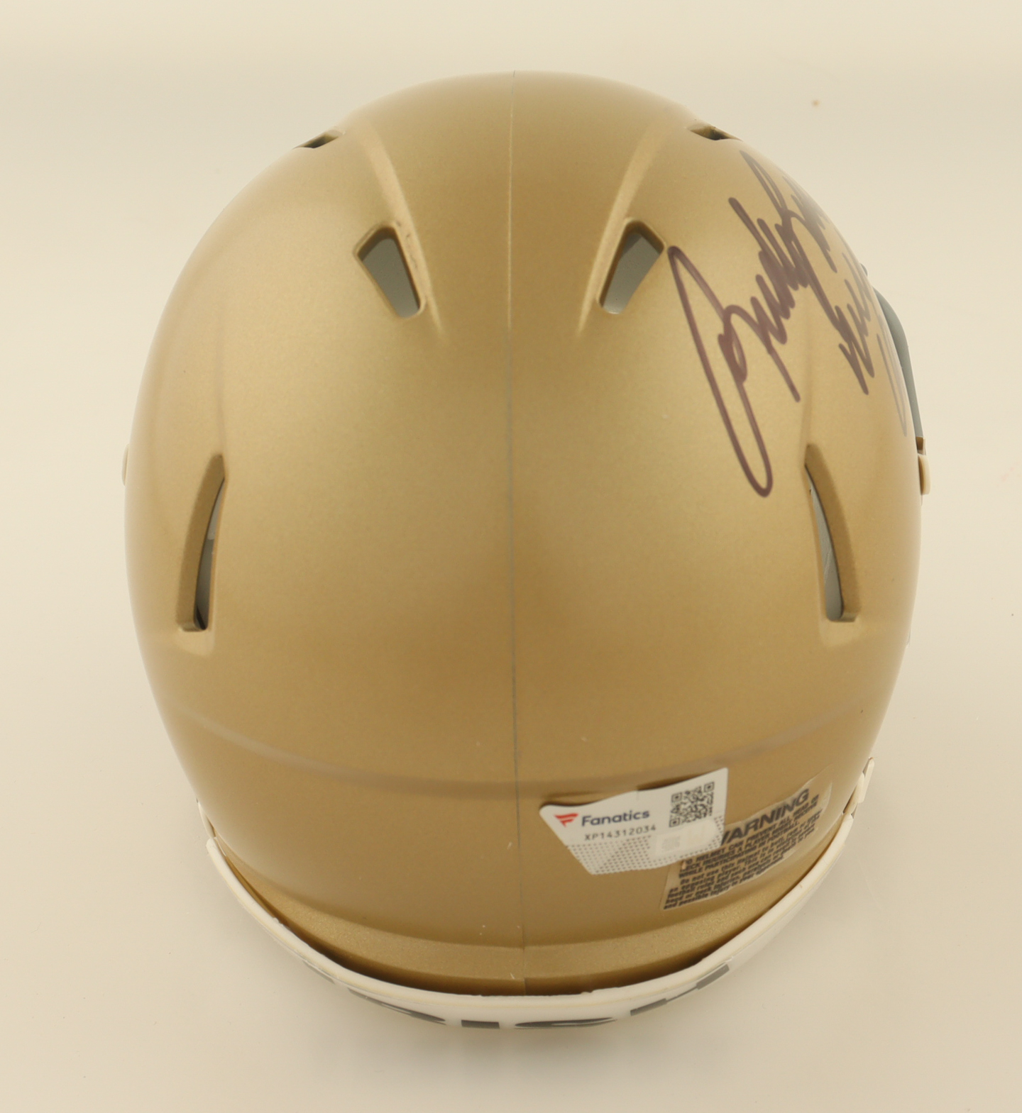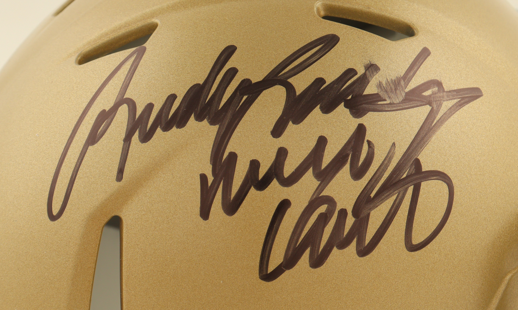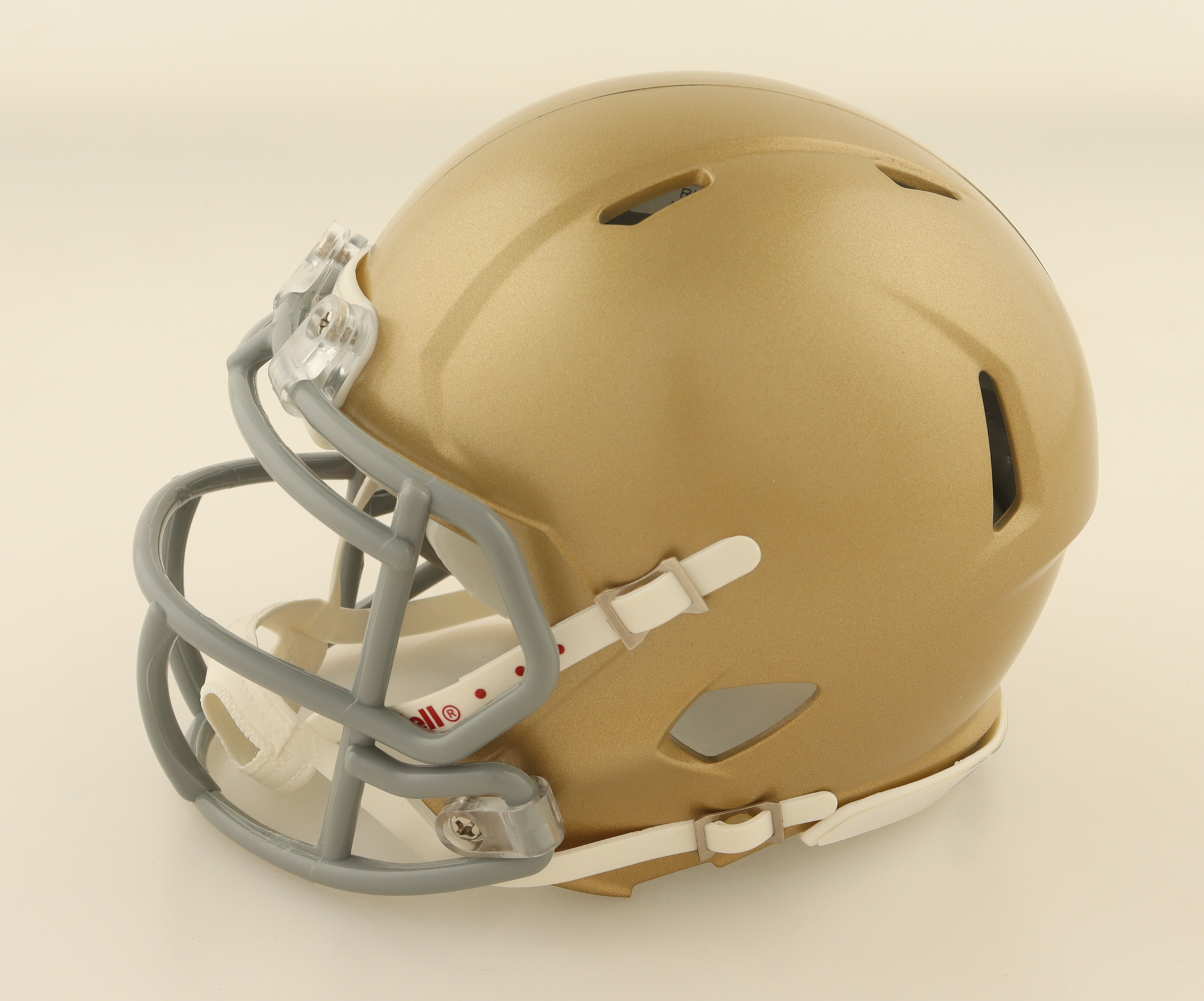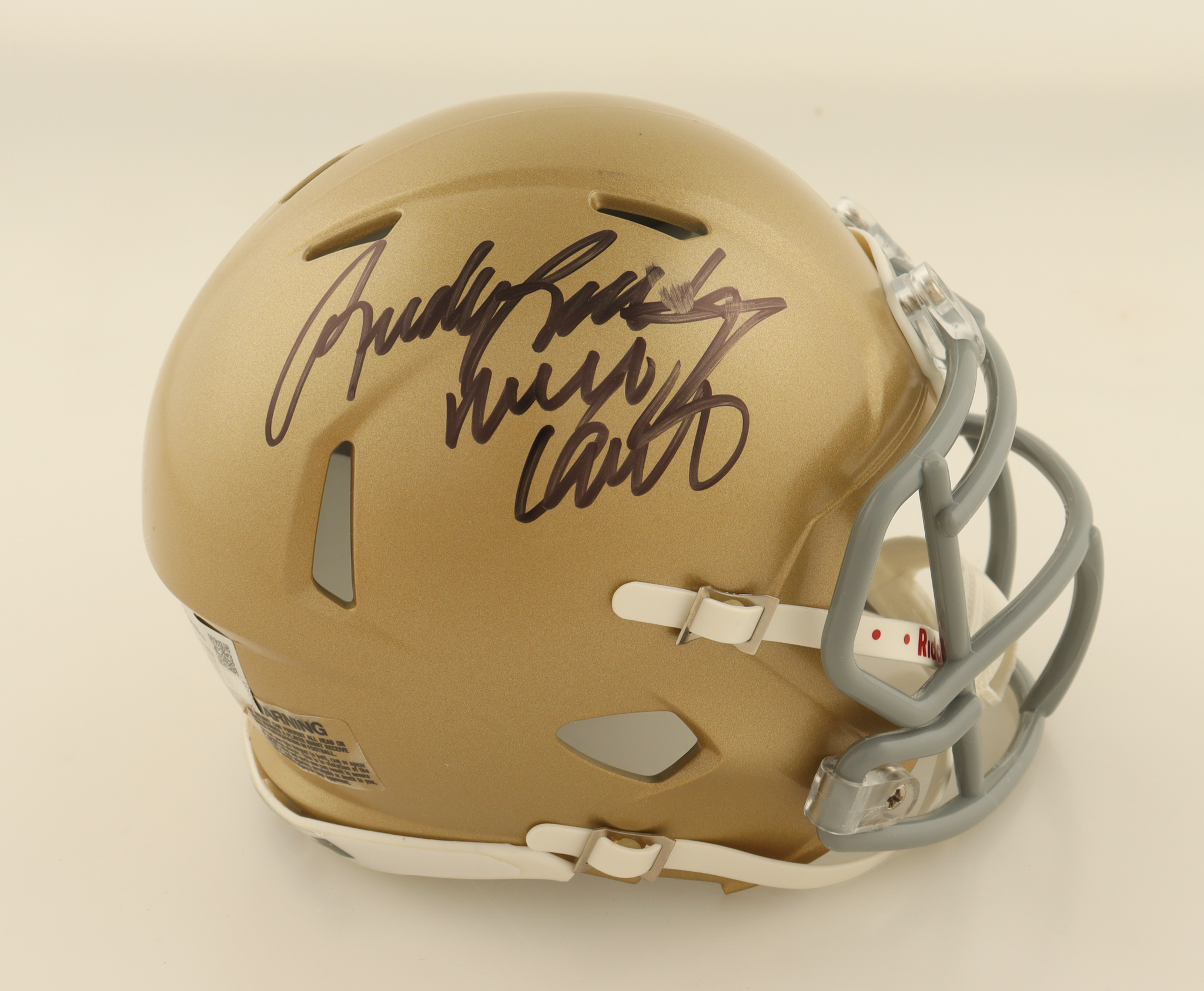 Riddell Notre Dame Fighting Irish Speed Mini Helmet. Hand-signed and inscribed by Rudy Ruettiger. Please note, the signature has been smudged.