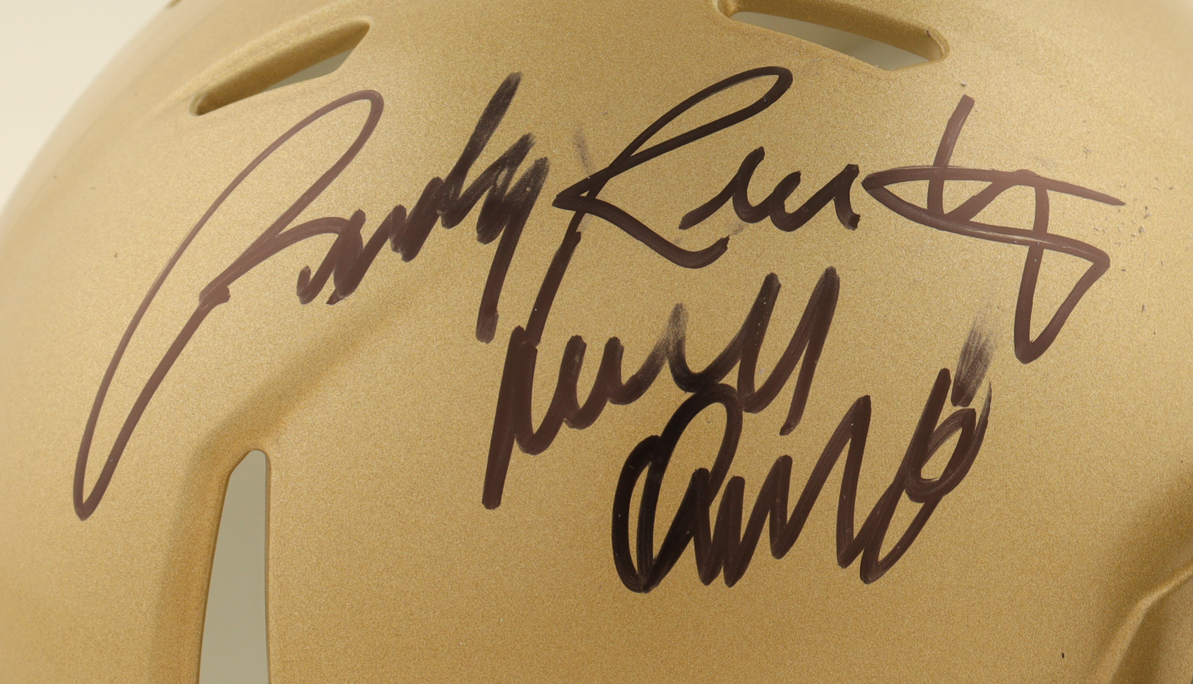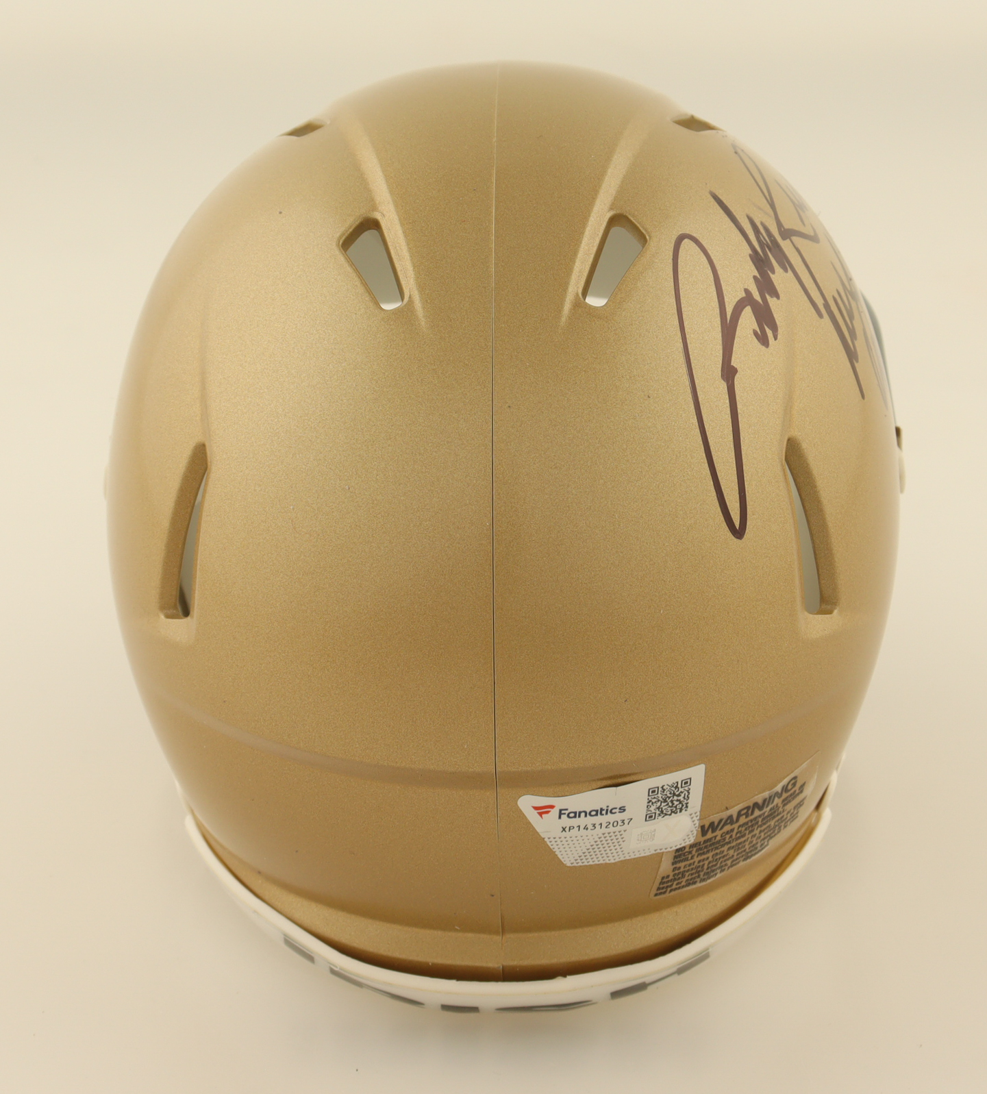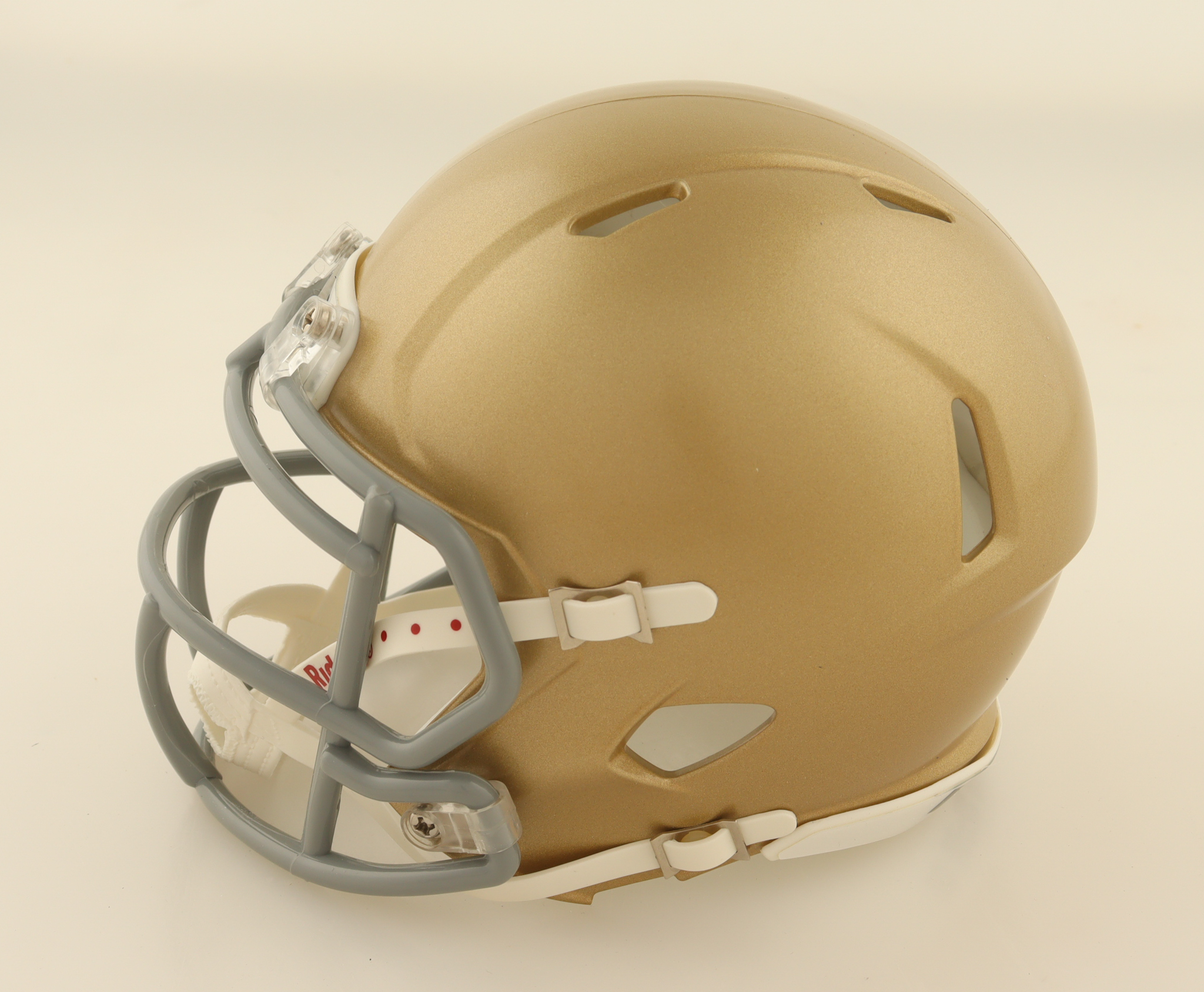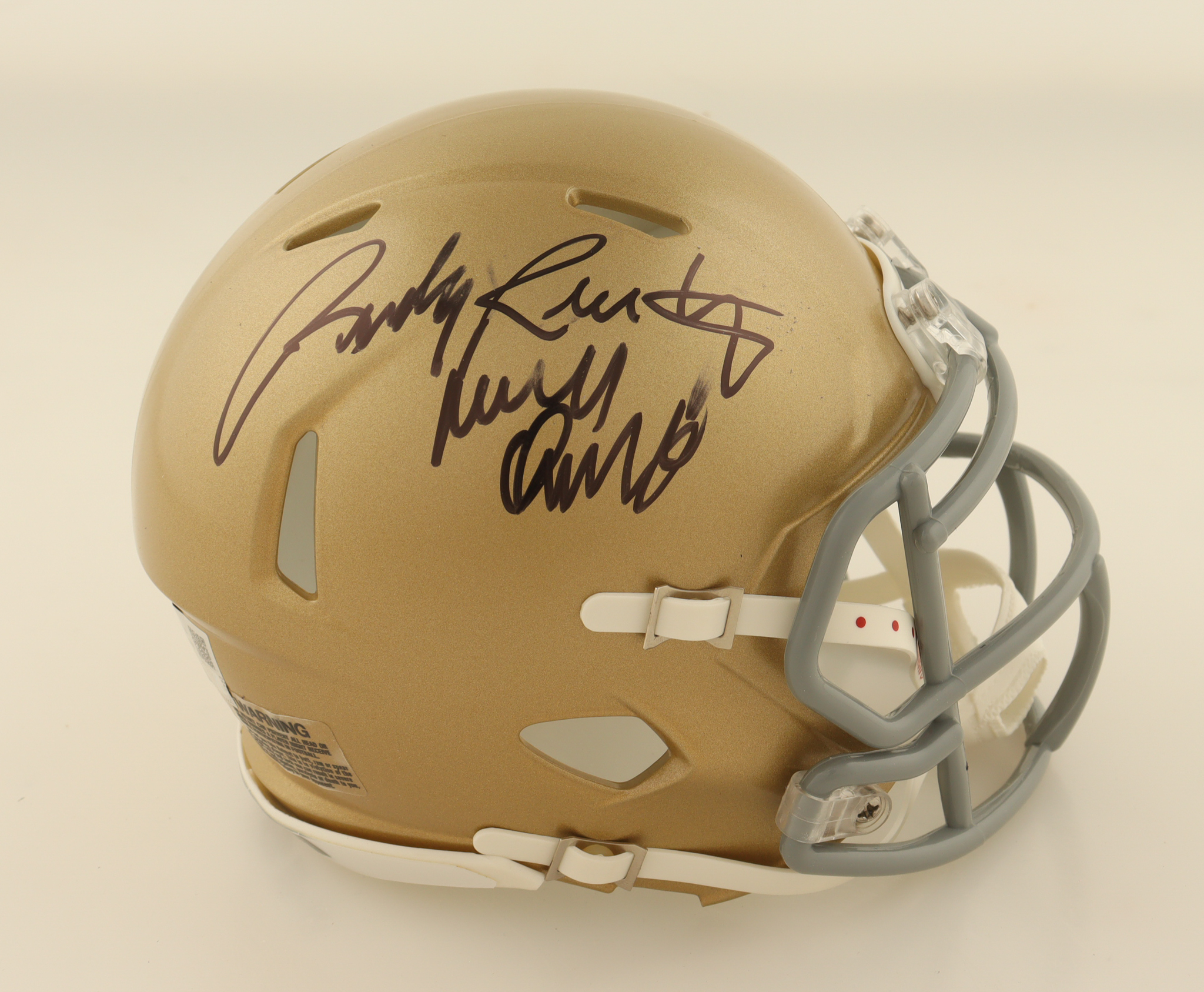 Riddell Notre Dame Fighting Irish Speed Mini Helmet. Hand-signed and inscribed by Rudy Ruettiger. Please note, the signature has been smudged.