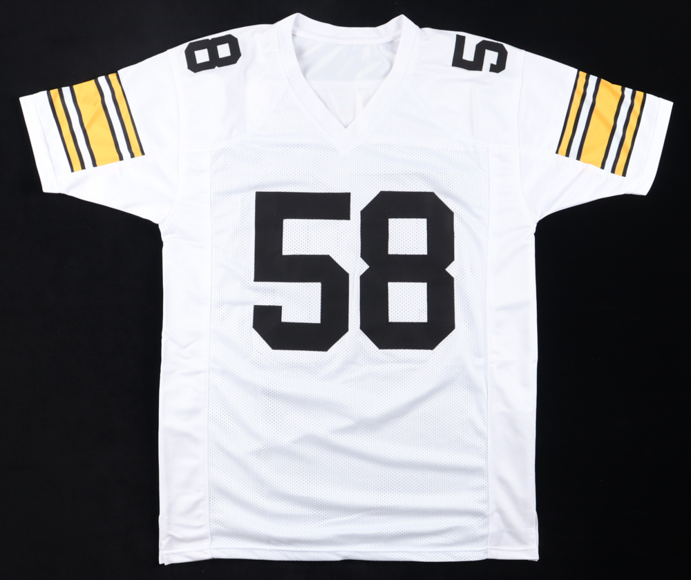 Custom jersey. Everything is sewn on, size XL. Hand-signed and inscribed by Jack Lambert (HOF).