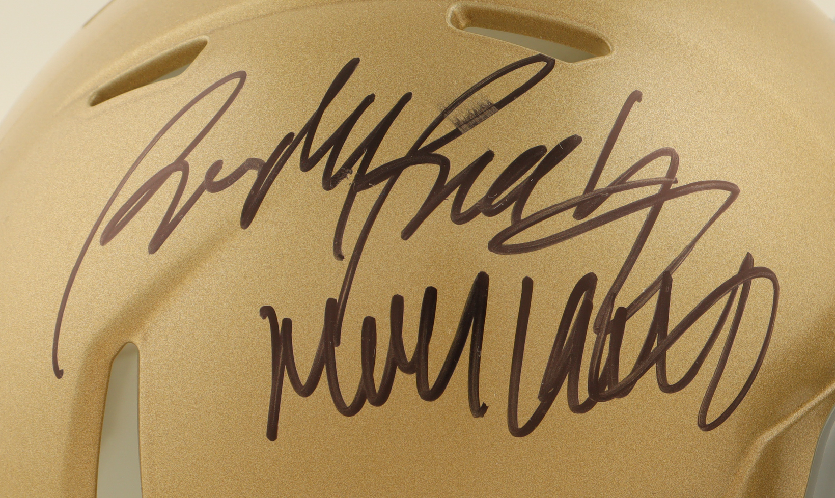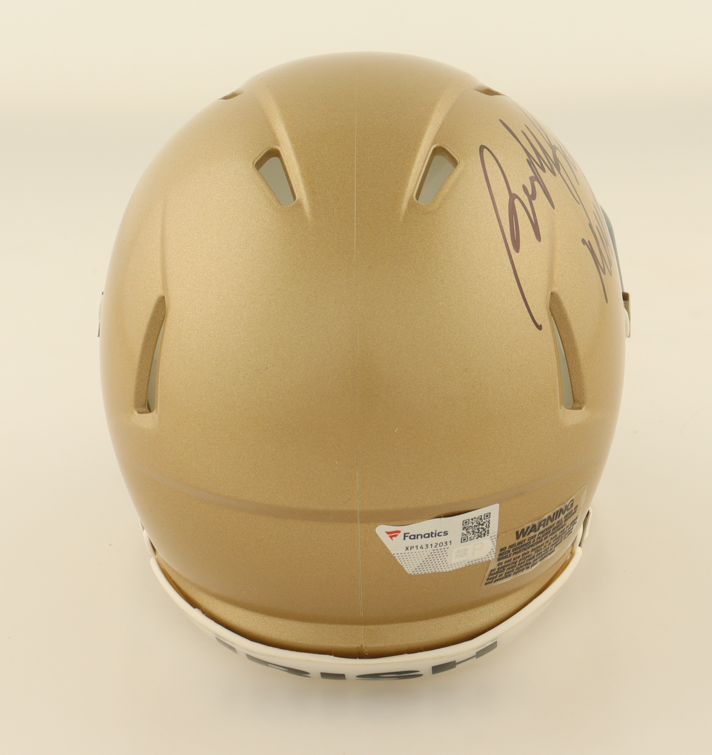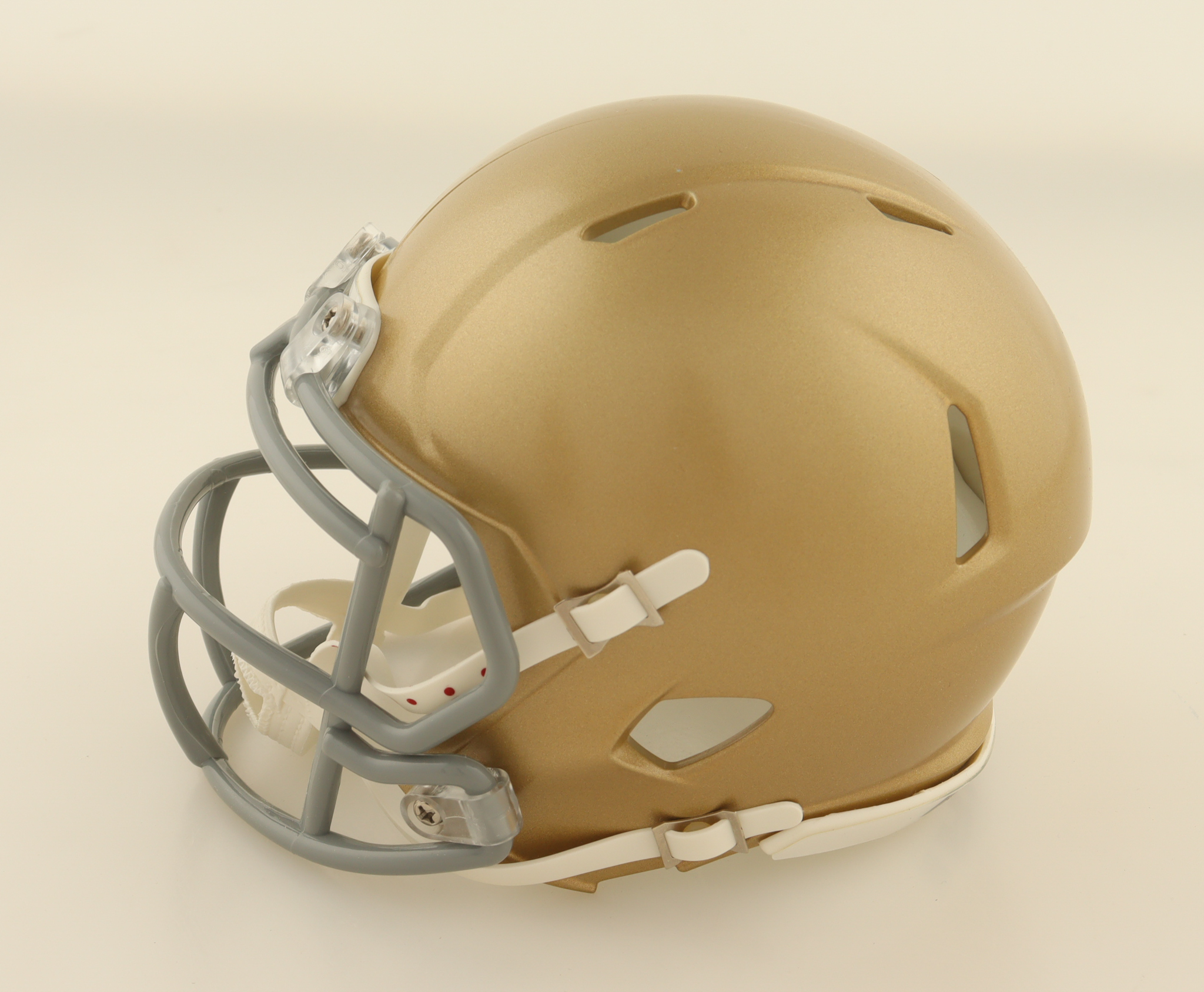 Riddell Notre Dame Fighting Irish Speed Mini Helmet. Hand-signed and inscribed by Rudy Ruettiger. Please note, the signature has been smudged.