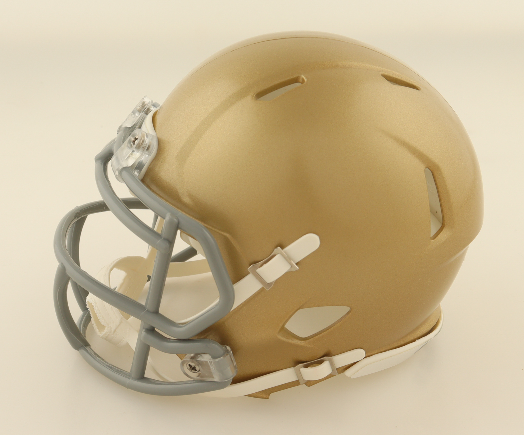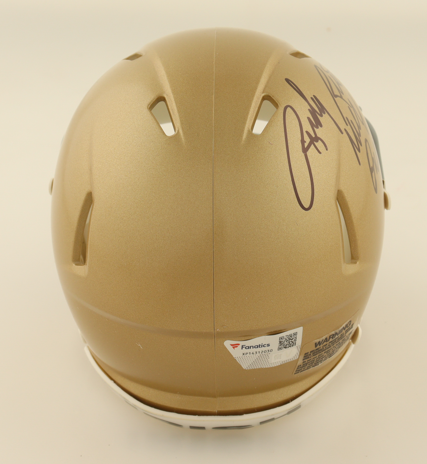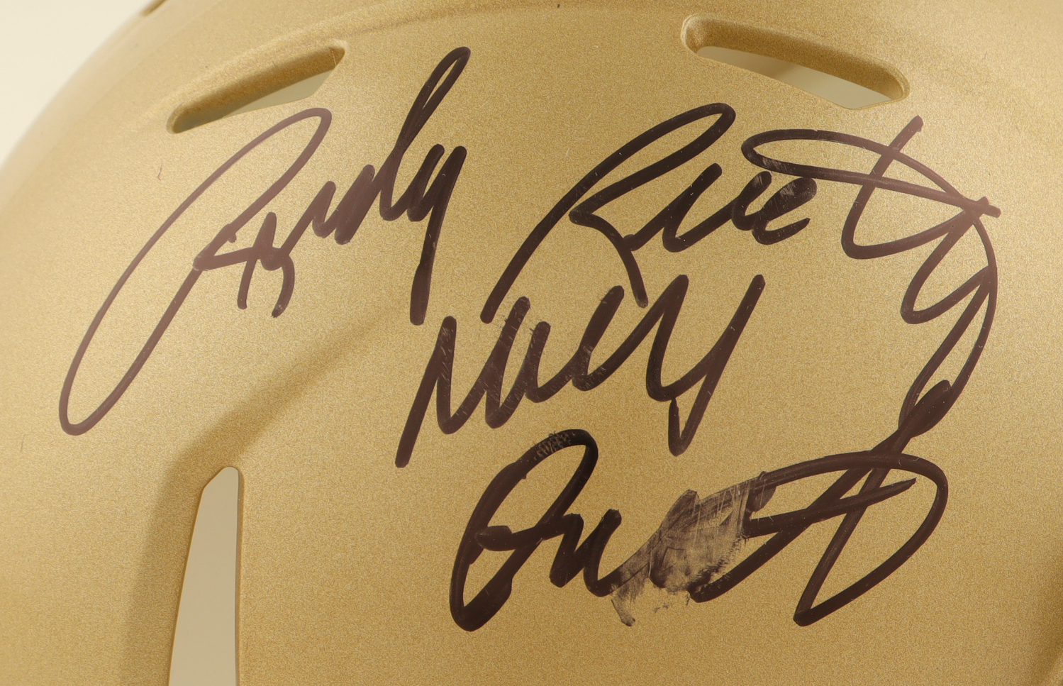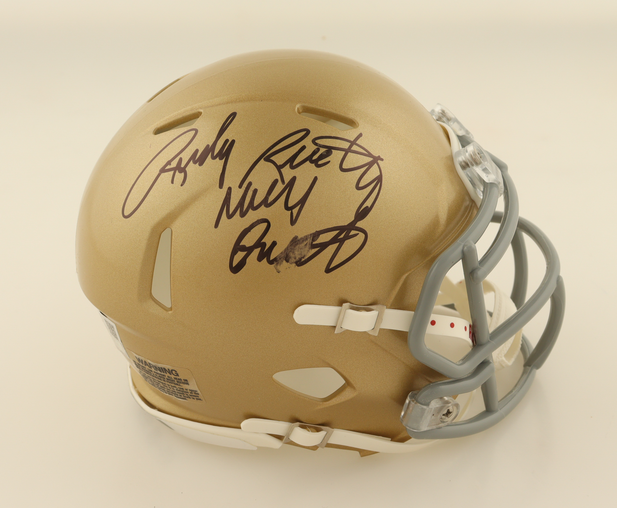 Riddell Notre Dame Fighting Irish Speed Mini Helmet. Hand-signed and inscribed by Rudy Ruettiger. Please note, the signature has been smudged.
