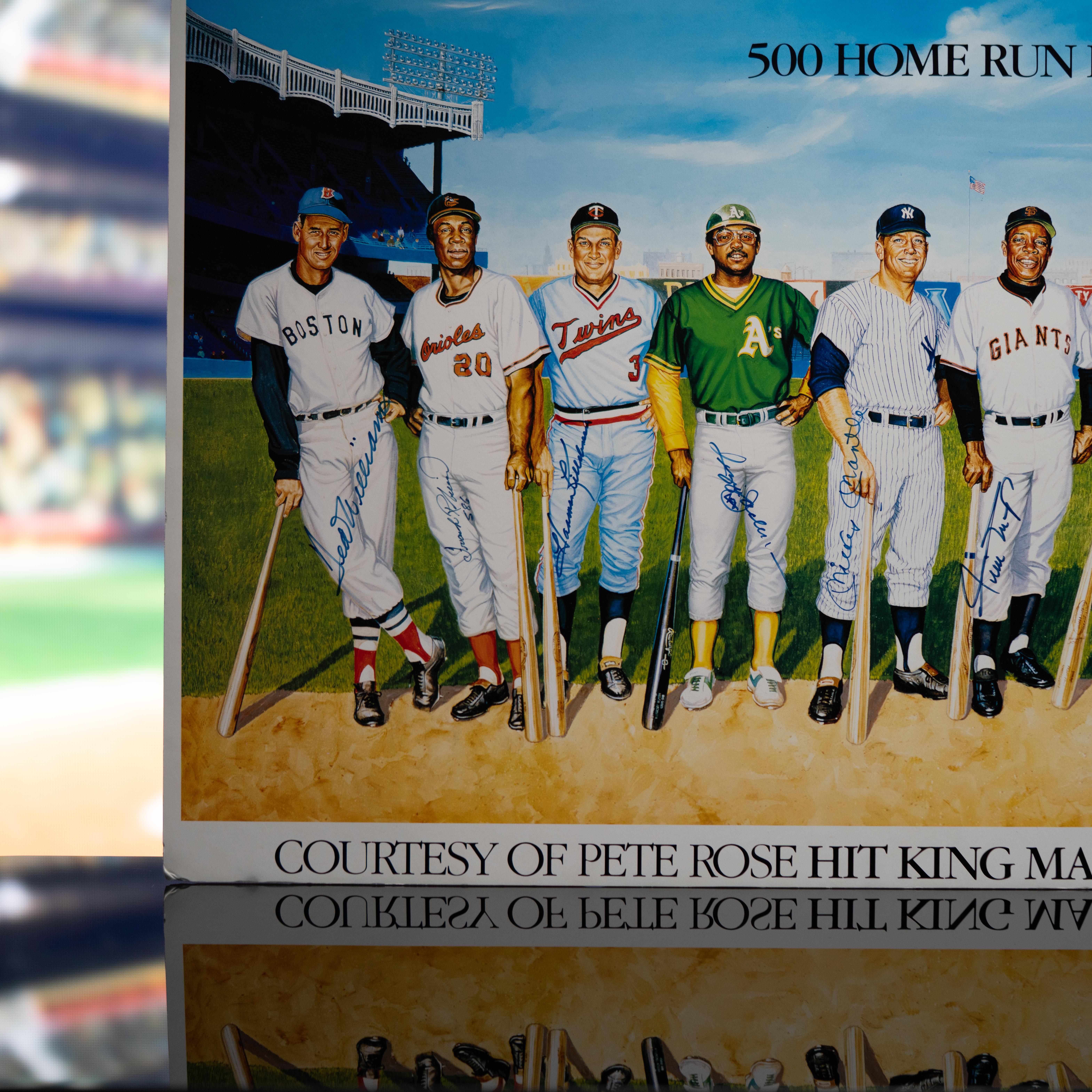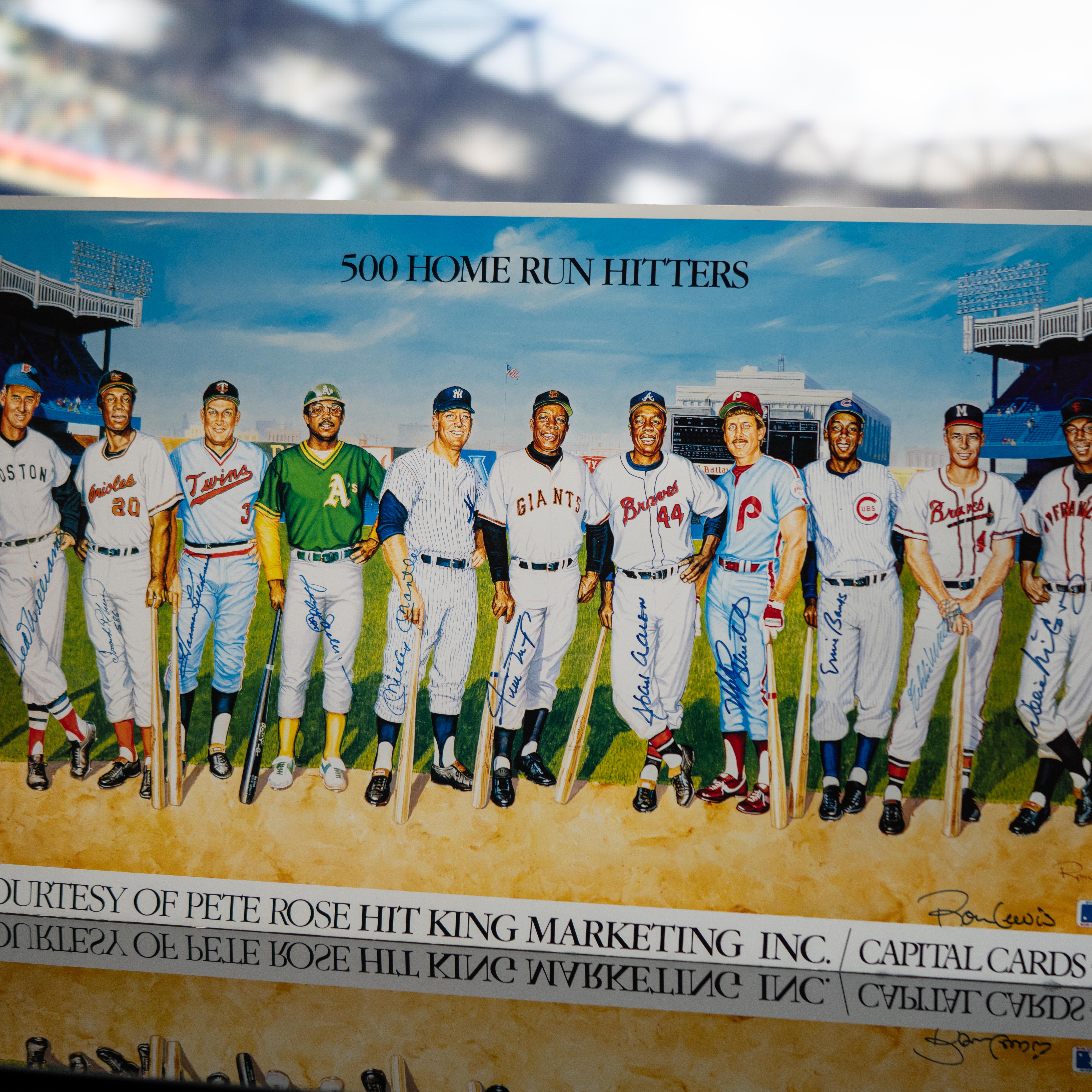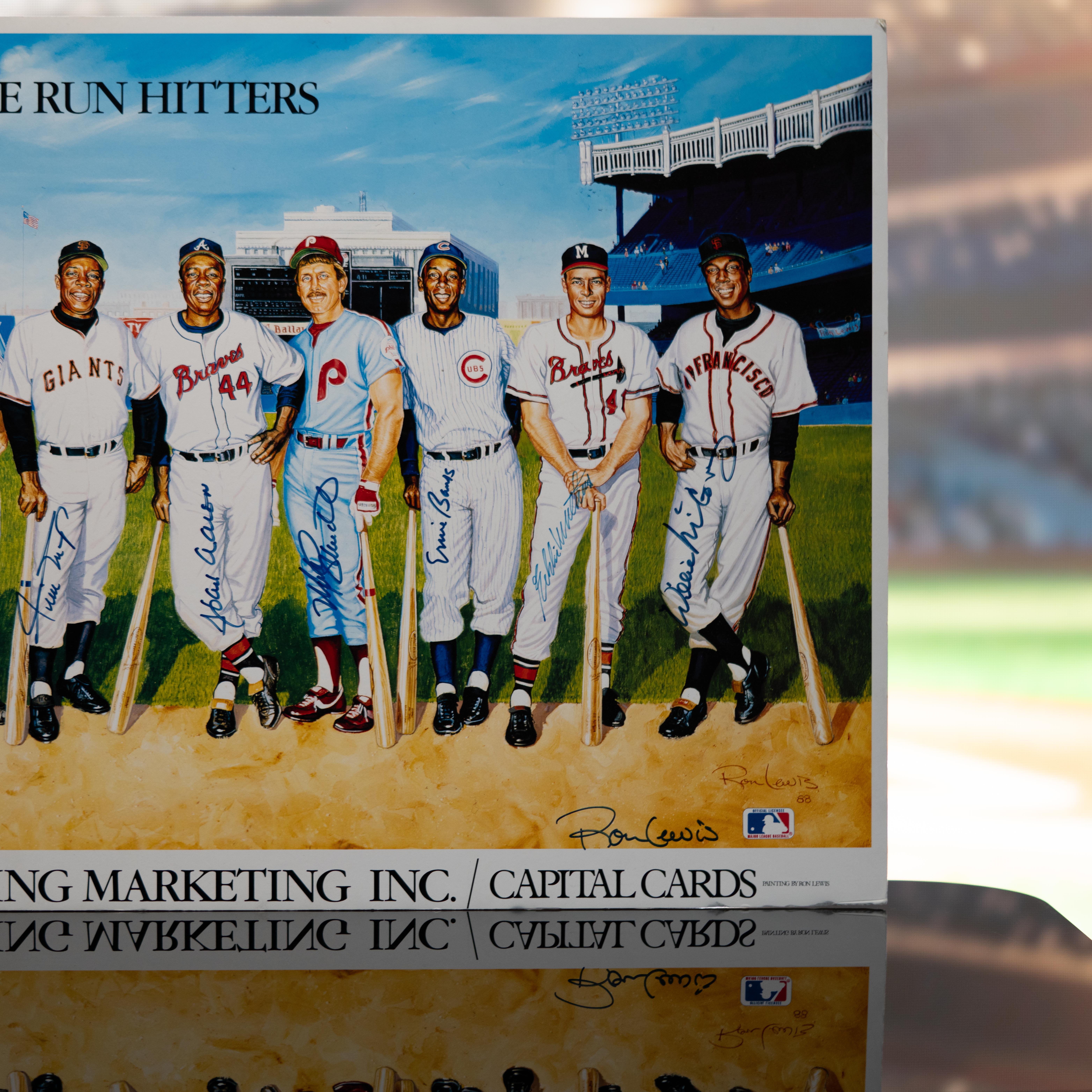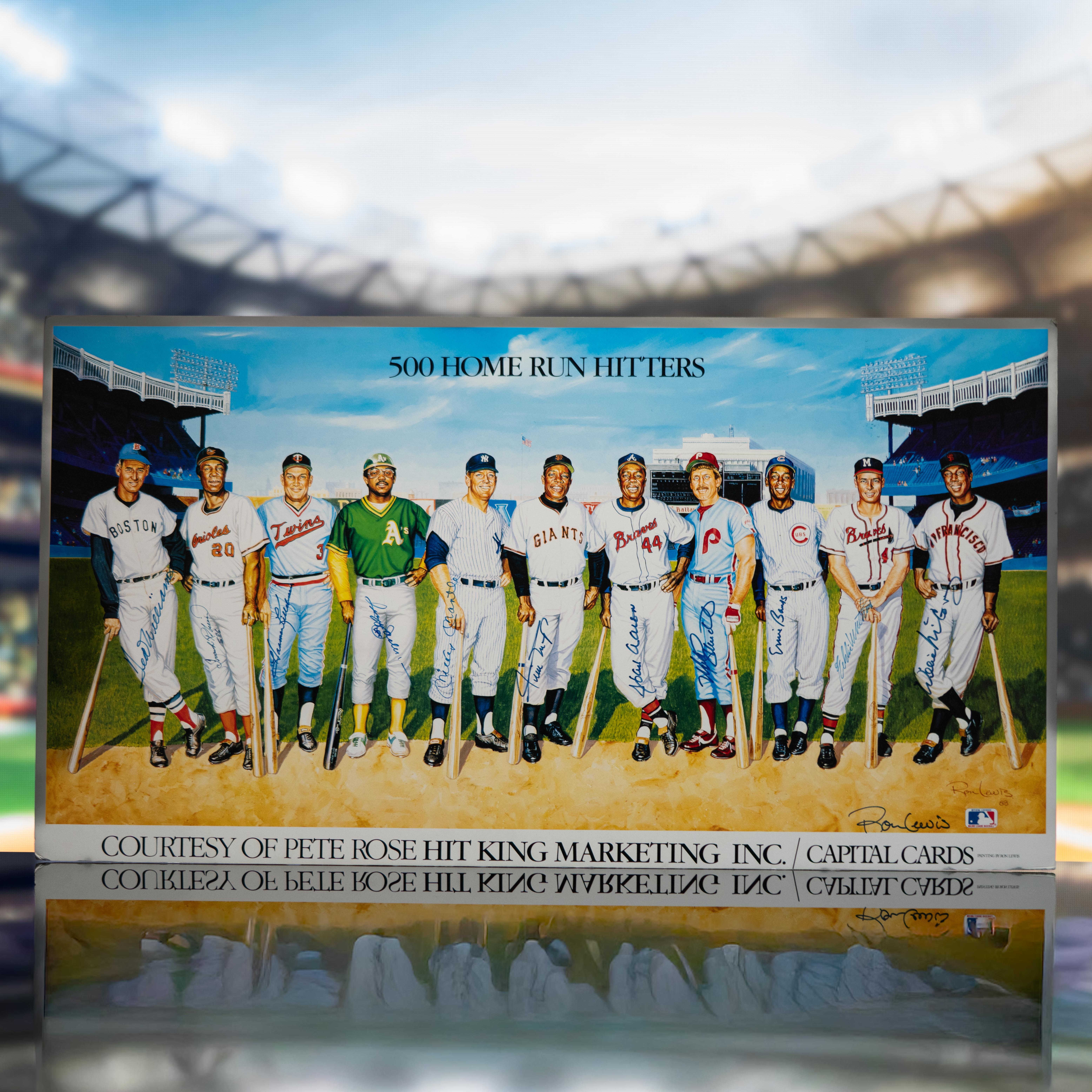Ron Lewis 500 Home Run Hitters lithograph mounted on foam measures 20" x 37" in size and is hand-signed by (12) with Mickey Mantle, Ted Williams, Hank Aaron, Reggie Jackson, Eddie Matthews, Frank Robinson, Willie Mays, Harmon Killebrew, Mike Schmidt, Ernie Banks and Willie McCovey. The print is also signed by the artist, Ron Lewis.