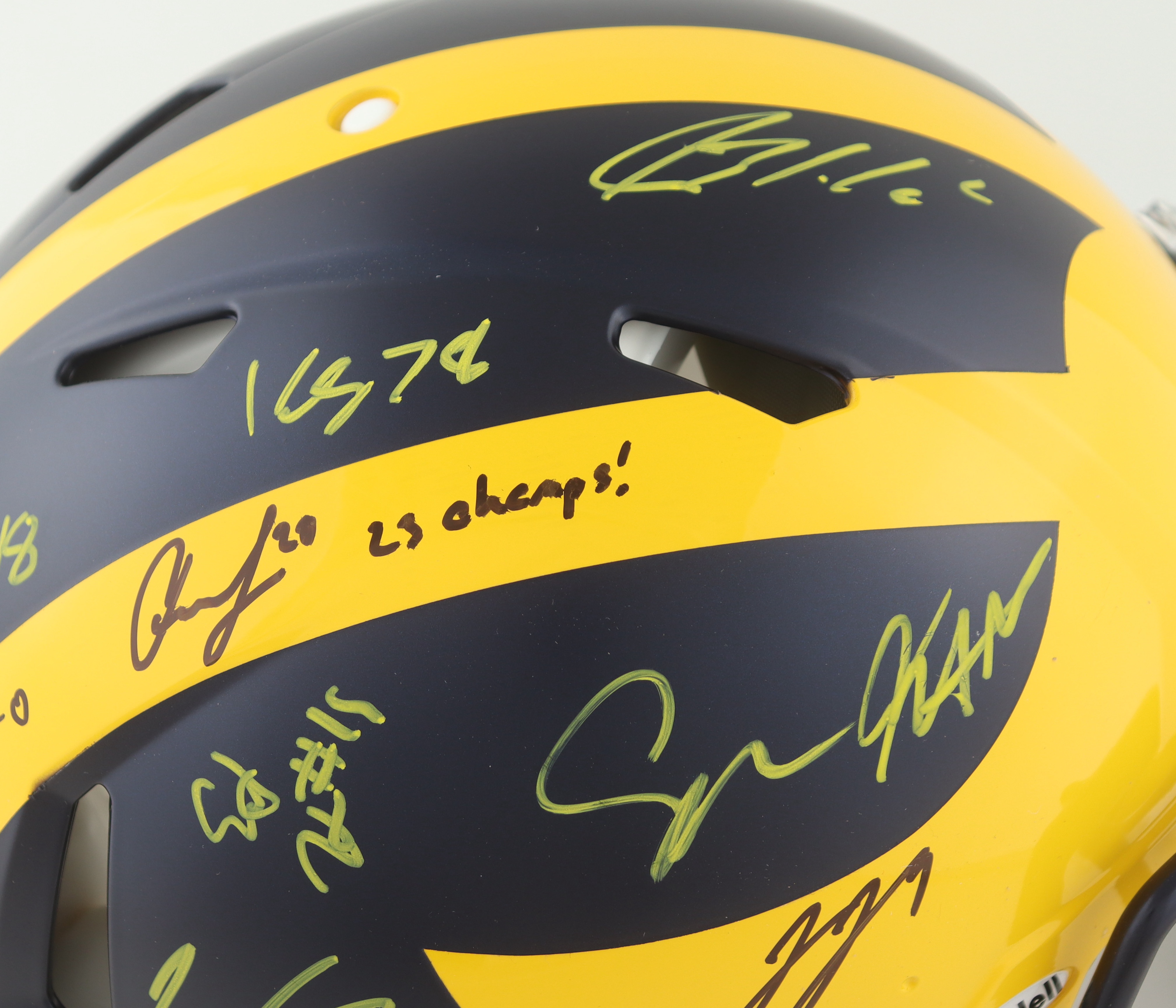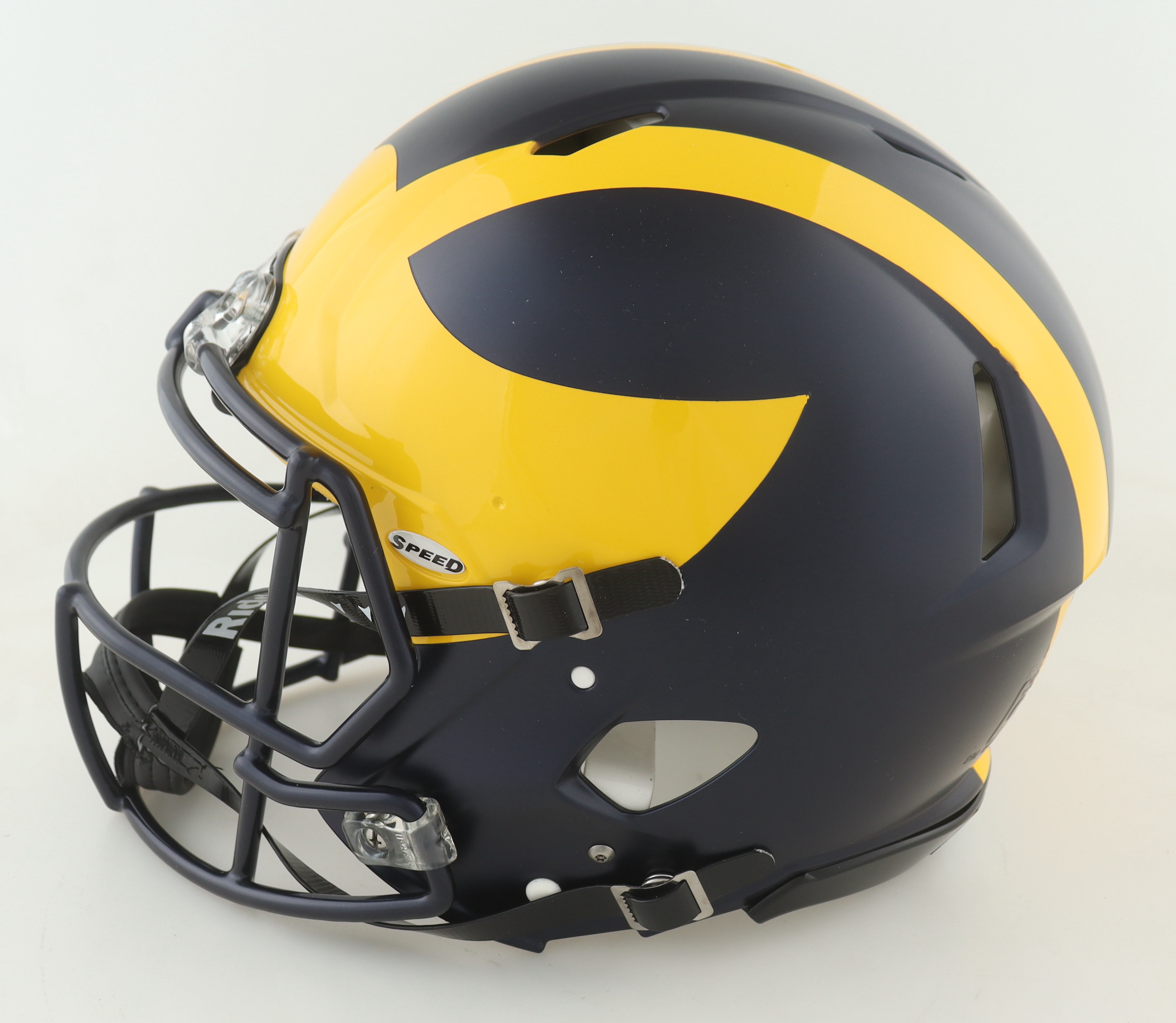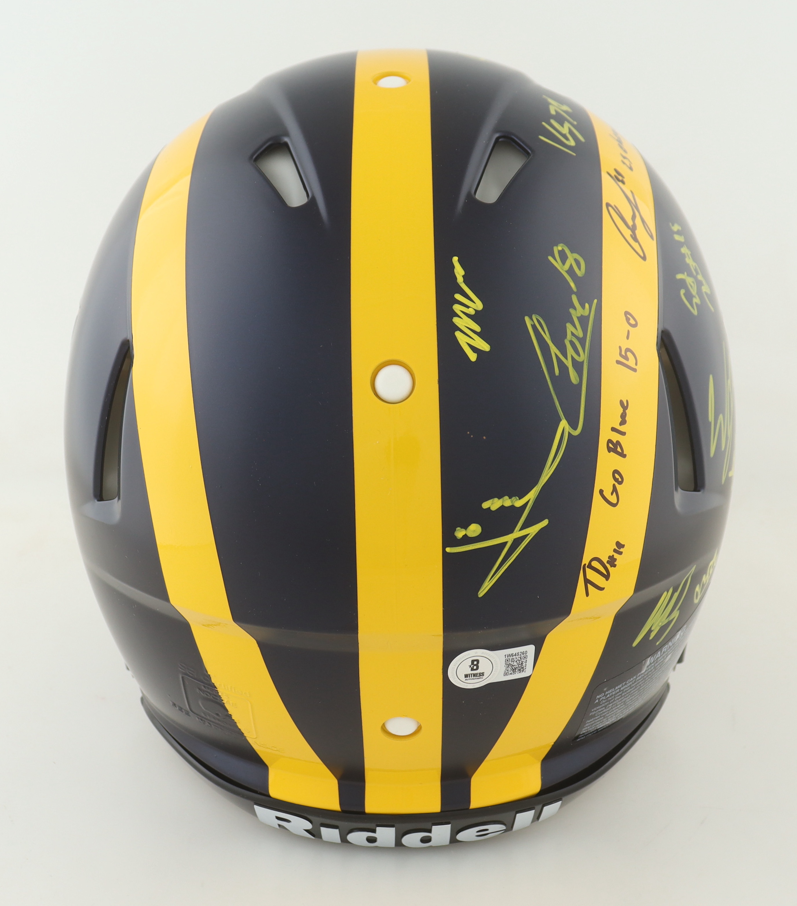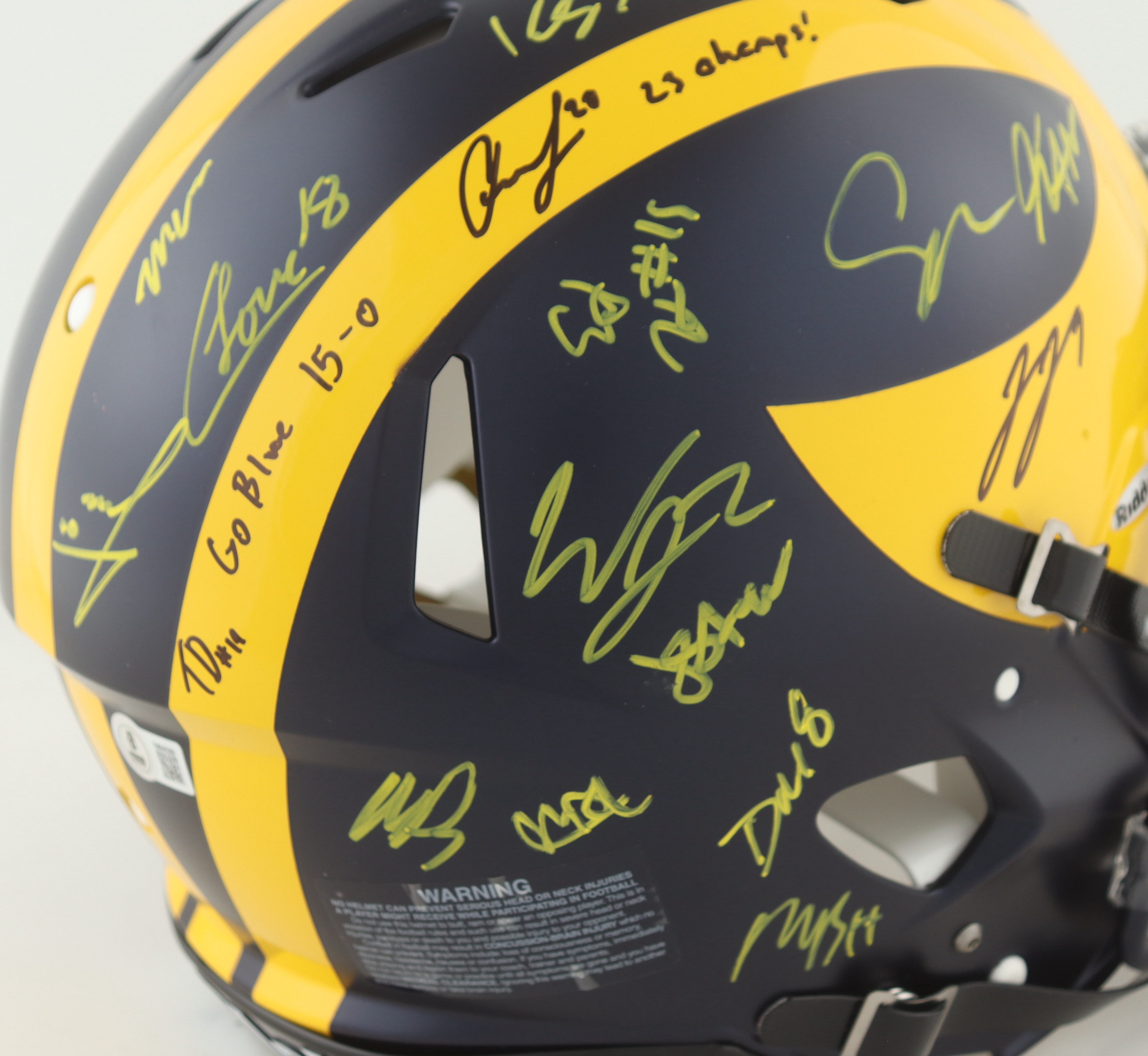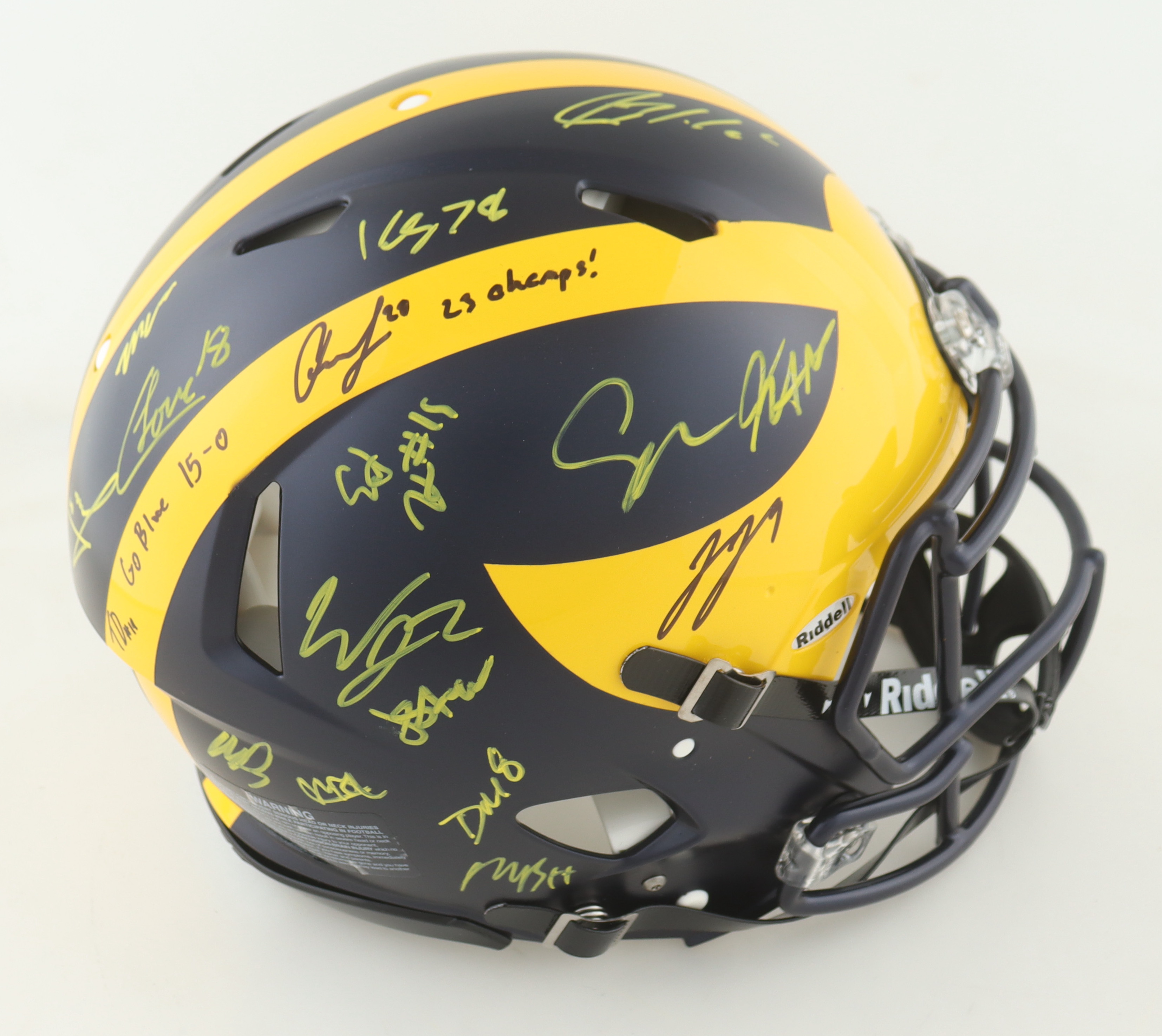 Riddell Michigan Wolverines full-size Authentic On-Field Speed helmet. Hand-signed and inscribed by (17) members of the 2023 Michigan Wolverines National Championship team. Signers include J.J. McCarthy, Max Bredeson, Mike Sainristil, Colston Loveland, Will Johnson, Mason Graham, Derrick Moore, Semaj Morgan, Makari Paige, Myles Hinton, Kalel Mullings, Kenneth Grant, Josiah Stewart, Ernest Huusmann, Blake Corum, Quentin Johnson and Tommy Doman.
