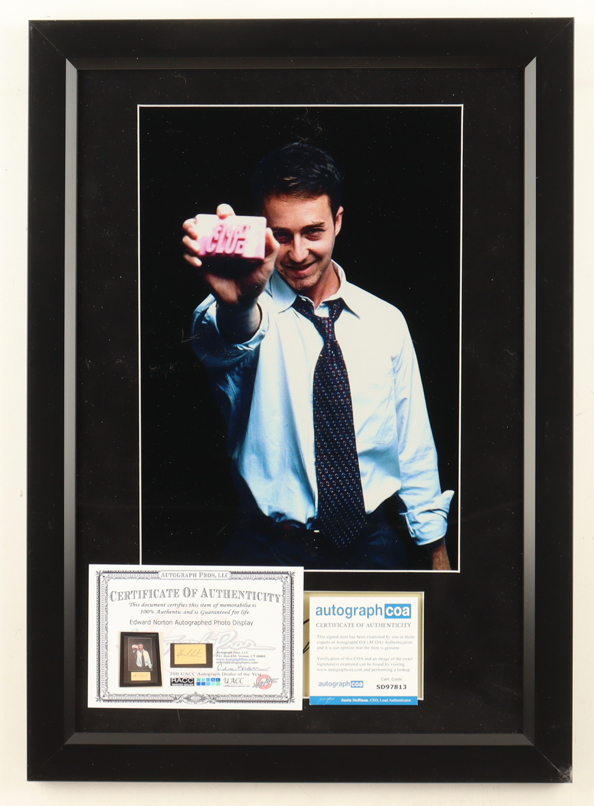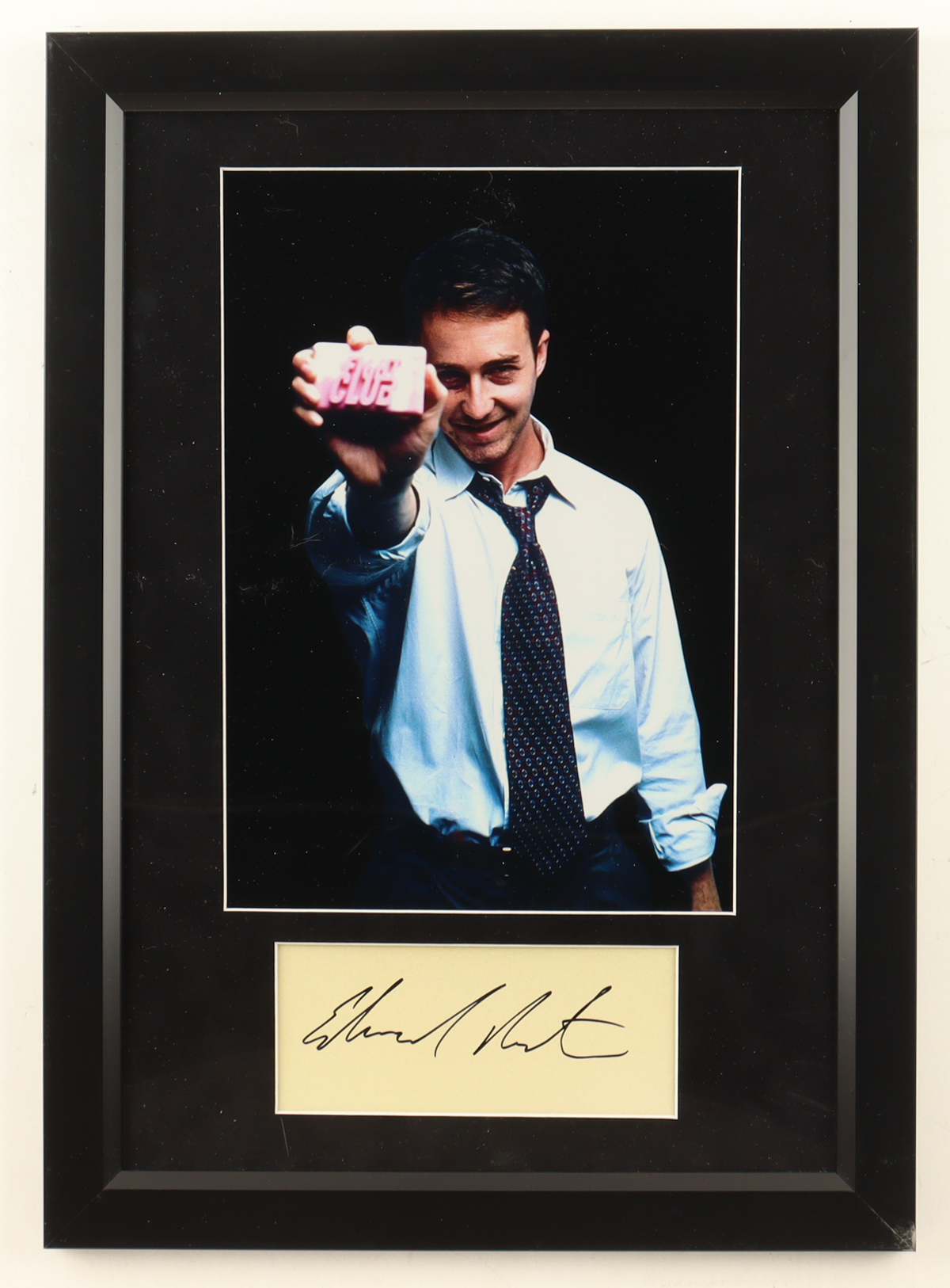 Custom frame measures approximately 15" x 21" in size and features a photo that has been hand-signed by Edward Norton. Please note, there is scuffing on the display.