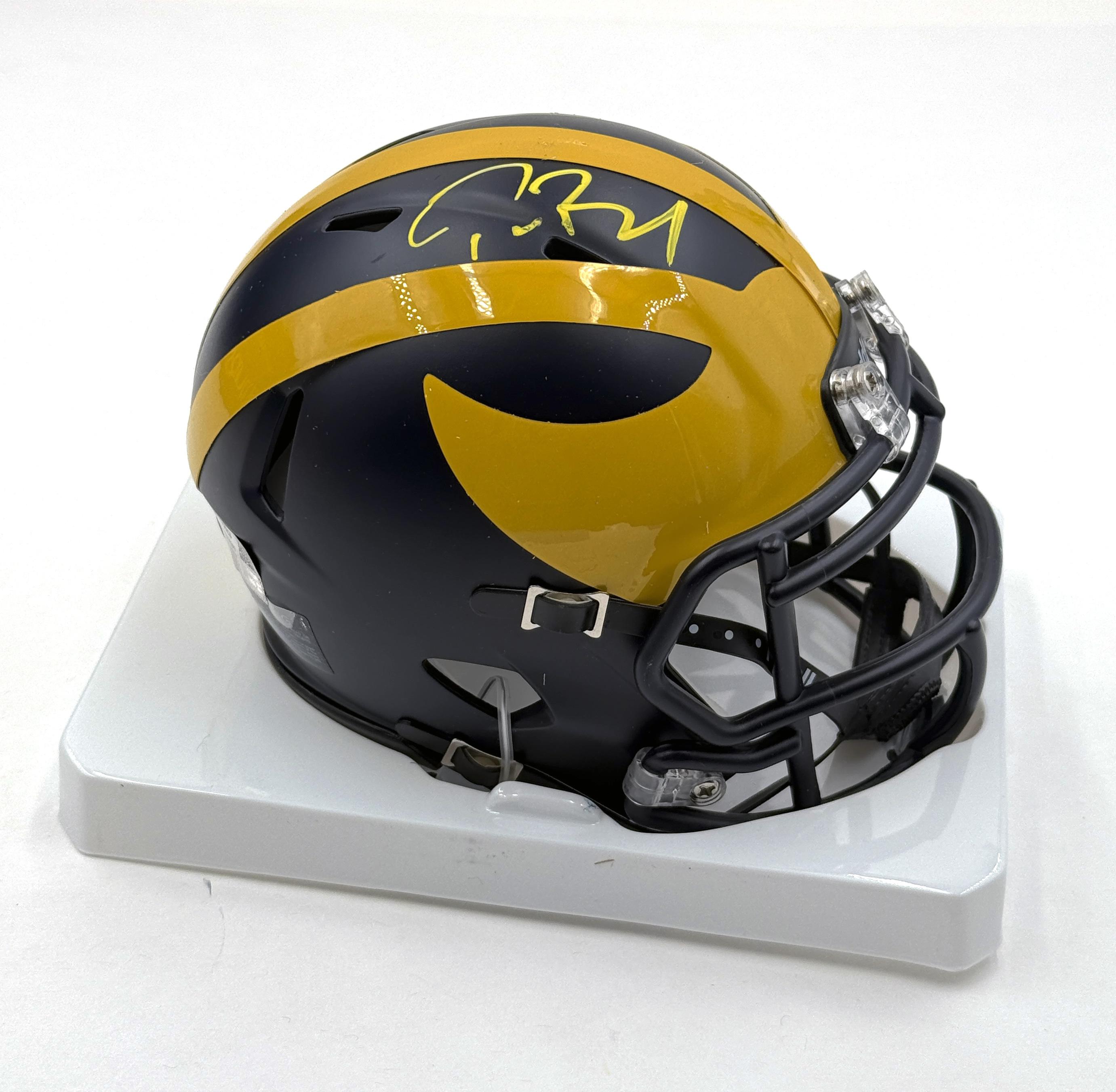 Riddell Michigan Wolverines speed mini helmet has been hand-signed by Tom Brady.