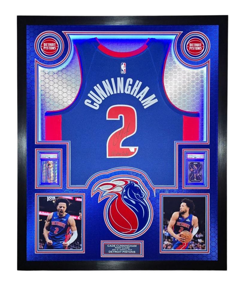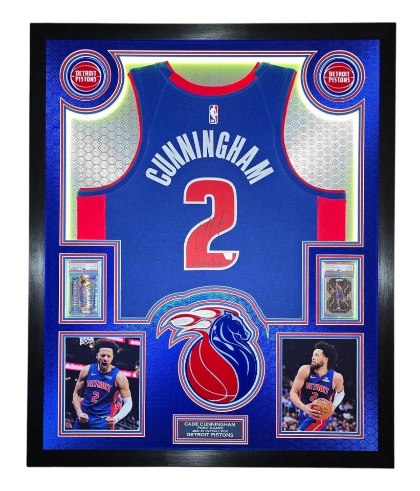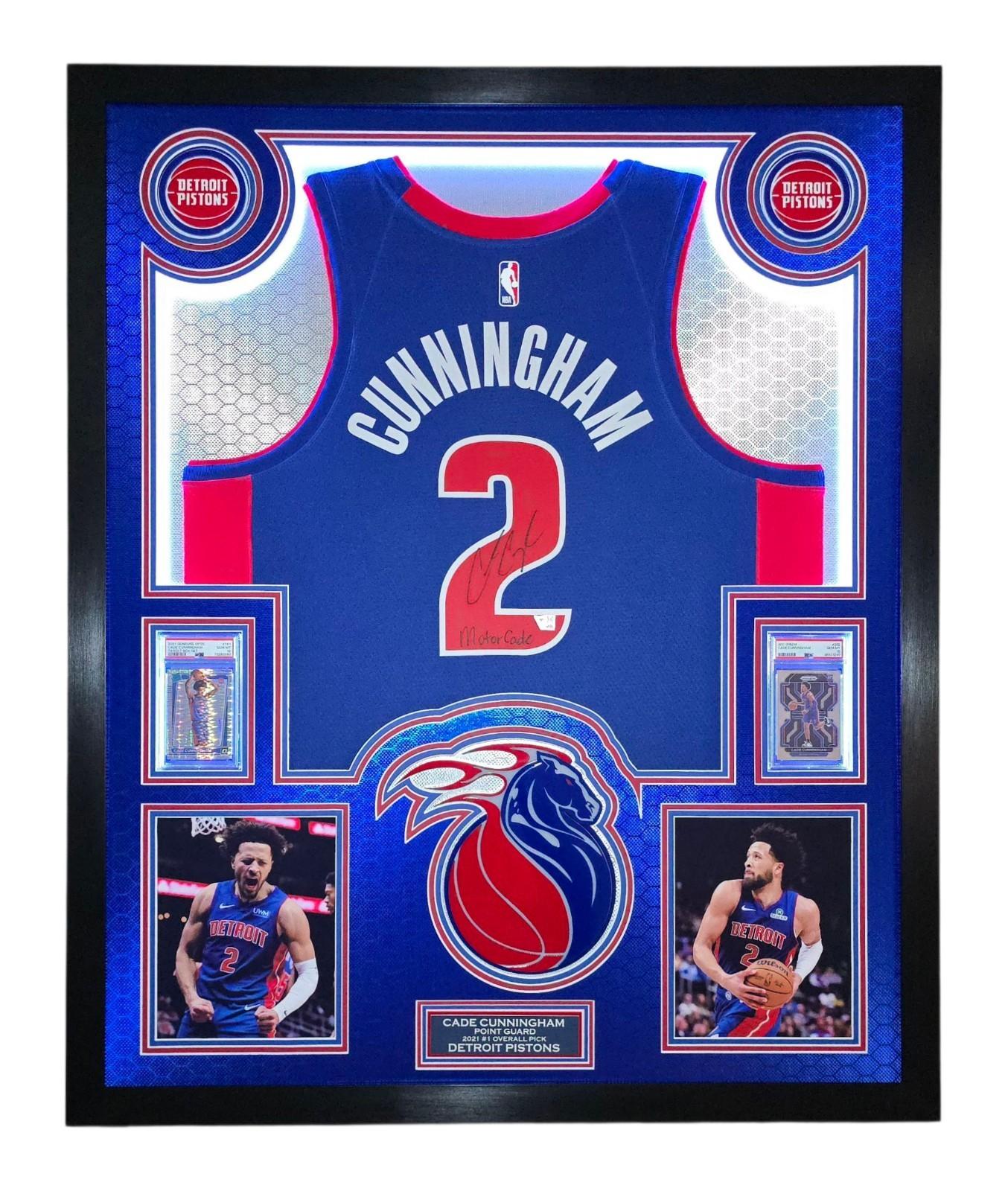 Cade Cunningham Signed Pistons Custom Framed Nike Jersey Inscribed "MotorCade" with LED Display & (2) PSA 10 Graded Rookie Cards (Fanatics)