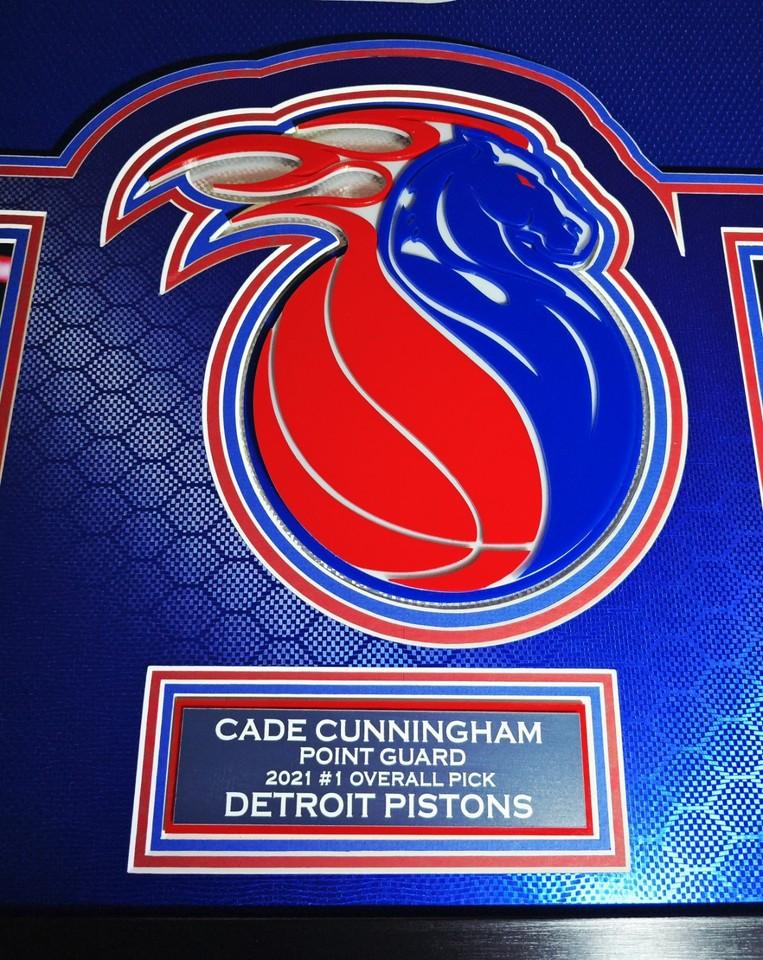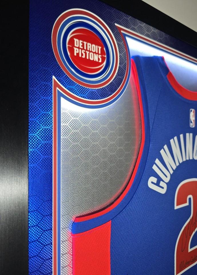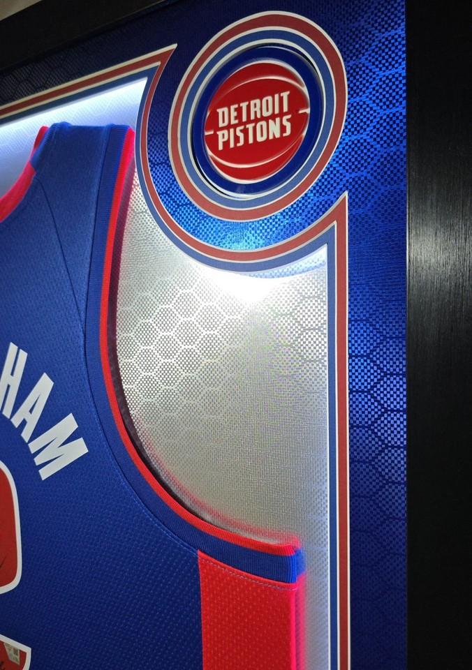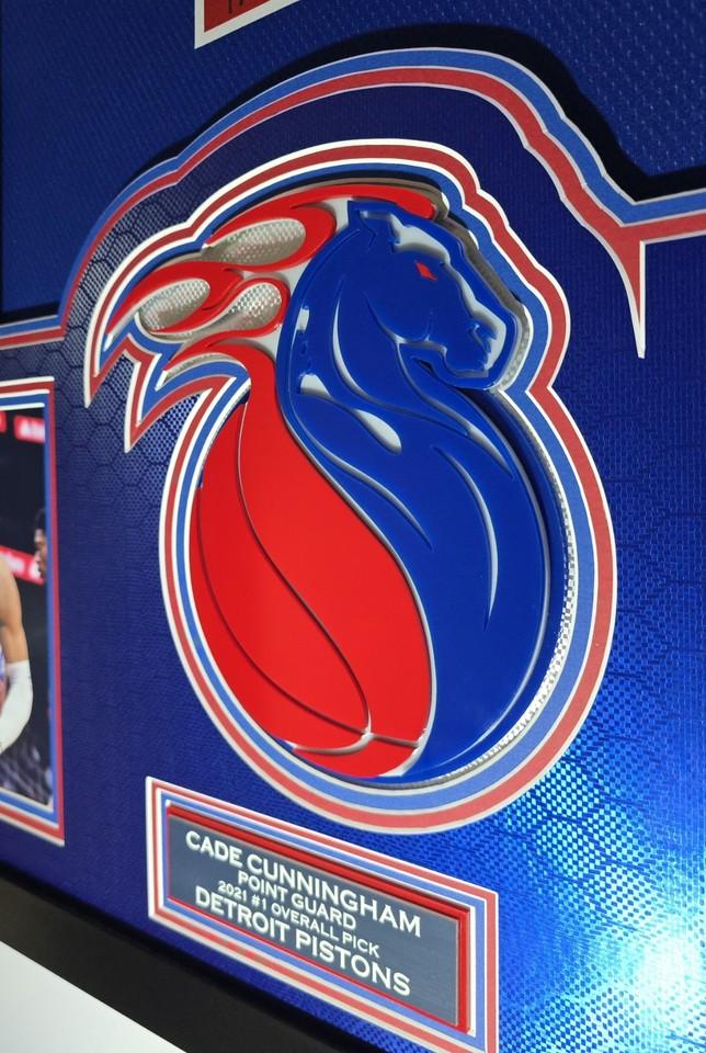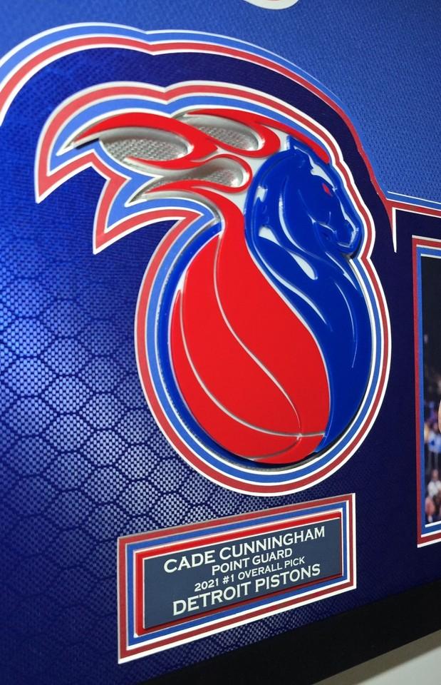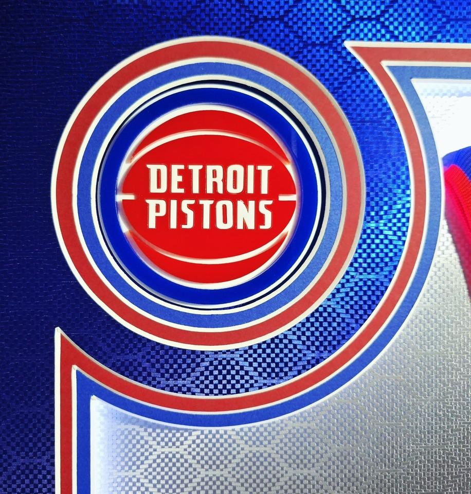 - (2) Detroit Pistons logos (top left & right) are 3D, laser cut, multi-layered & embedded into the matting.