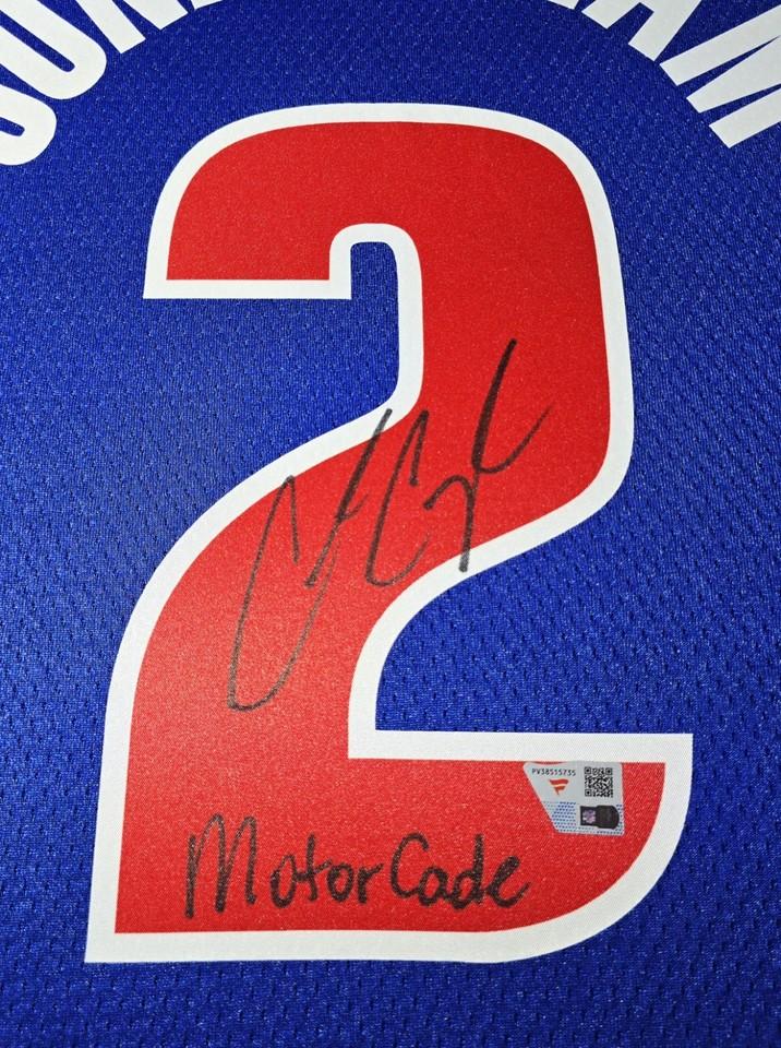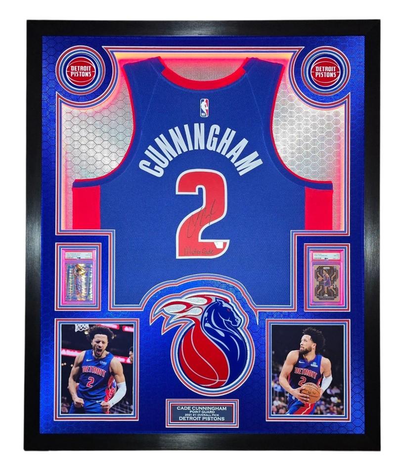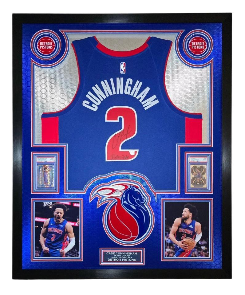 Custom frame measures 42" x 33" in size and features a Nike Swingman jersey that has been hand-signed and inscribed by Cade Cunningham (Detroit Pistons).