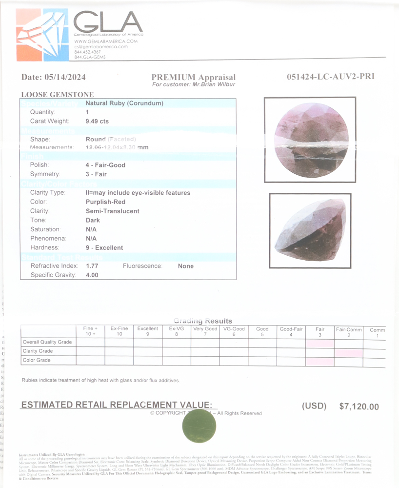 9.49 CTW Ruby Gemstone 12.06mm | Estimated Retail Value $7,120 (GLA)