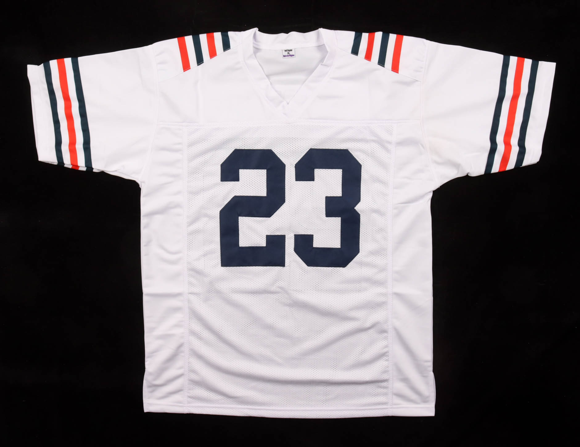 Custom football jersey. Everything sewn on, size XL. Hand-signed by Devin Hester.