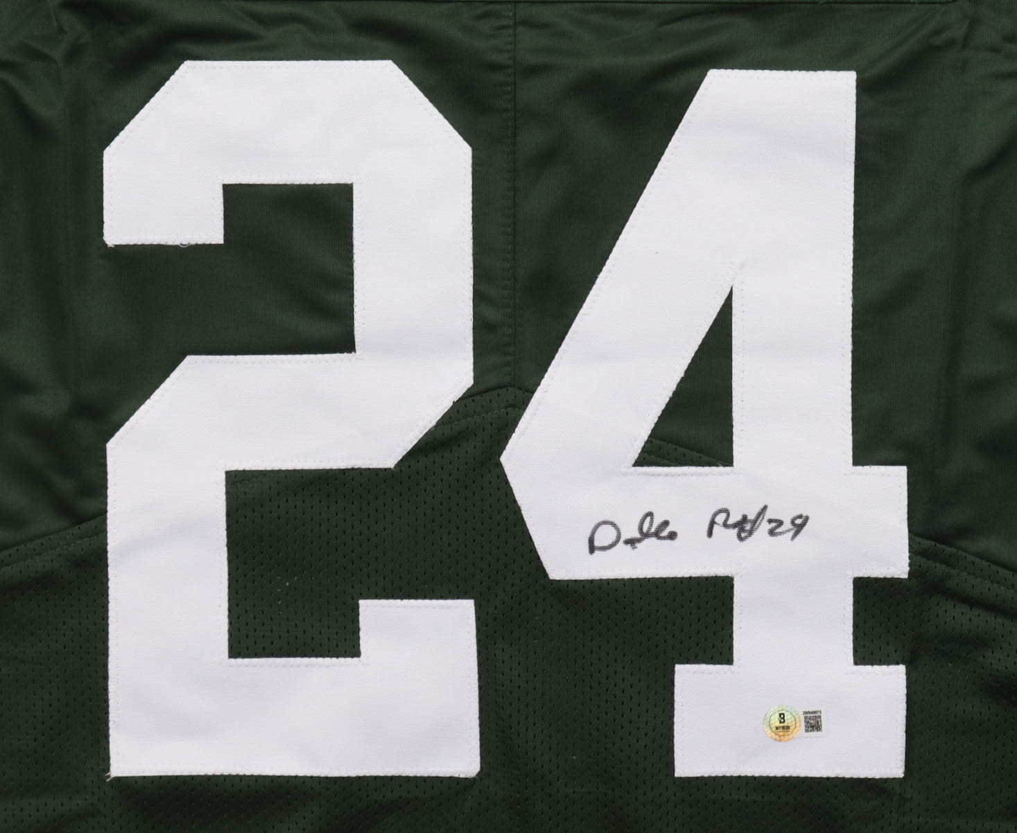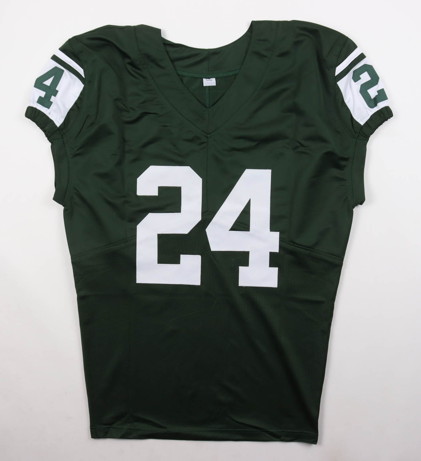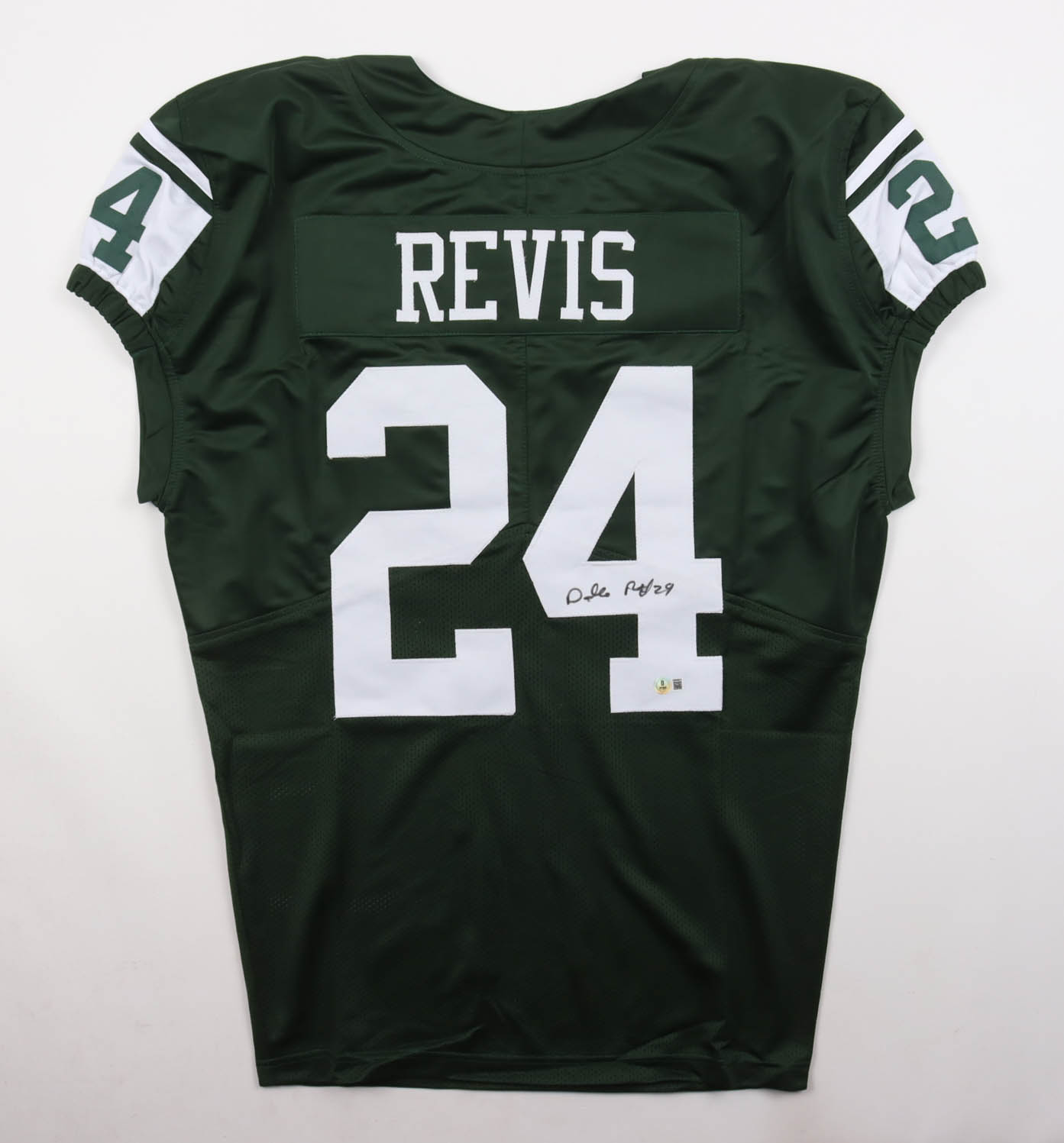 Custom jersey with everything sewn on, size XL. Hand-signed by Darrelle Revis (HOF).