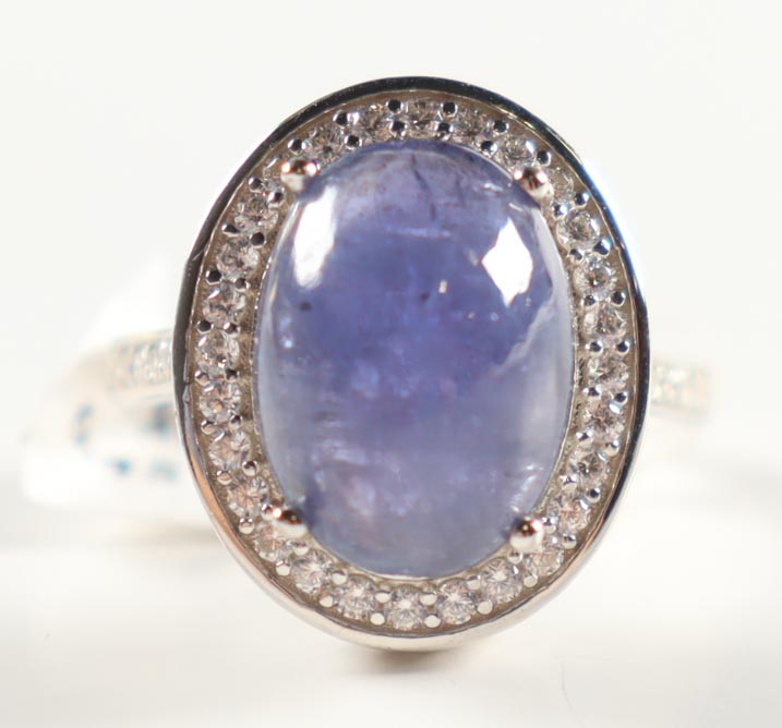Ladies Fashion Tanzanite & Zircon Ring. Ring Is Made Of Rhodium Over Sterling Silver. Weighs 6.45 Grams. Ring Size 5 3/4. Details