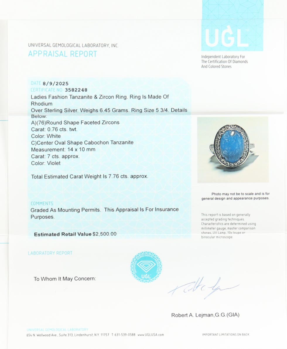 New 7.76 CTW Tanzanite & Zircon Ring | Estimated Retail Value: $2,550 (UGL)