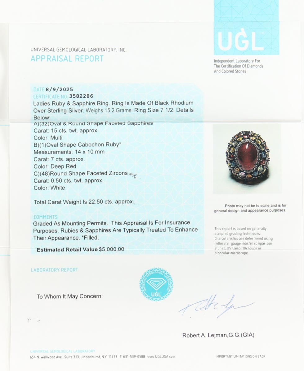 New 22.5 CTW Sapphire, Ruby & Zircon Ring | Estimated Retail Value: $5,000 (UGL)