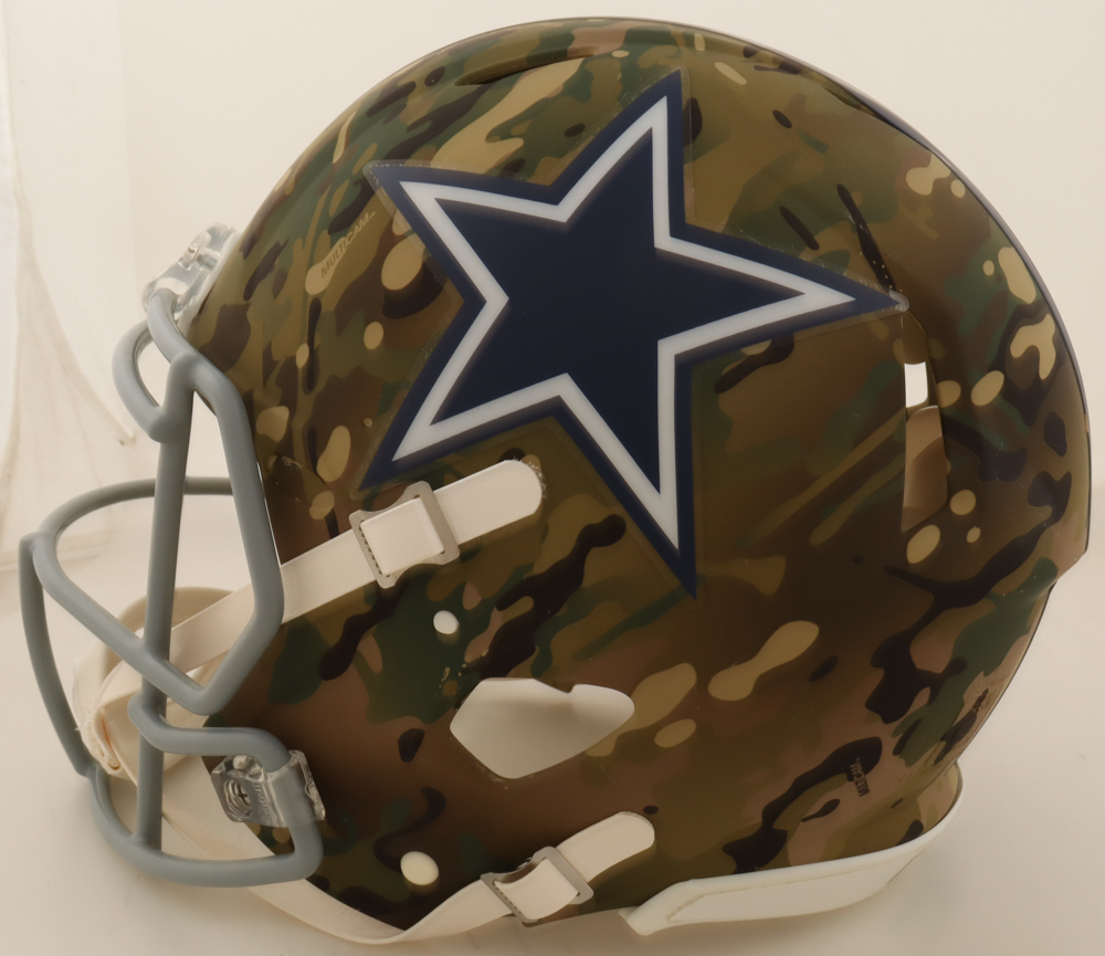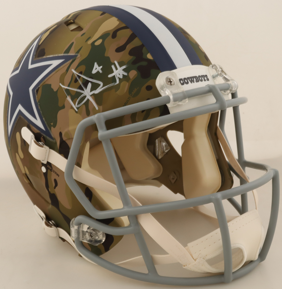 Riddell Dallas Cowboys full-size authentic on-field camo alternate speed helmet. Hand-signed by Dak Prescott.