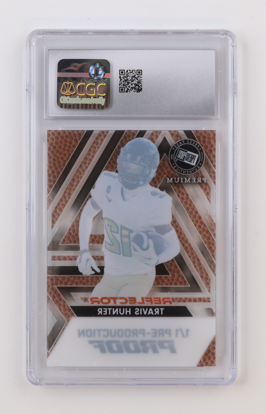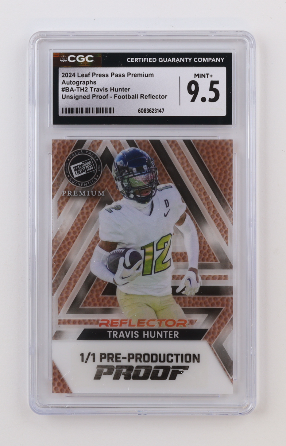 Travis Hunter 2024 Leaf Press Pass Premium Unsigned Proof Football Reflector Autographs Pre Production Proof #BA-TH2 RC #1/1 (CGC 9.5)