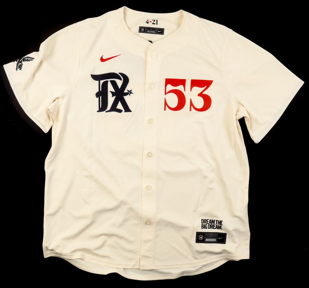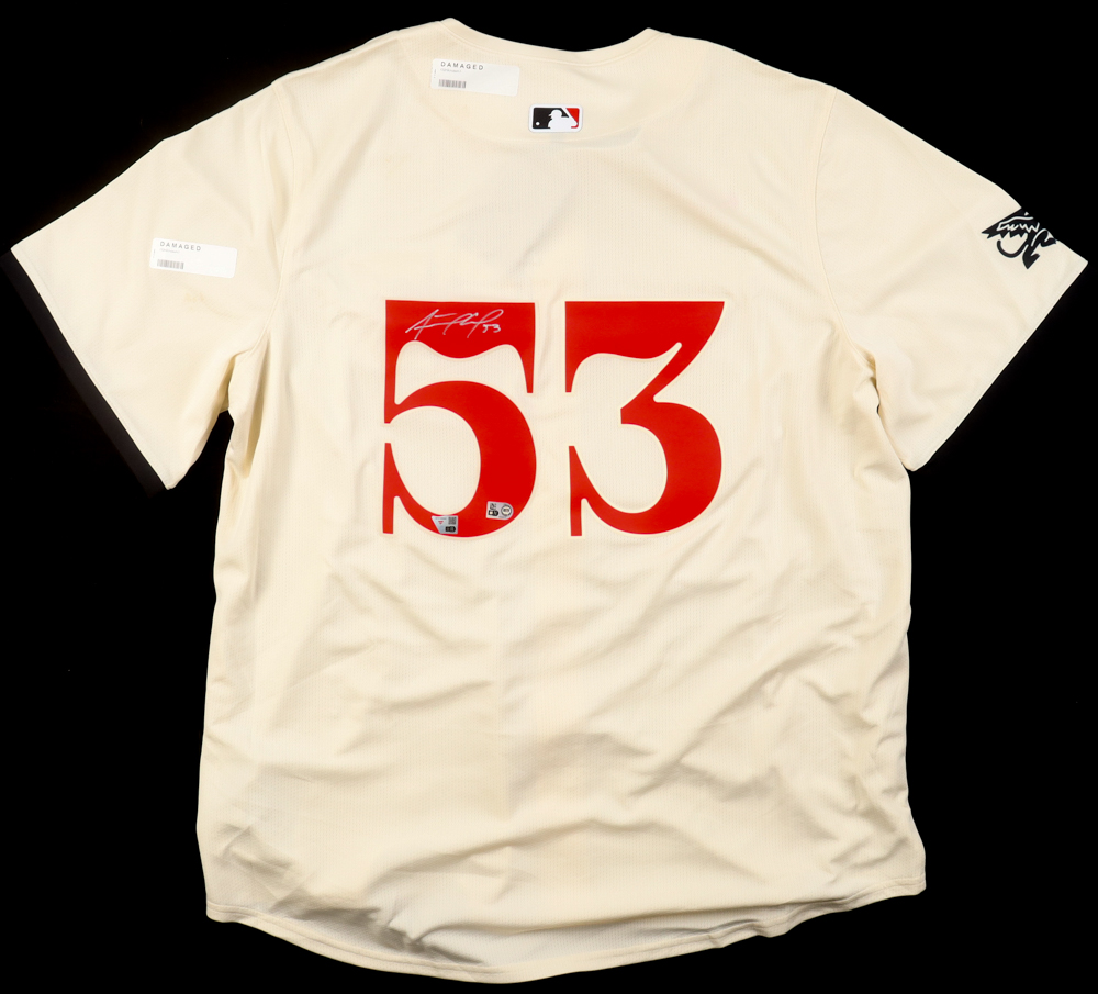 Nike City Connect jersey with everything pressed on, size XL. Hand-signed by Adolis Garcia (Texas Rangers). Please note, there are stains throughout the jersey.
