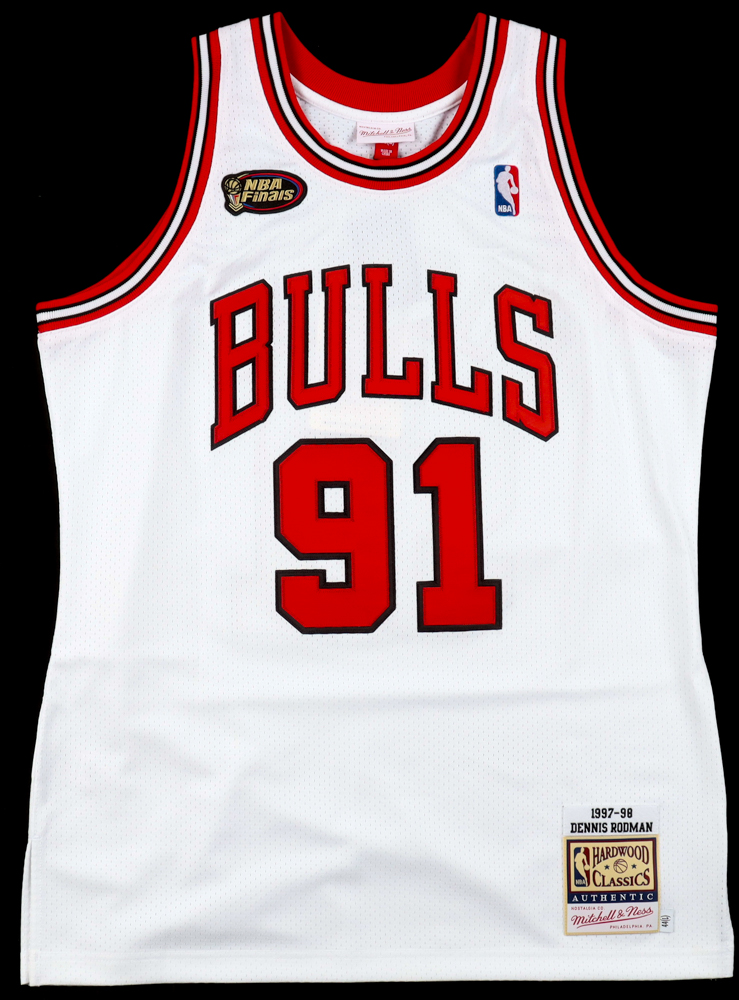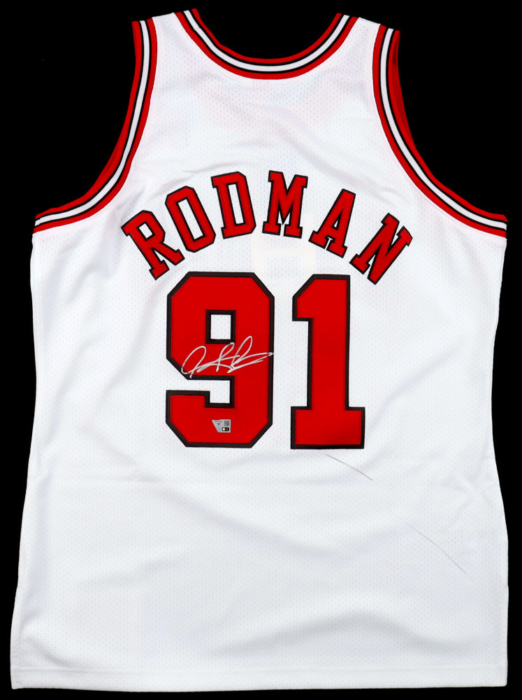 Mitchell & Ness jersey with everything sewn on, size L. Hand-signed by Dennis Rodman (Chicago Bulls, HOF). Please note, there are stray ink marks on the back of the jersey.