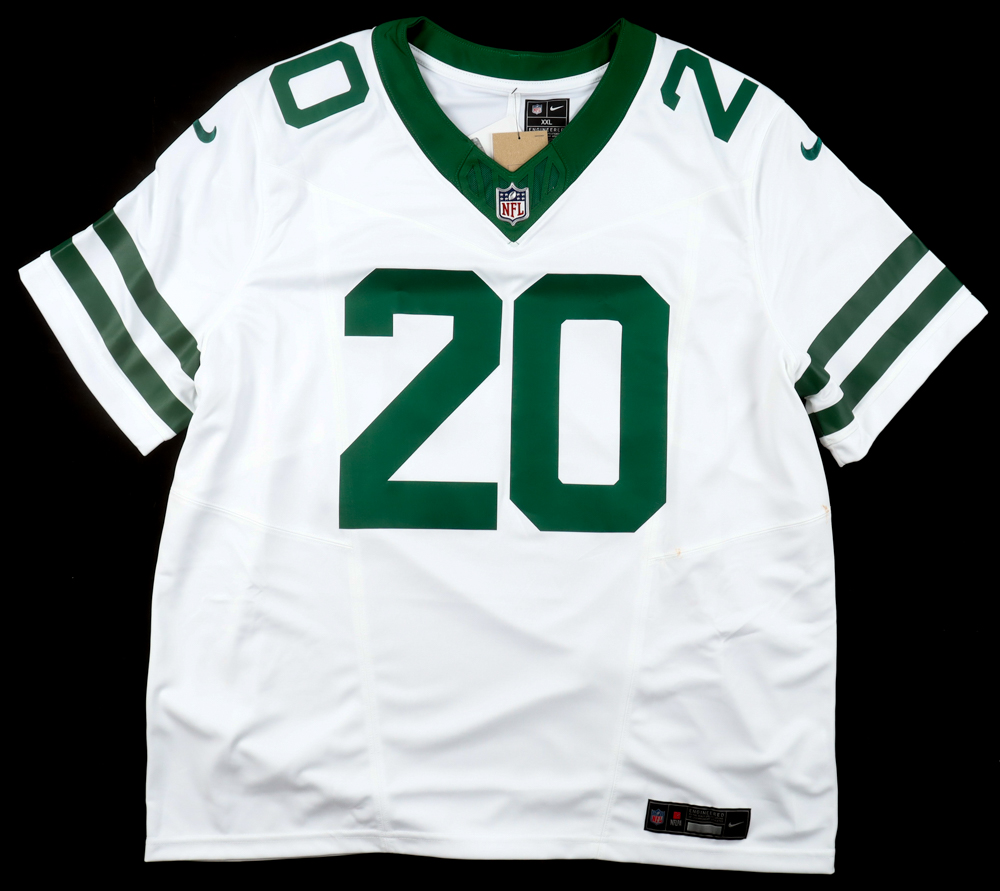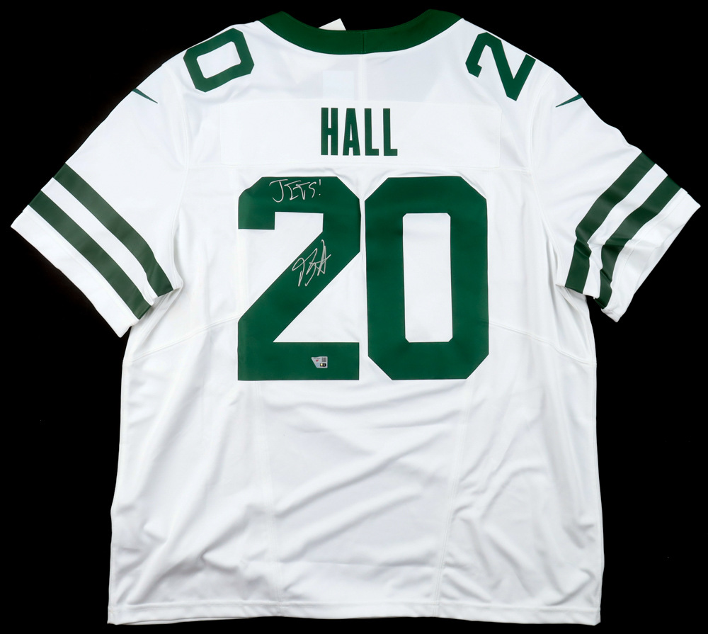 Nike jersey with everything pressed on, size XXL. Hand-signed and inscribed by Breece Hall (New York Jets). Please note, there are stains throughout the jersey.