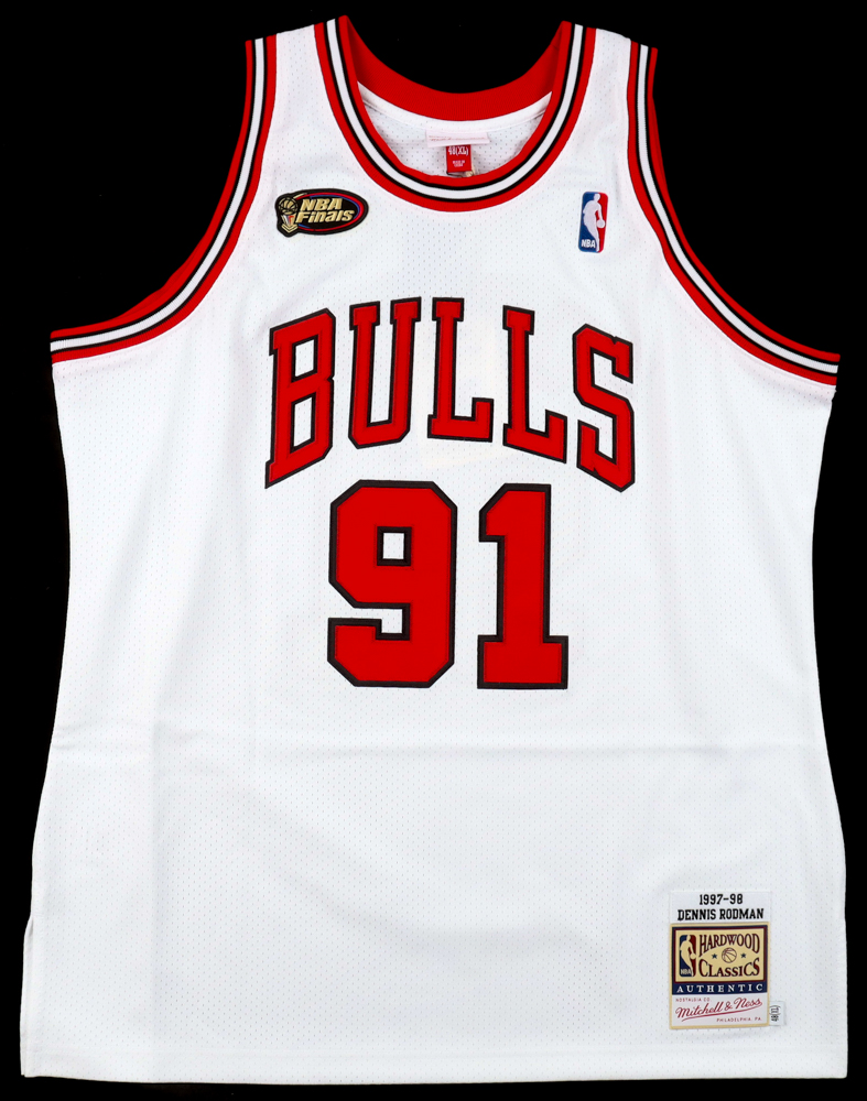 Mitchell & Ness jersey with everything sewn on, size L. Hand-signed by Dennis Rodman (Chicago Bulls, HOF). Please note, there is a stray ink mark on the back of the jersey.