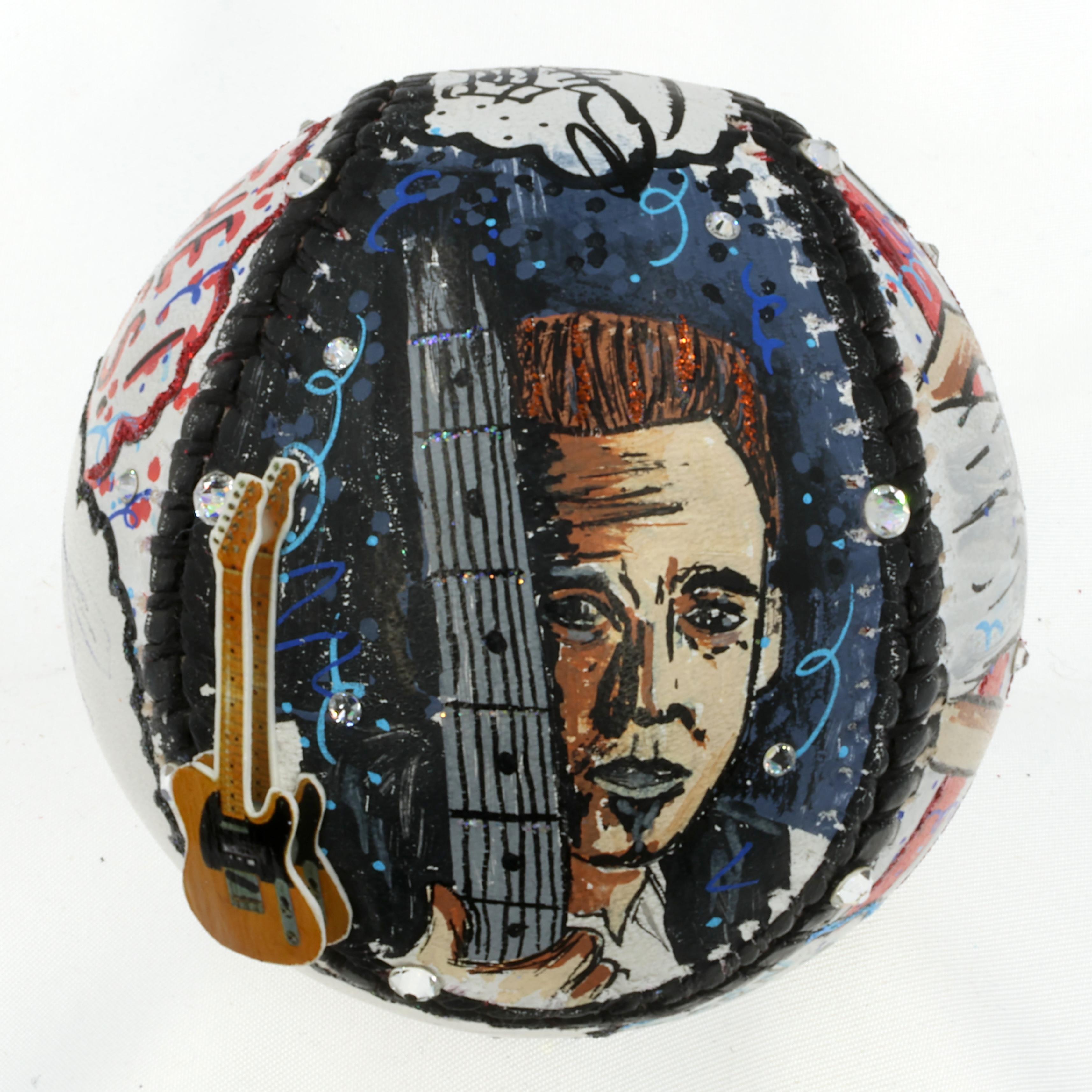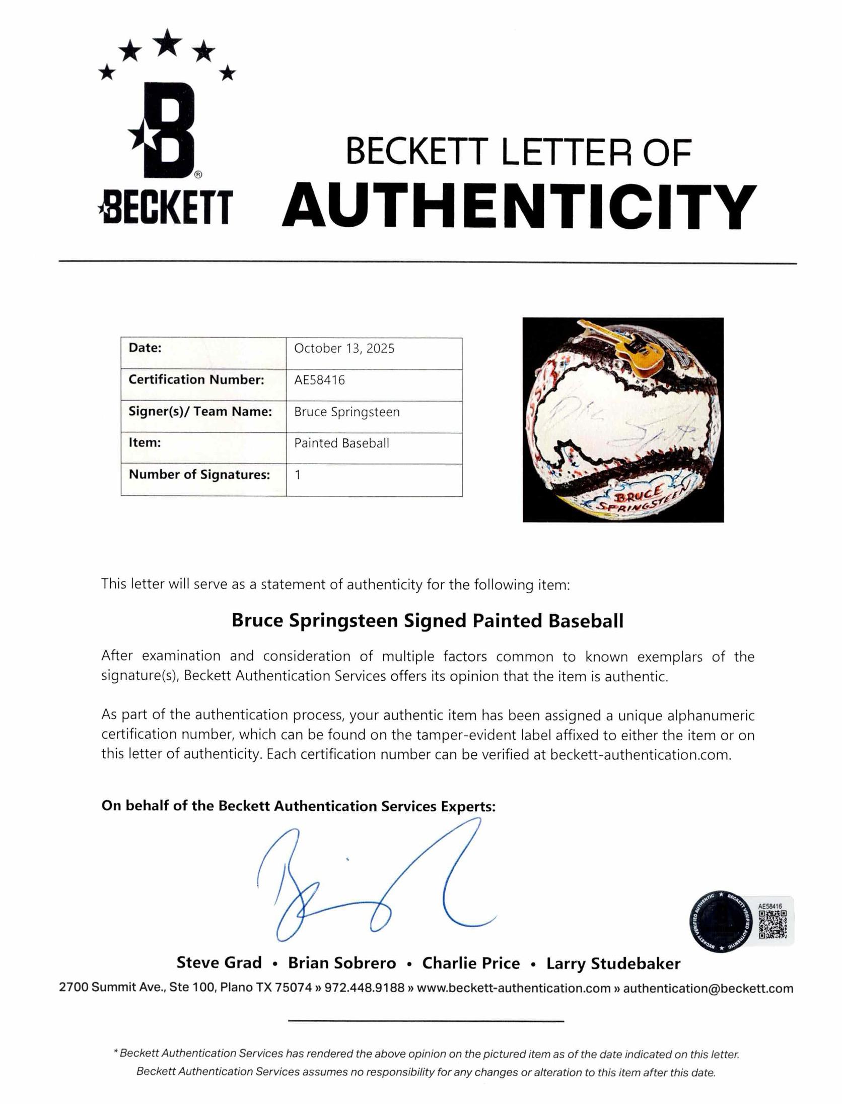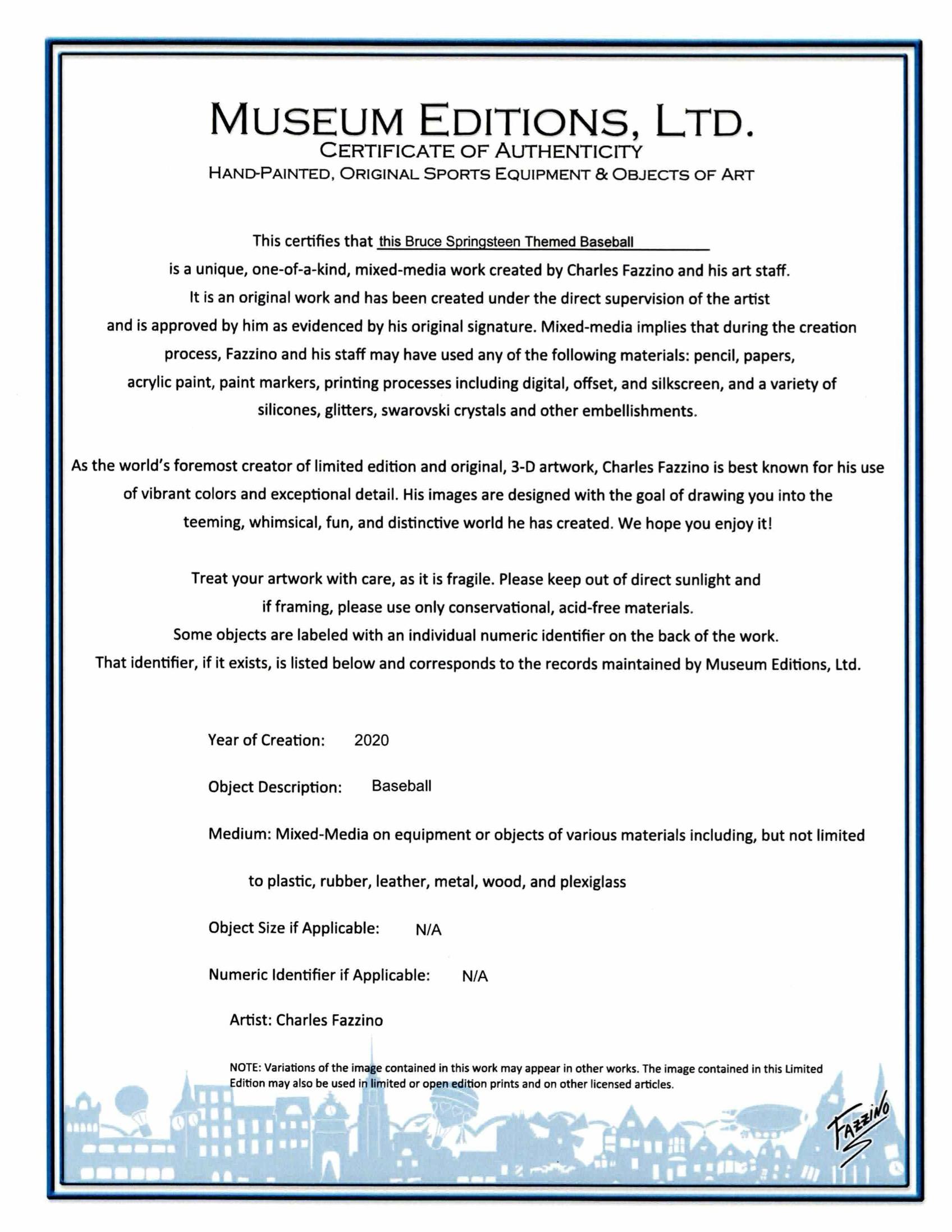 3-D Pop Art Commemorative baseball has been hand-signed by Bruce Springsteen. The baseball includes original art and has been hand-signed by renowned pop artist, Charles Fazzino.