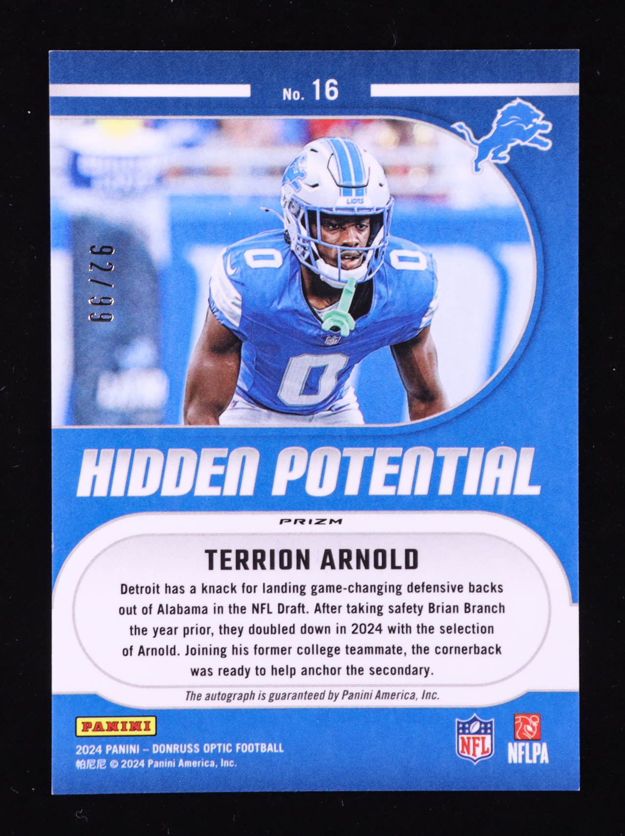 Terrion Arnold 2024 Donruss Optic Hidden Potential Autographs #16 #92/99 RC